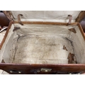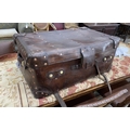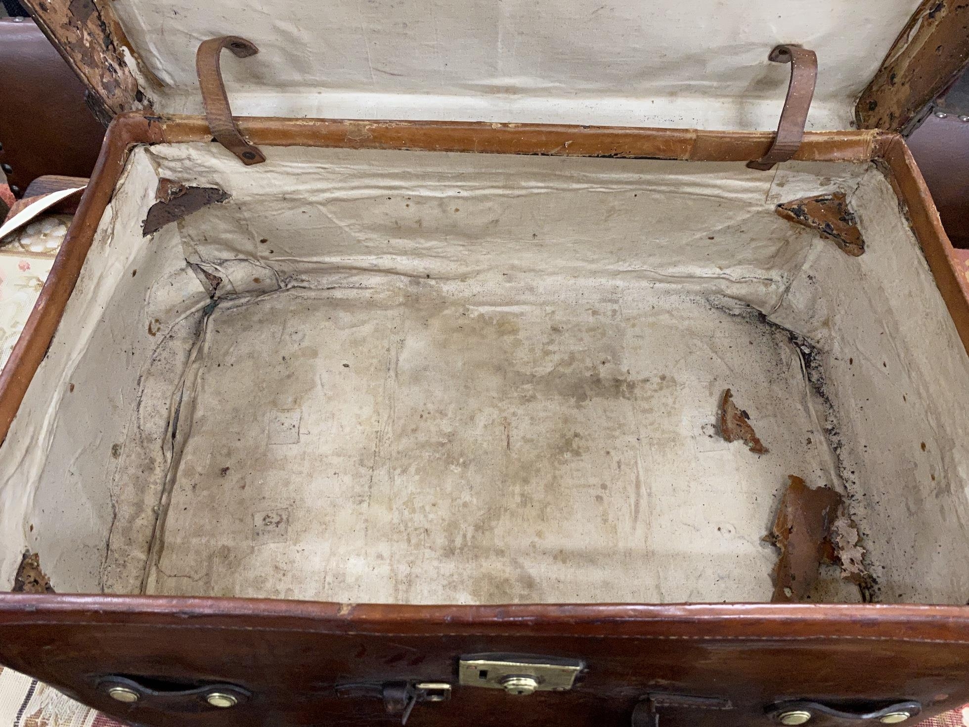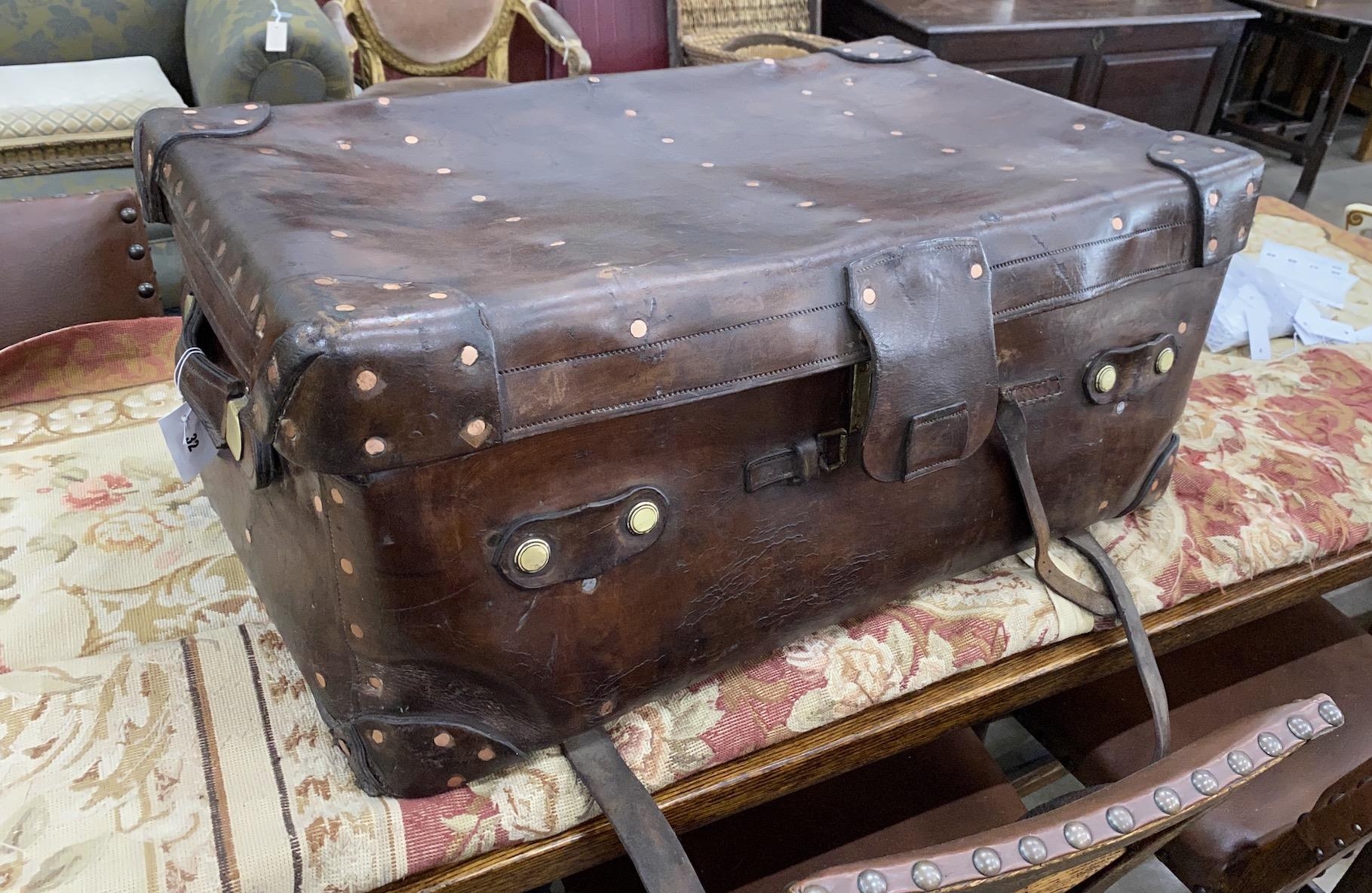 A Victorian leather brass and copper studded travelling trunk, width 89cm, depth 53cm, height 37cm
