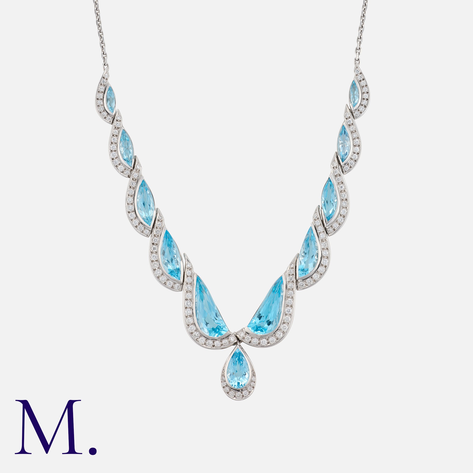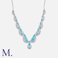 A Topaz And Diamond Necklace in 18k white gold, set with a series of mixed cut topaz and diamond set links, suspending a pear shaped mixed cut topaz drop. Diamonds totalling approximately 2.50ct. Hallmarked for 18 carat gold, London 1990.