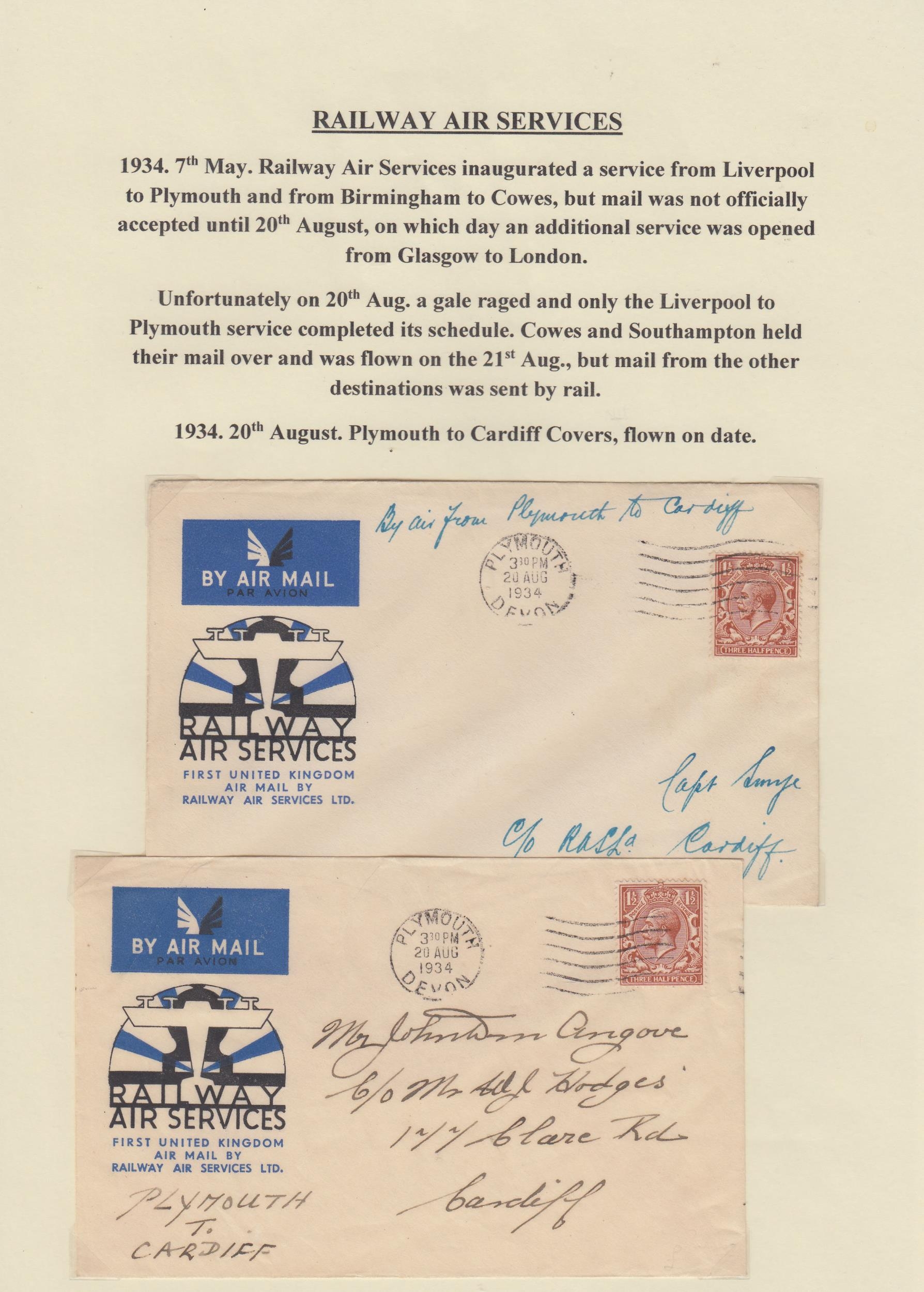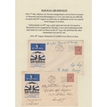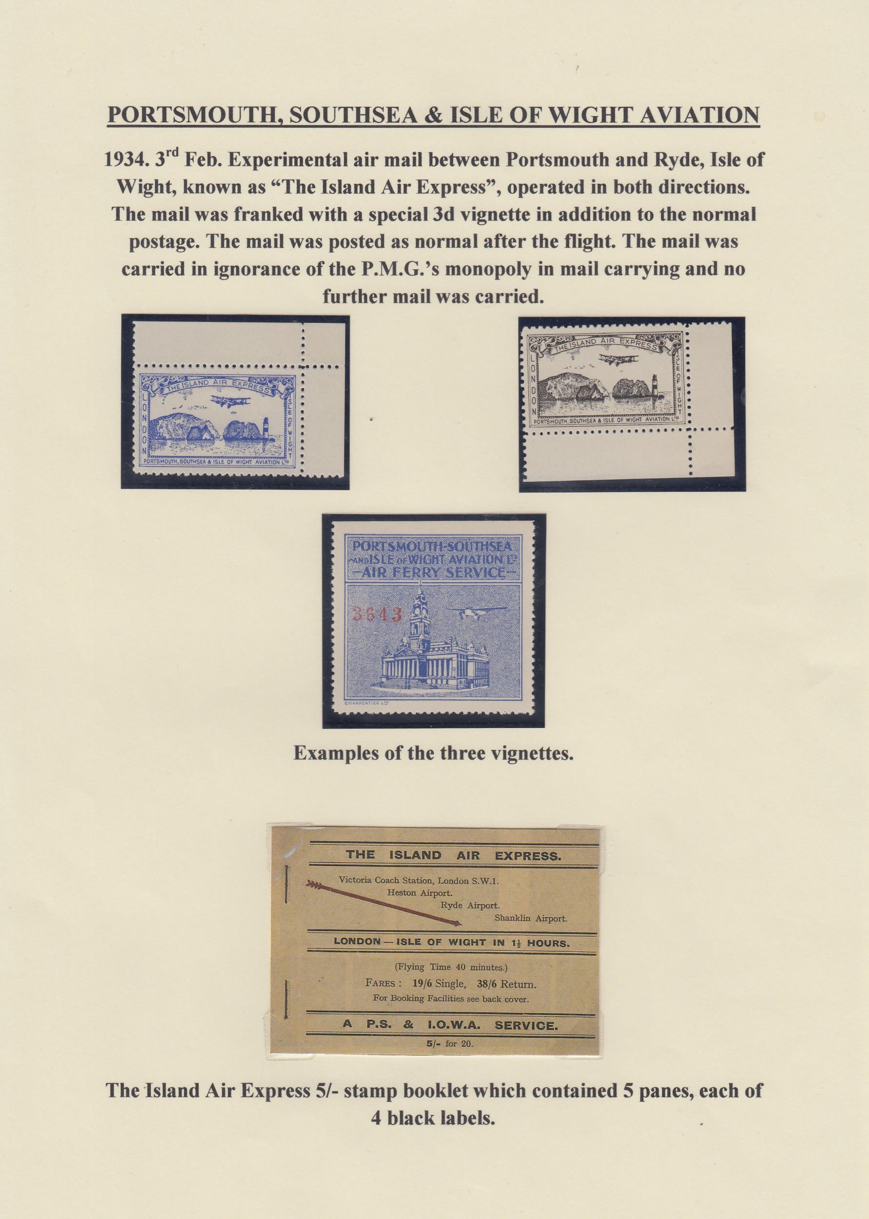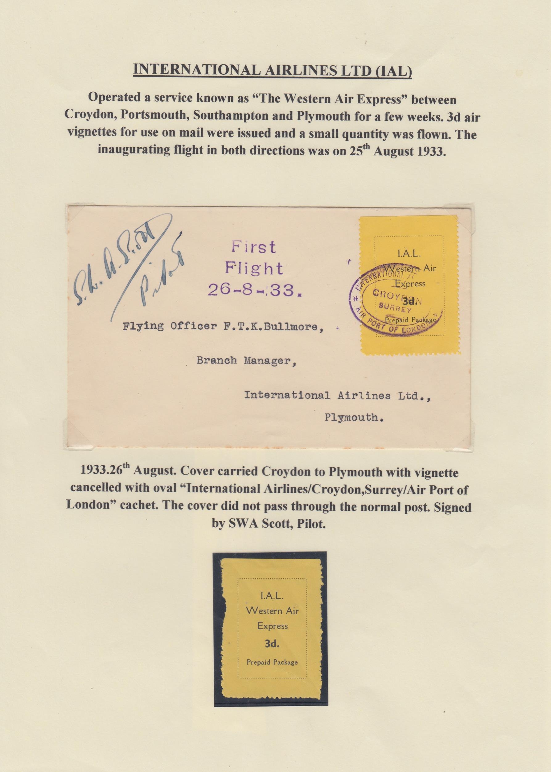 A collection on British Inland Commercial Air Mails from the 1930s on album pages, including GWR, International Airlines, Provincial Airways, Highland Airways, Hillman Airways, Atlantic Coast Air Services, Railway Air Services and Allied Airways, with covers including Pilot signed covers, photos, postcards, original time tables and vignettes. Noted GWR inaugurated daily service to Cardiff illustrated cover with vignette, 1933 IAL First Flight cover with vignette and pilot signed, Provincial Airways covers including pilot signed and vignettes, RAS first flight to Lisbon cover with vignette, Royal Air Services South Coast Service timetables, BCA 1936 Daily Air Service time table and North Eastern Airways vignettes first and second printings.