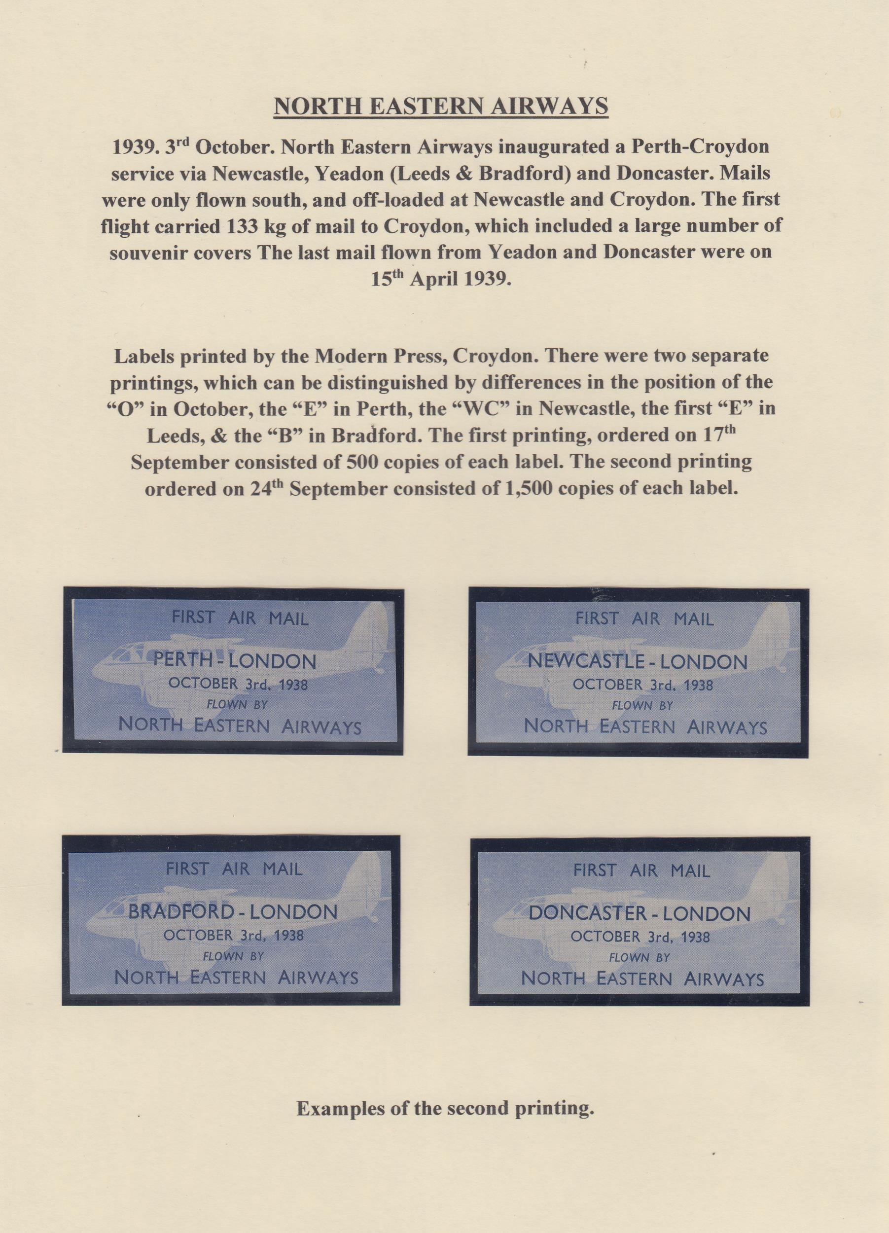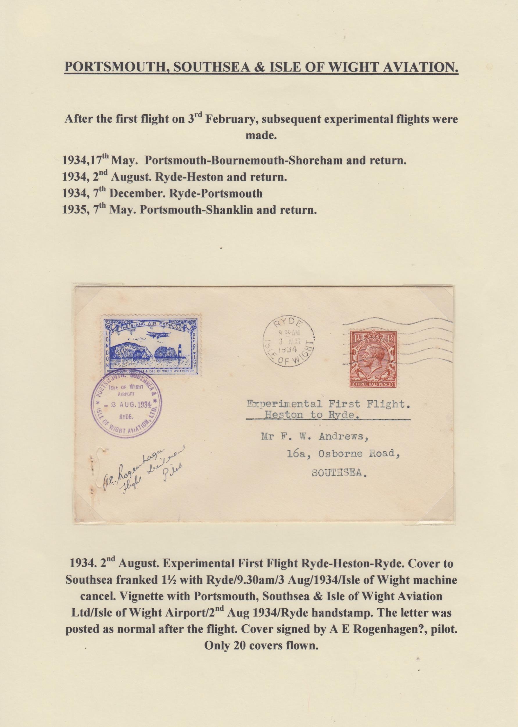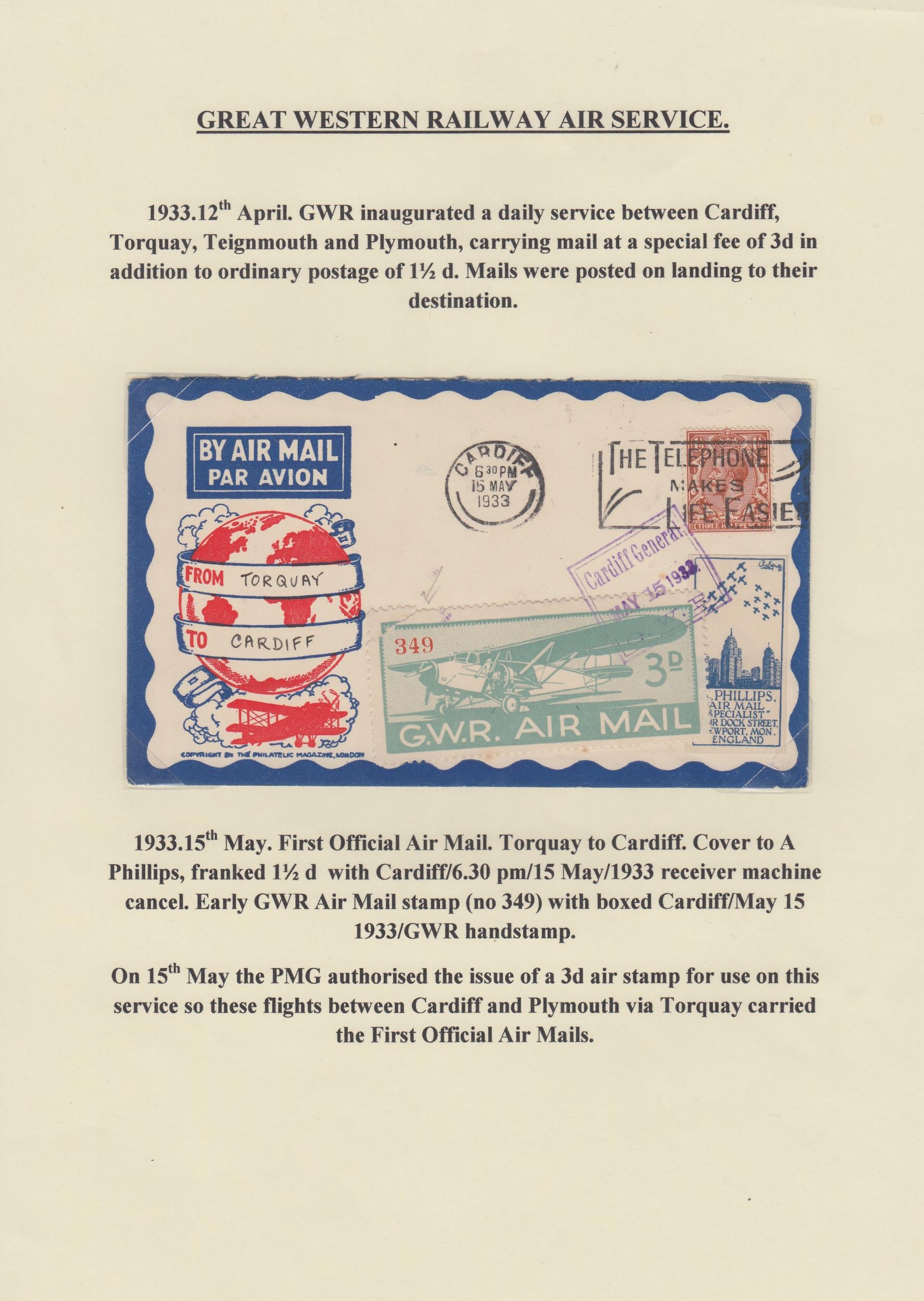 A collection on British Inland Commercial Air Mails from the 1930s on album pages, including GWR, International Airlines, Provincial Airways, Highland Airways, Hillman Airways, Atlantic Coast Air Services, Railway Air Services and Allied Airways, with covers including Pilot signed covers, photos, postcards, original time tables and vignettes. Noted GWR inaugurated daily service to Cardiff illustrated cover with vignette, 1933 IAL First Flight cover with vignette and pilot signed, Provincial Airways covers including pilot signed and vignettes, RAS first flight to Lisbon cover with vignette, Royal Air Services South Coast Service timetables, BCA 1936 Daily Air Service time table and North Eastern Airways vignettes first and second printings.