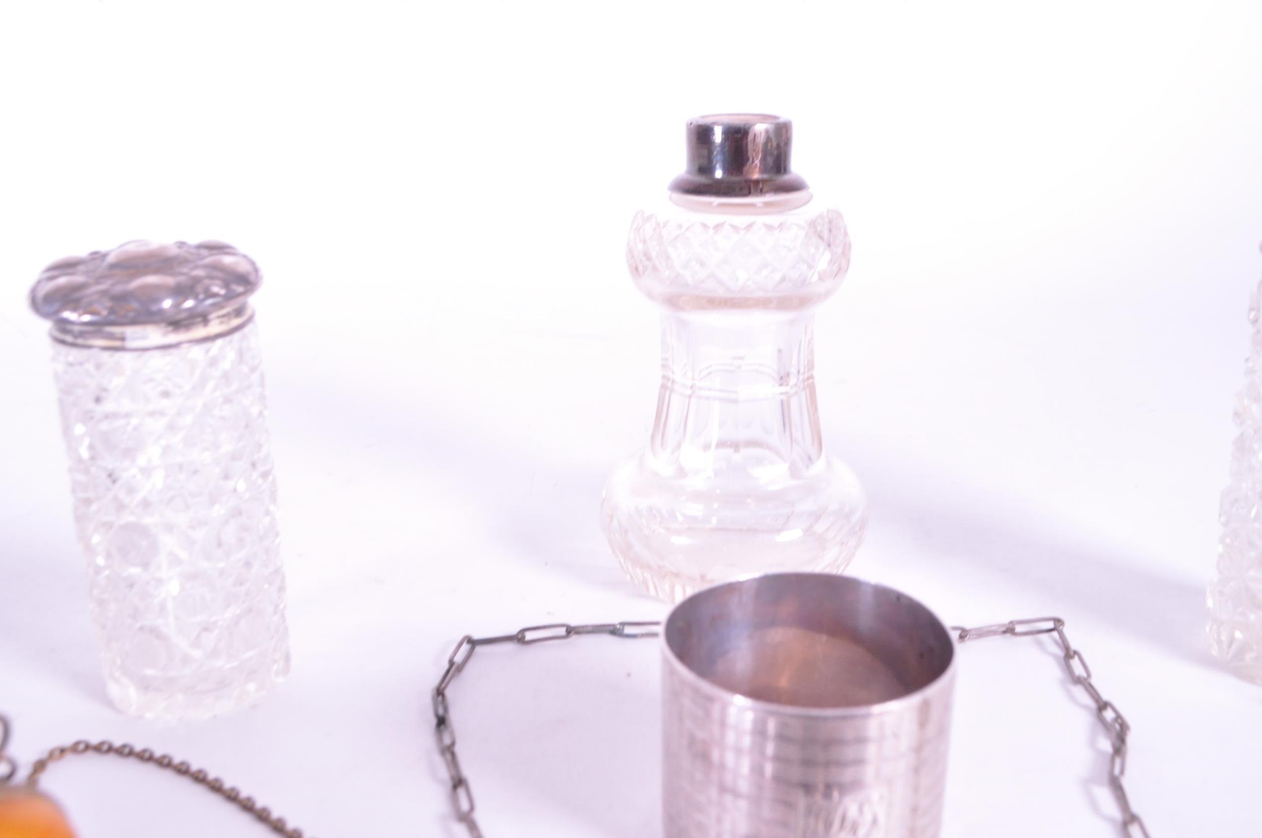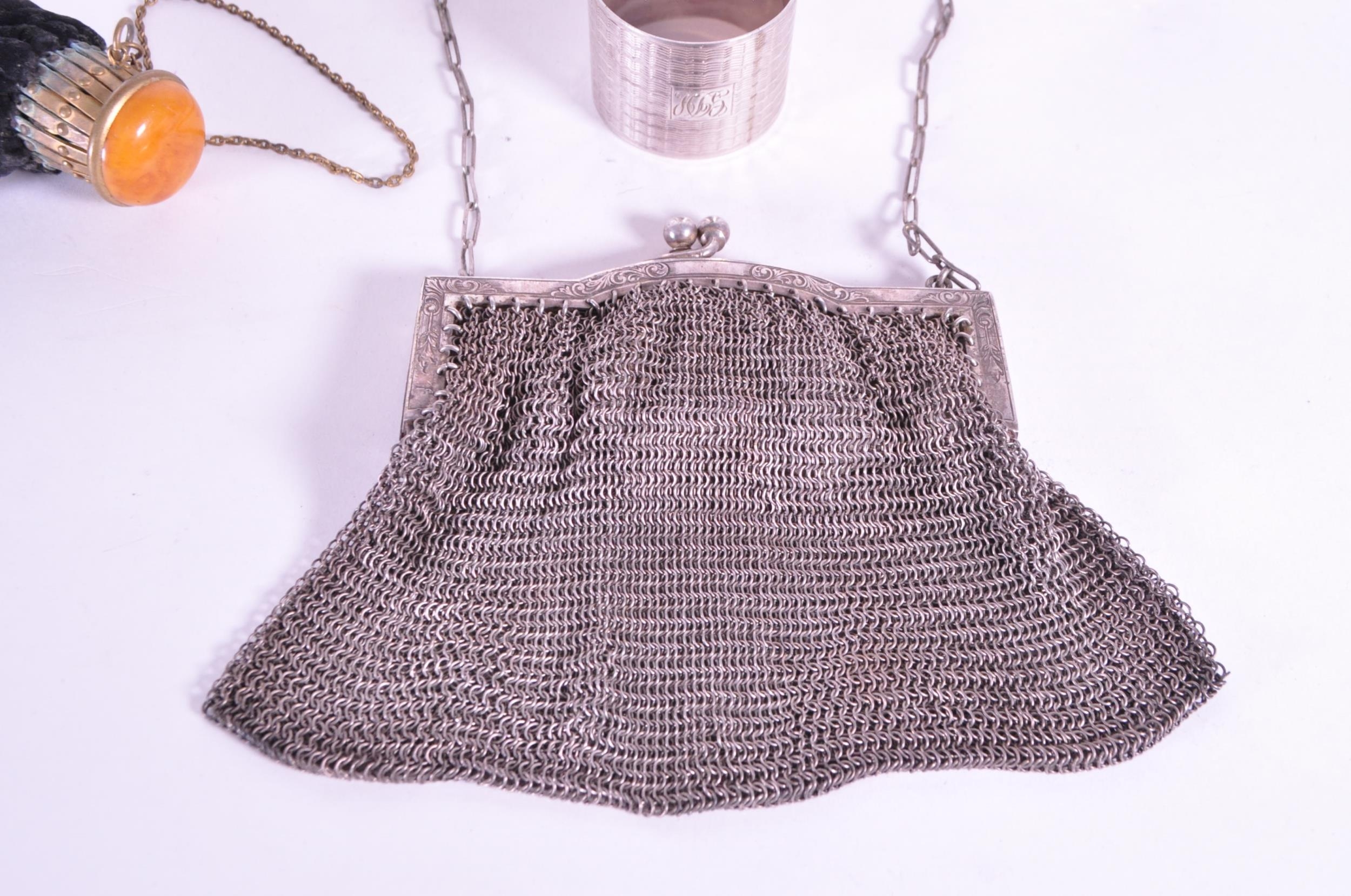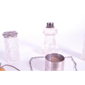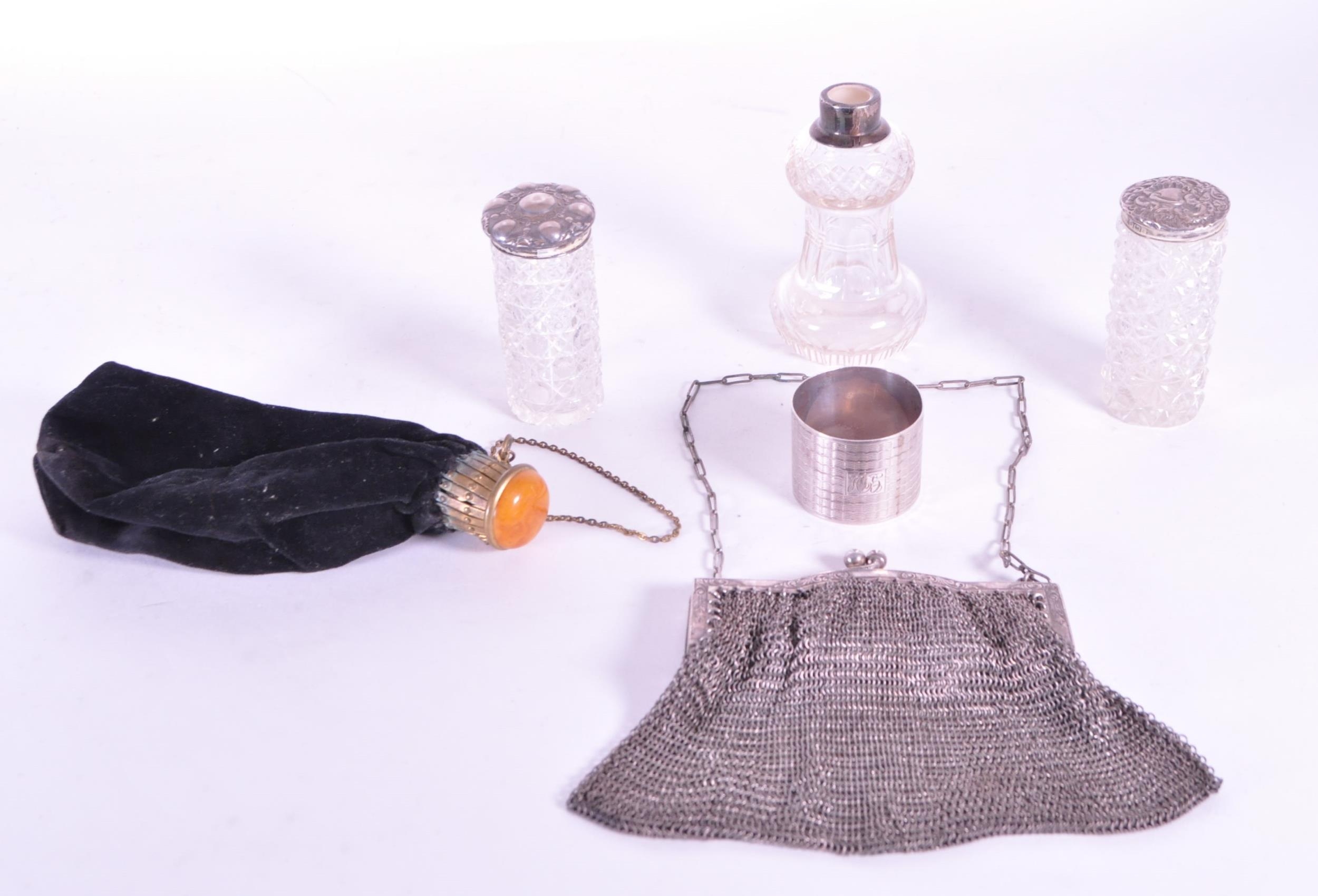 Collection of early 20th century hallmarked silver pieces, comprised of a napkin ring, chain clutch purse, fabric clutch purse, crystal cut lidded pots, and sugar sifter. Napkin ring with a E J Houlston, Birmingham hallmark, others with Birmingham hallmarks, one with a Chester hallmark and the clutch purses with no hallmarks. Largest piece measuring approx. 11cm x 14cm.