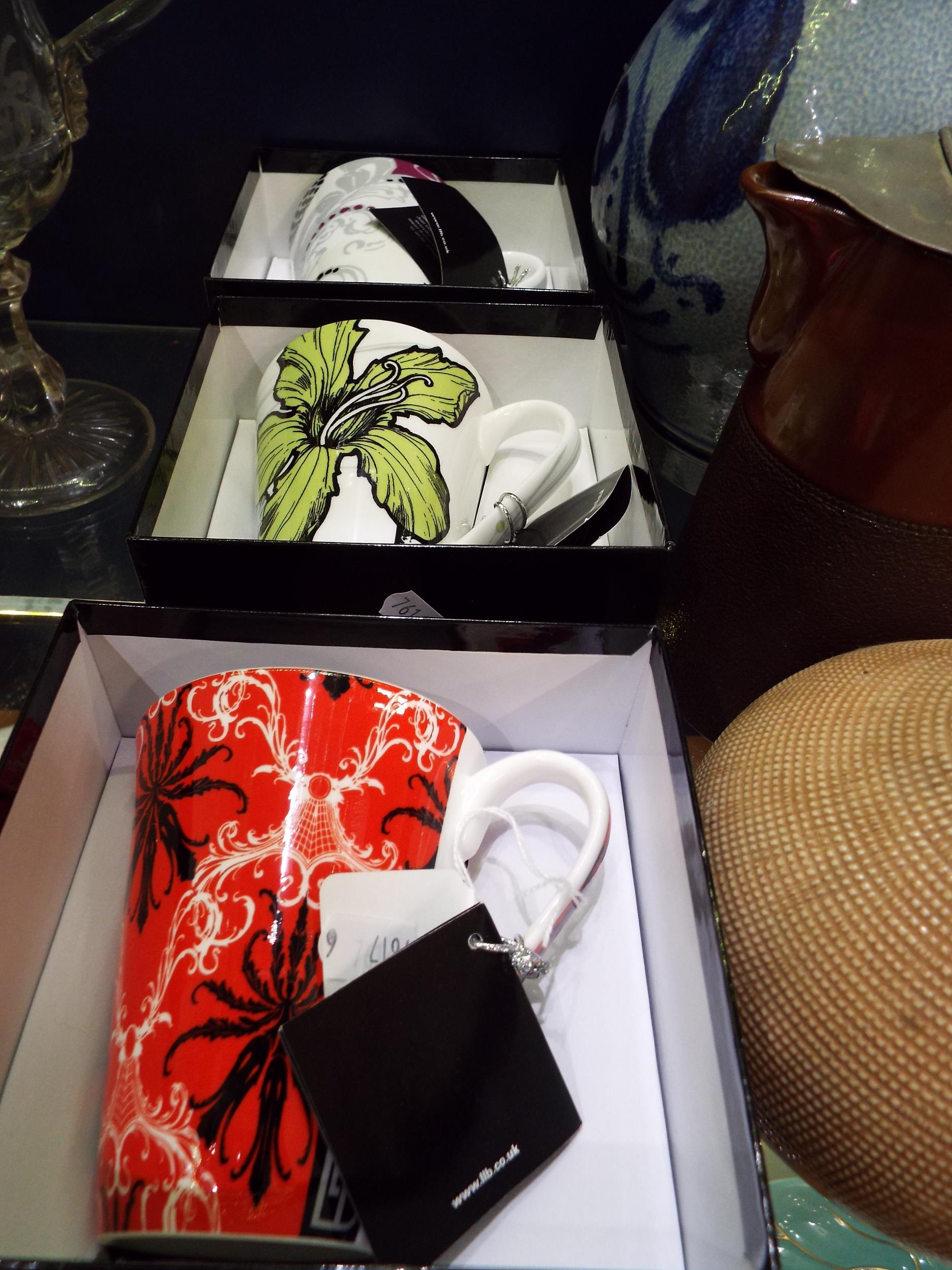 Three boxed Royal Worcester Llewelyn-Bowen mugs 'BEBE', 'Burlesque' and 'Creole'