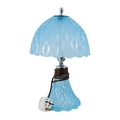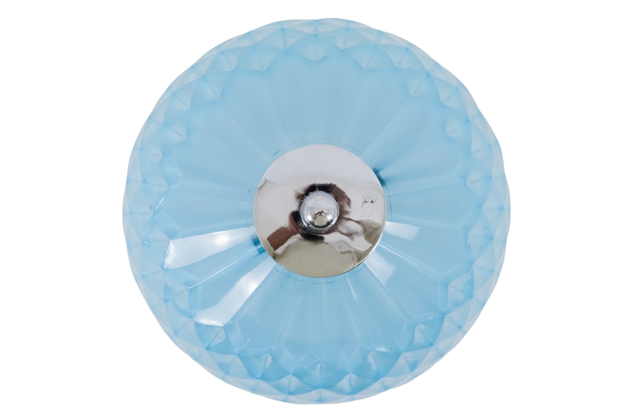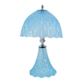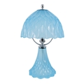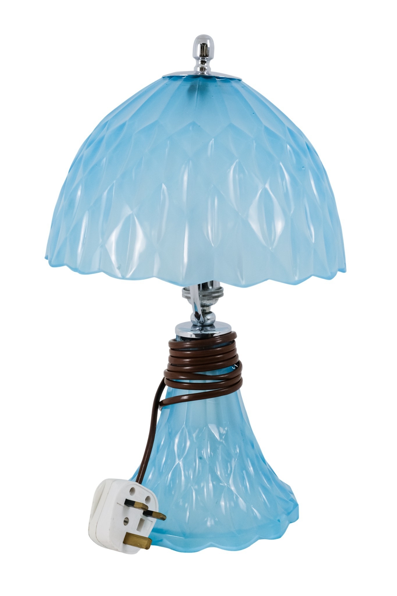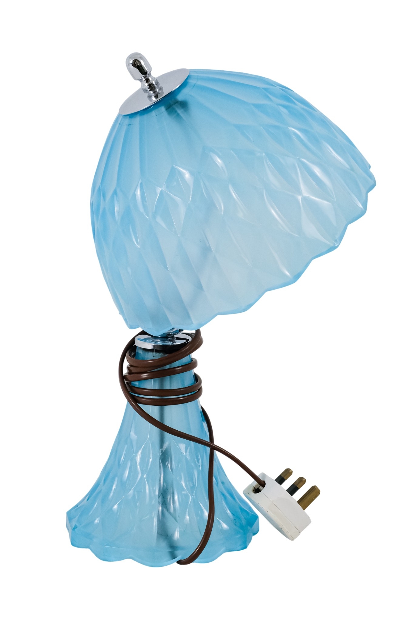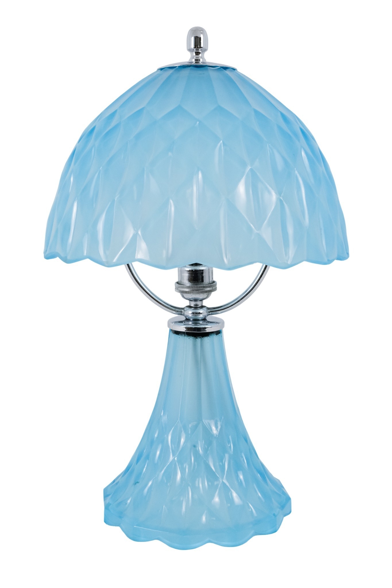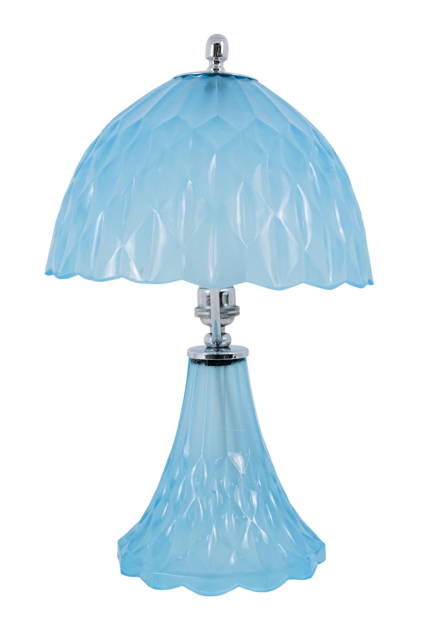 An early 20th century sky blue pressed glass table lamp - possibly French, the domed shade and conical base cast with triangular facets and chrome fittings, 36cm high.