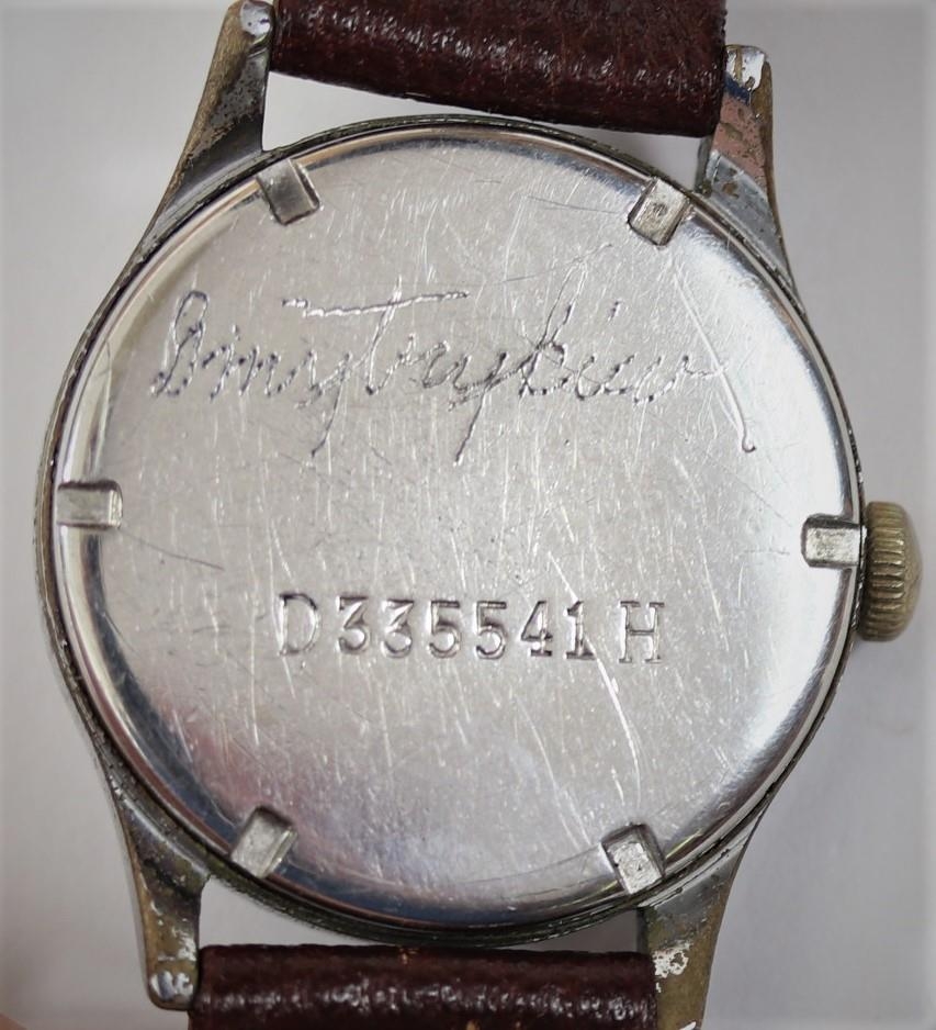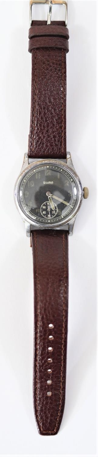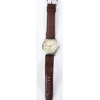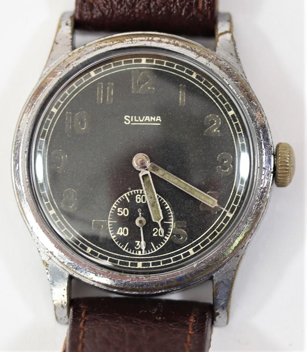 DH marked Silvana wristwatch. Serial D335541H. Plated case, brushed finish, some plating wear and pitting, 33mm without crown. Fixed bars. Screw caseback, with previous owners name scratched on. Dial in good condition, light spotting, luminous material on hands and numerals appears original, discoloured. Unsigned AS 1130 movement, shock protected balance, running condition. Movement retaining ring present. GC