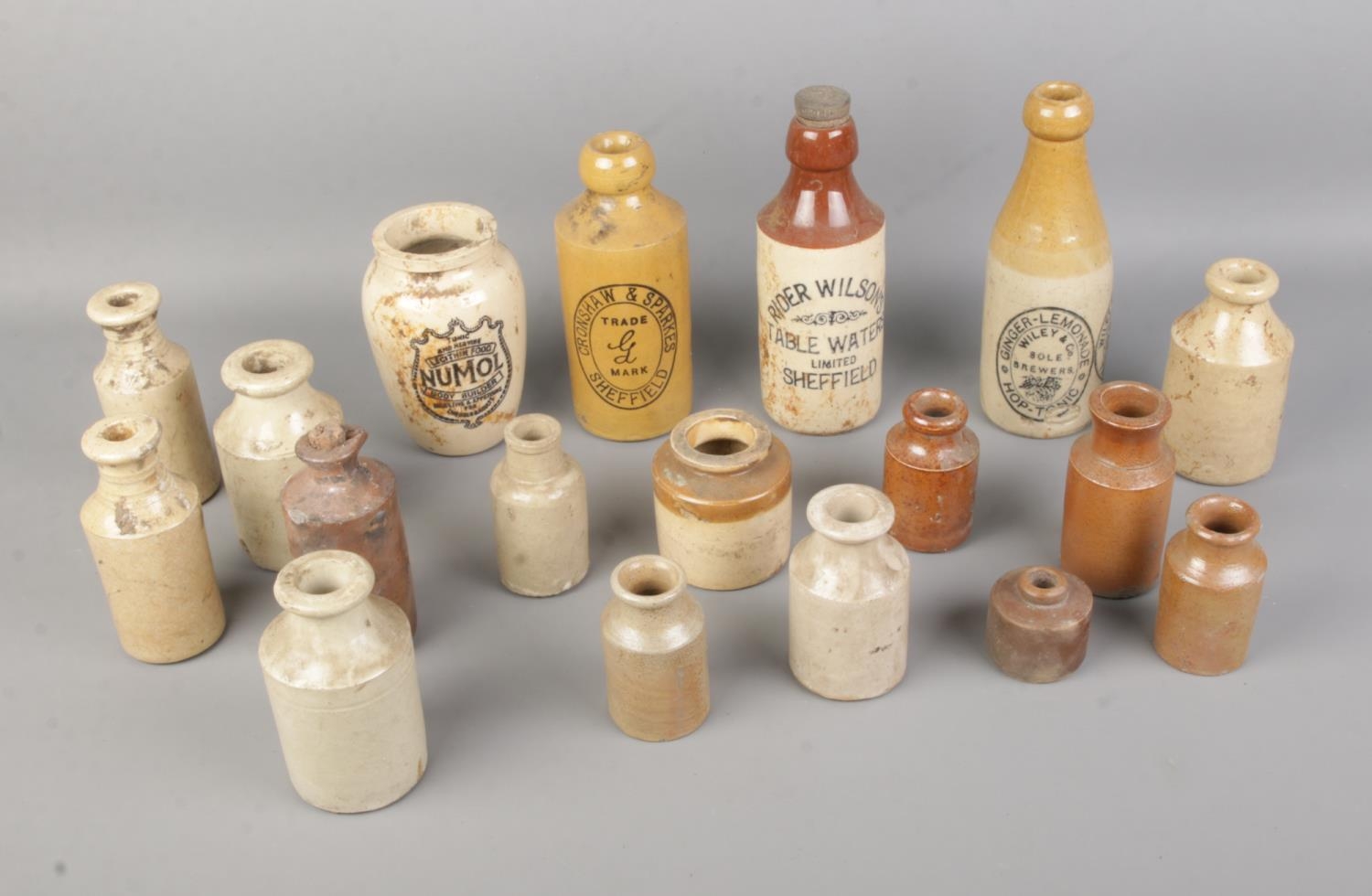 A collection of stoneware bottles. Rider Wilsons, Bole Brewers, Cronshaw and Sparkes, Numol Body Builder, etc.