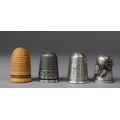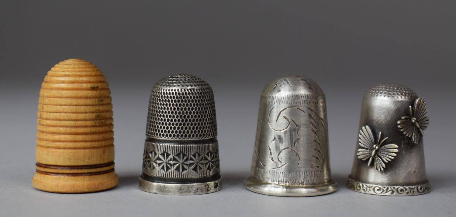 A Collection of Three Silver Thimbles and Turned Wooden Beehive Example