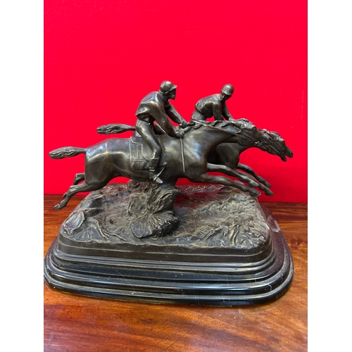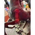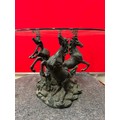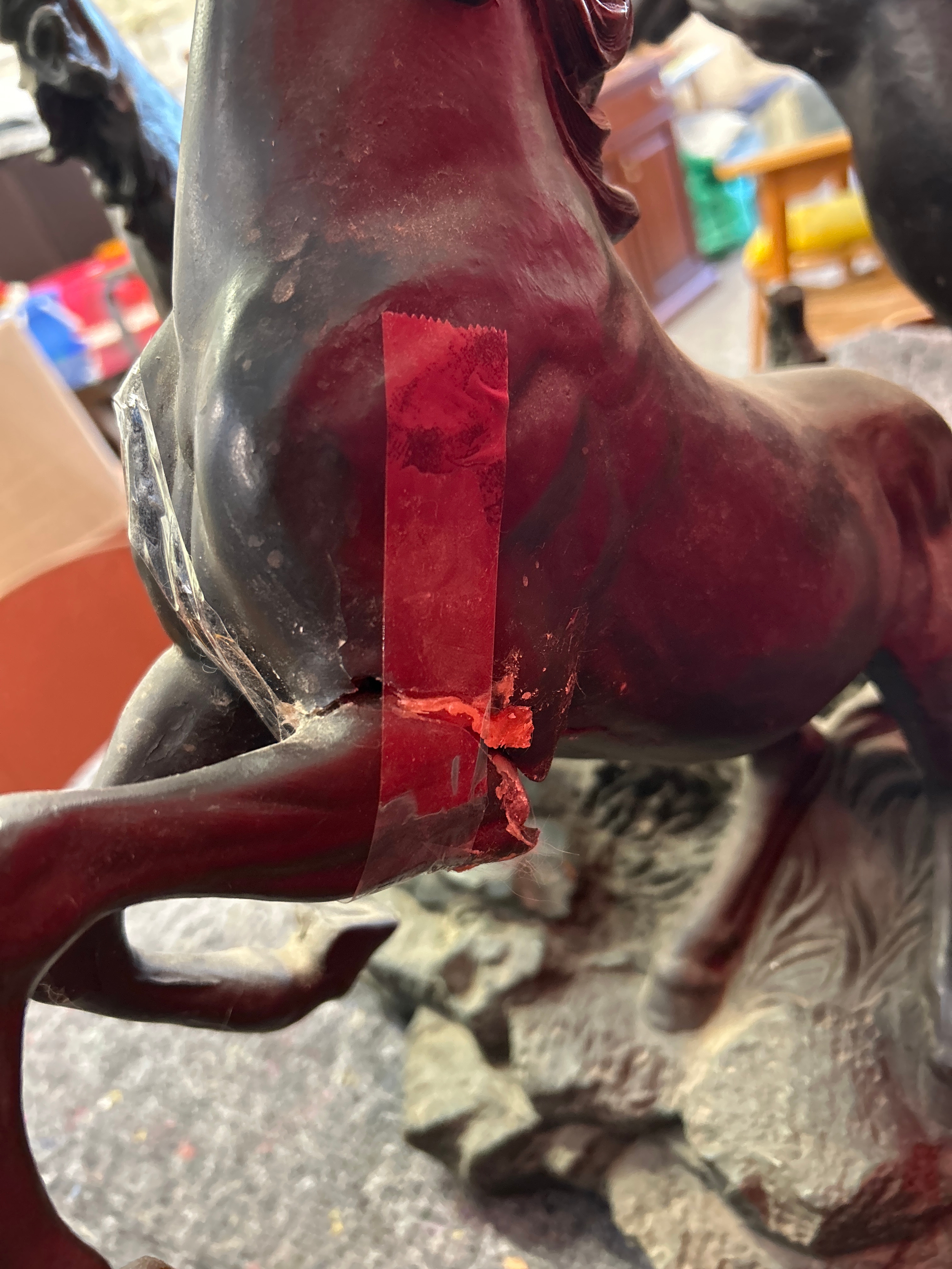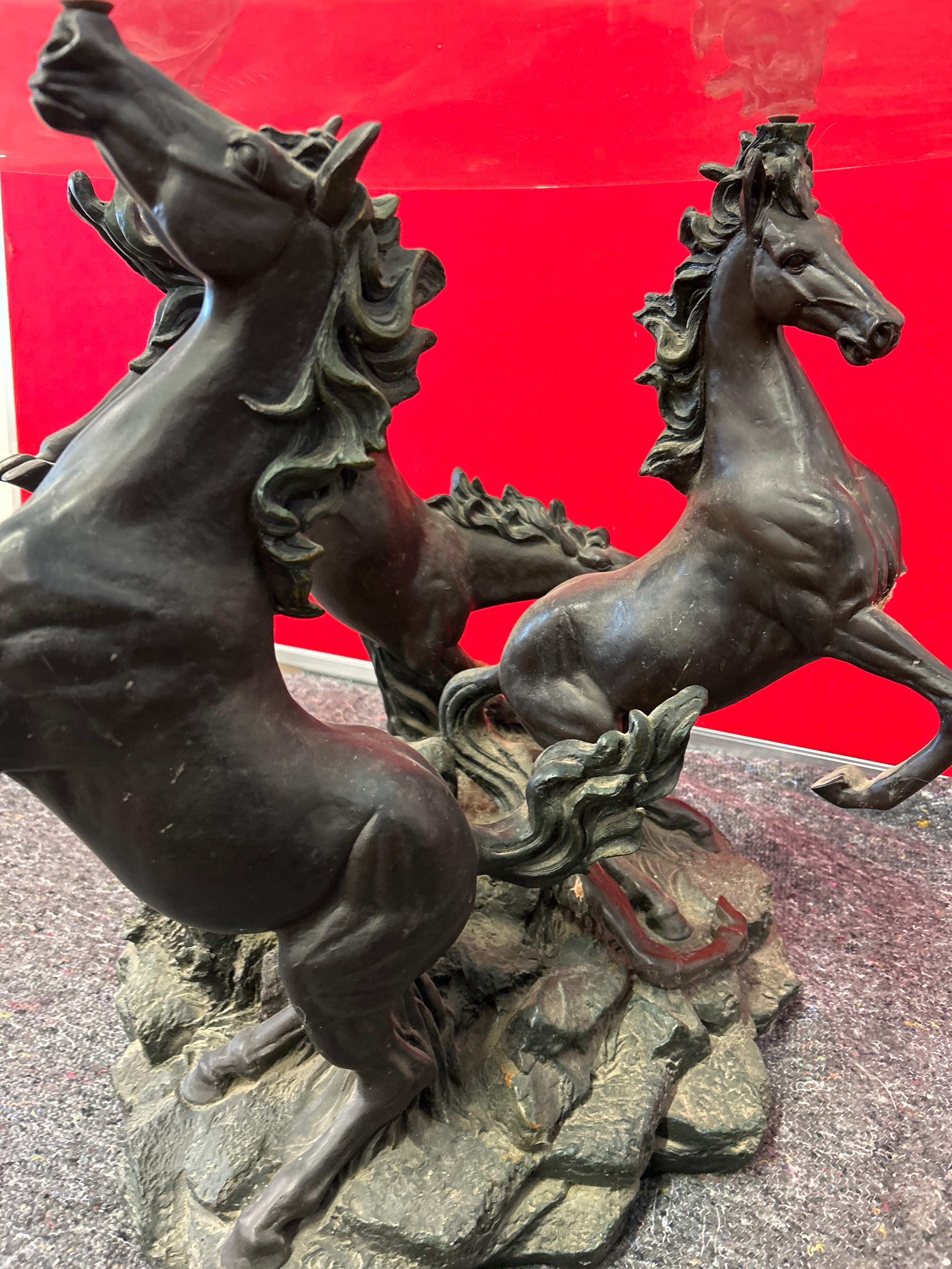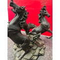 A 20th Century circular glass topped coffee table with the base in the form of three rearing horses. Dia 80cm, h 57cm. One leg needs repair.
