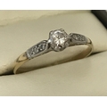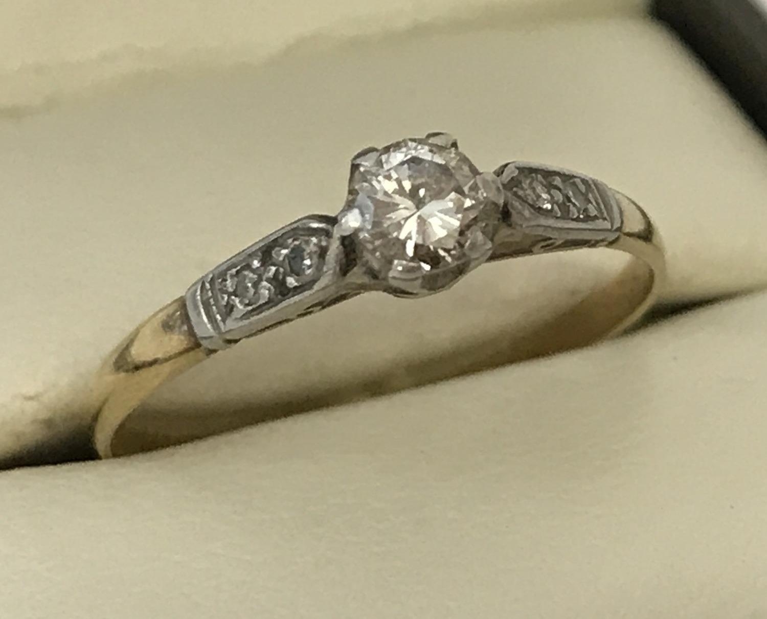 A vintage 18ct gold diamond solitaire ring. Central diamond approx .2ct with two small diamonds to each shoulder. Total weight approx. 1.4g.