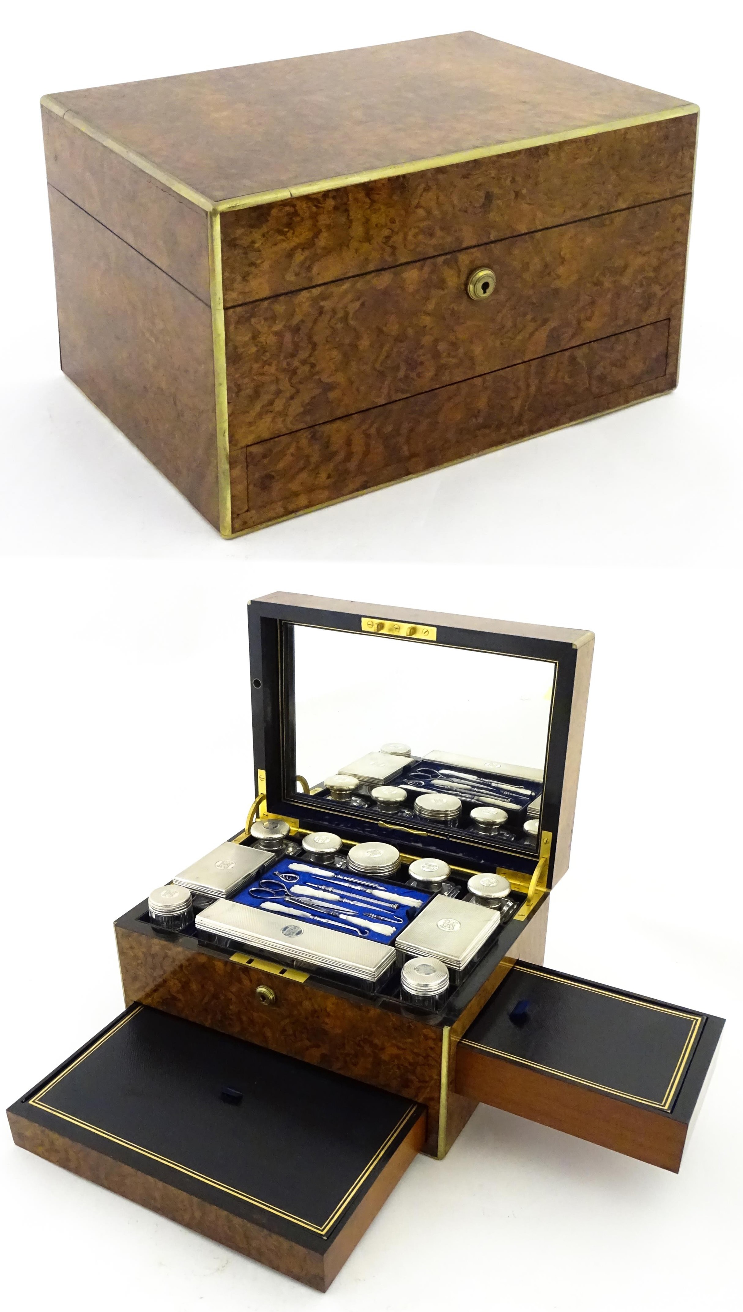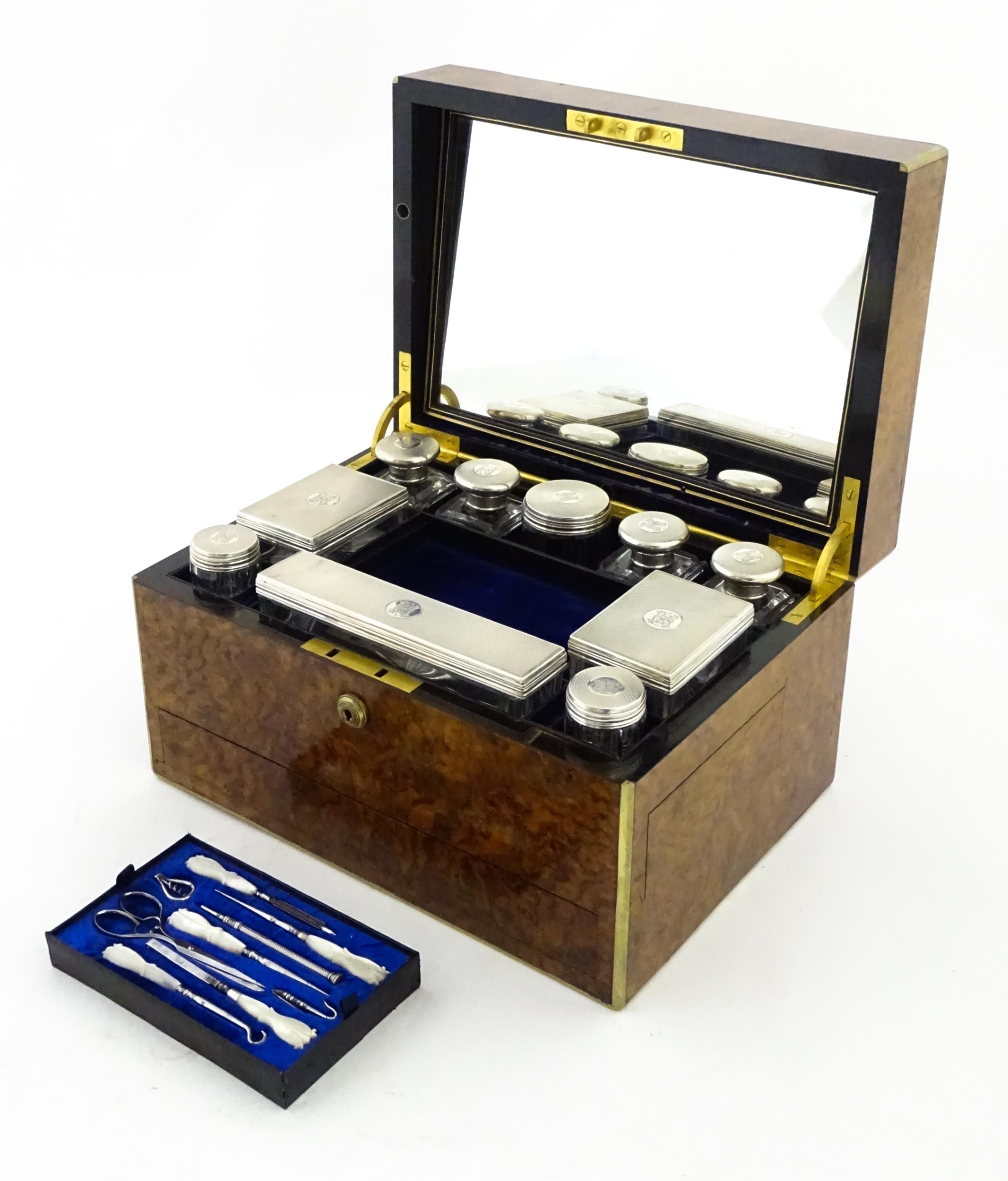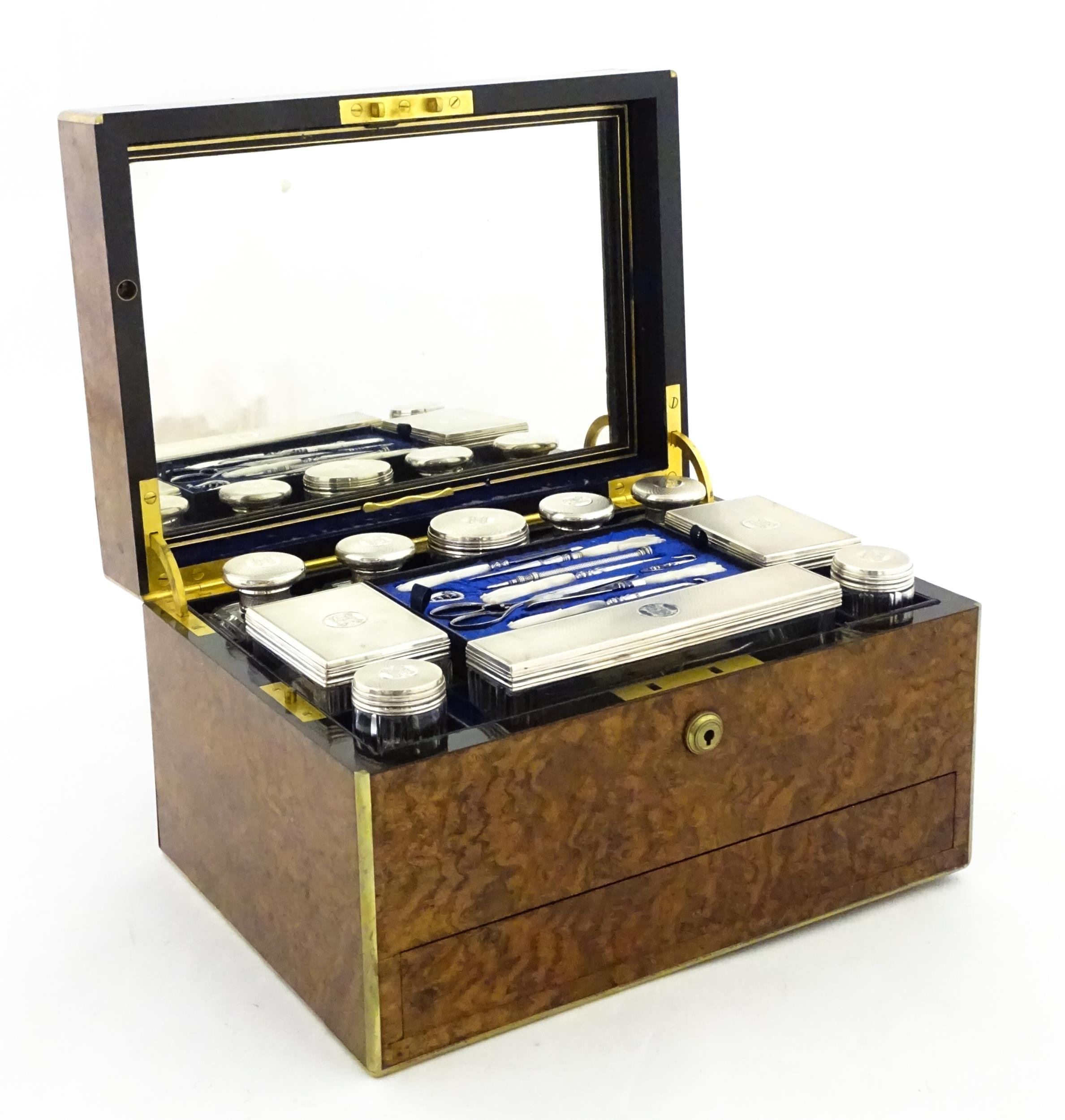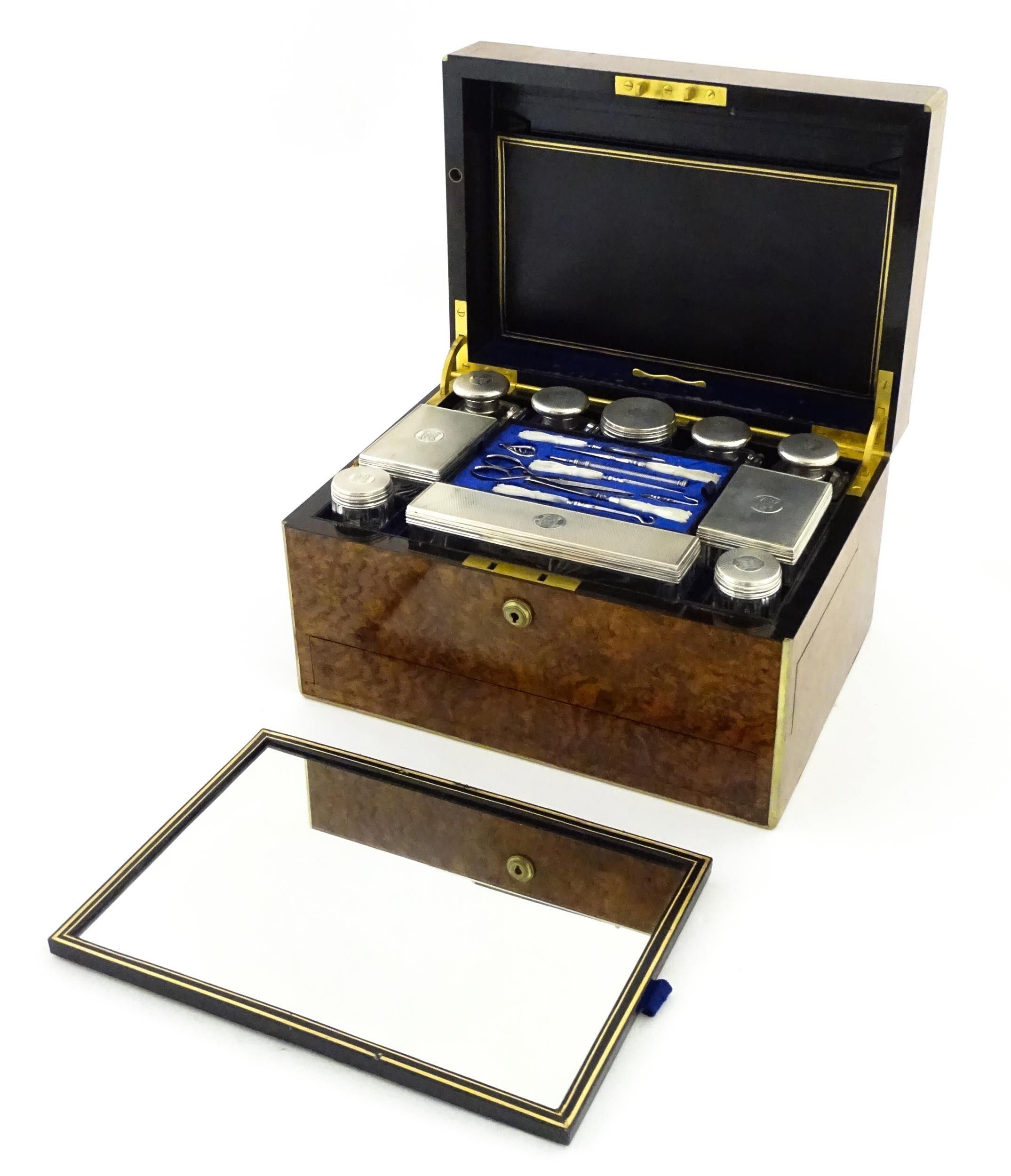 A Victorian brass bound walnut travelling vanity case / box with sprung section lower and to side, opening to reveal a fitted interior with mirror to lid and hidden stationery section behind, with ten dressing table pots / jars with silver lids having engine turned decoration, hallmarked London 1872, maker Frederic Purnell, surrounding a central tool tray with various accoutrements to include Asprey scissors, scent bottle corkscrew, propelling pencil, mother of pearl handled button hook, tweezers, nail file, etc. Approx. 7 3/4" high x 13 1/4" wide x 9 1/2" deep