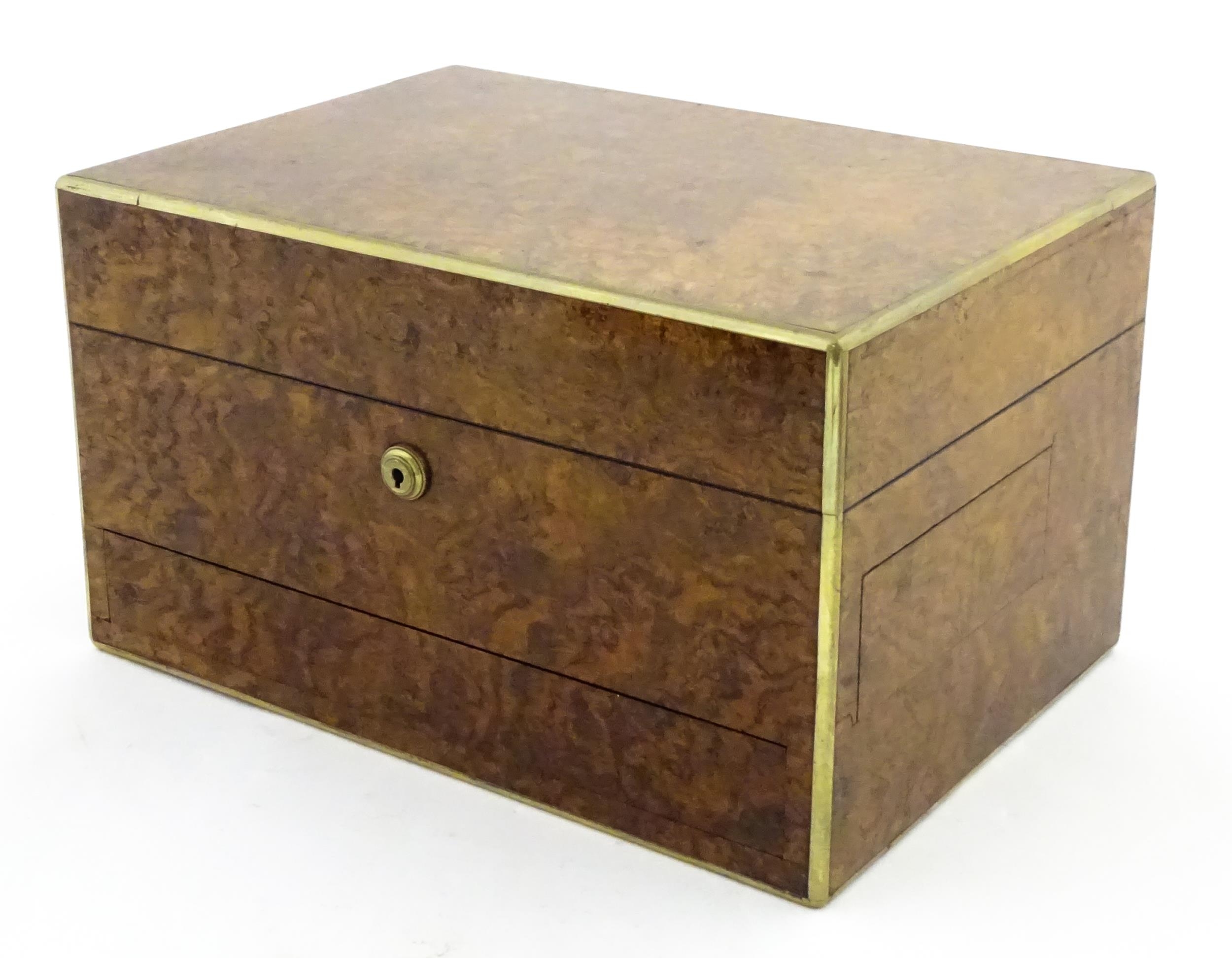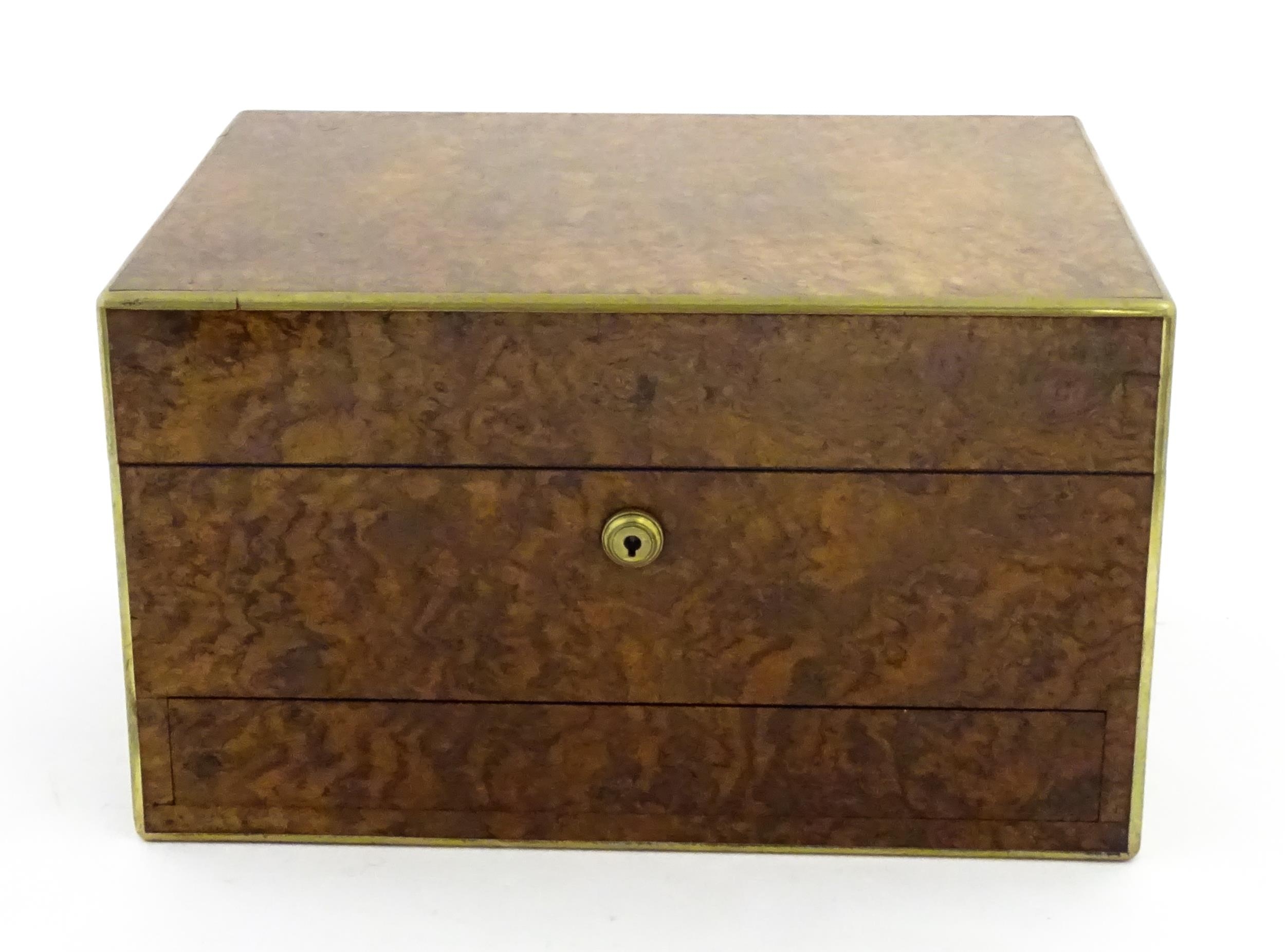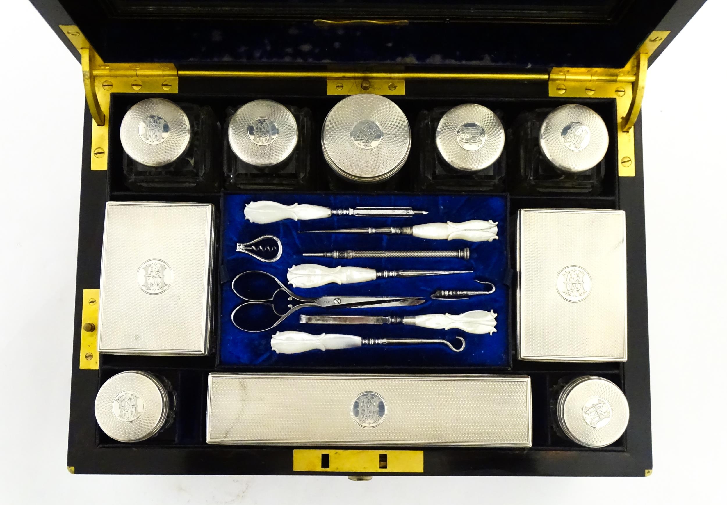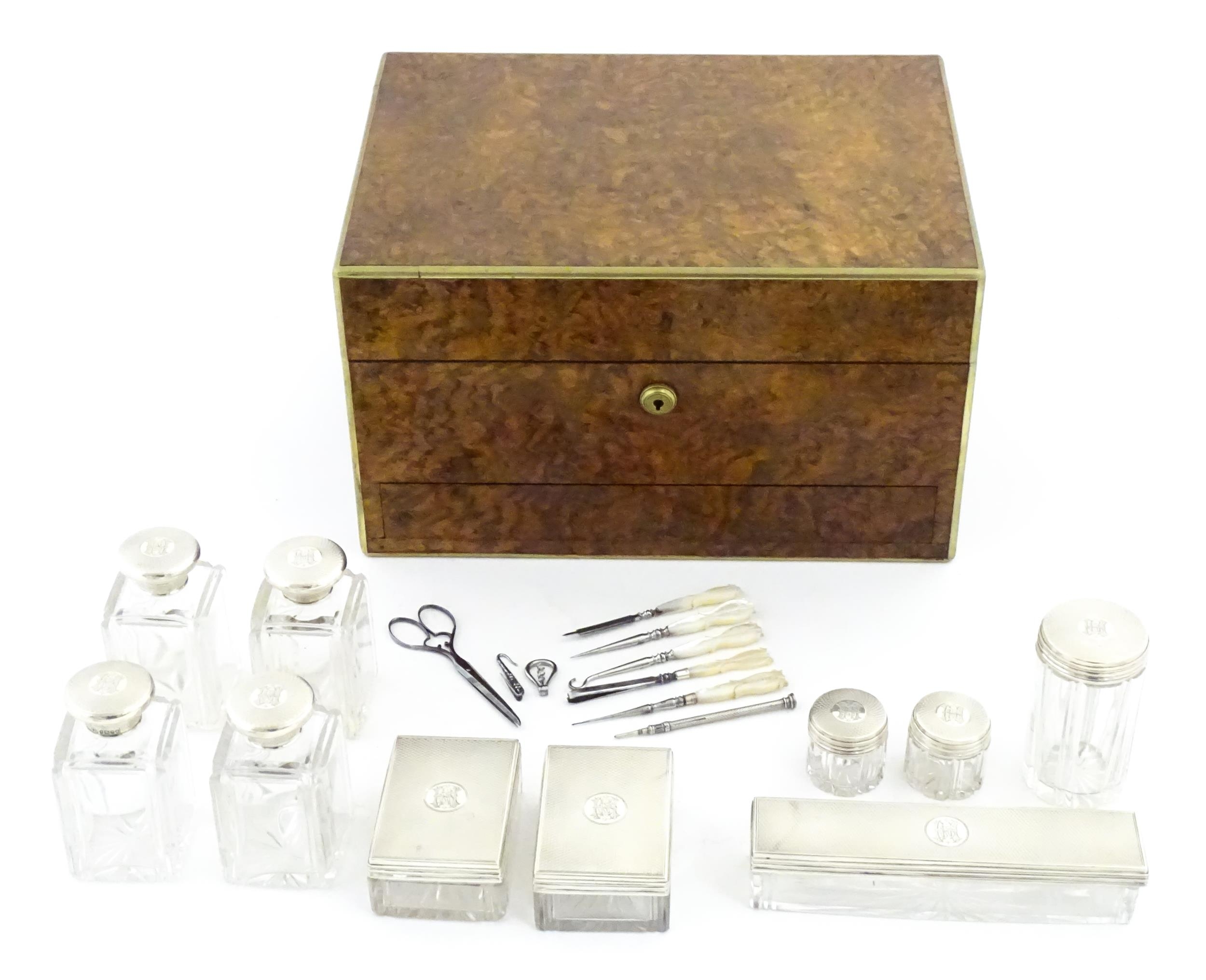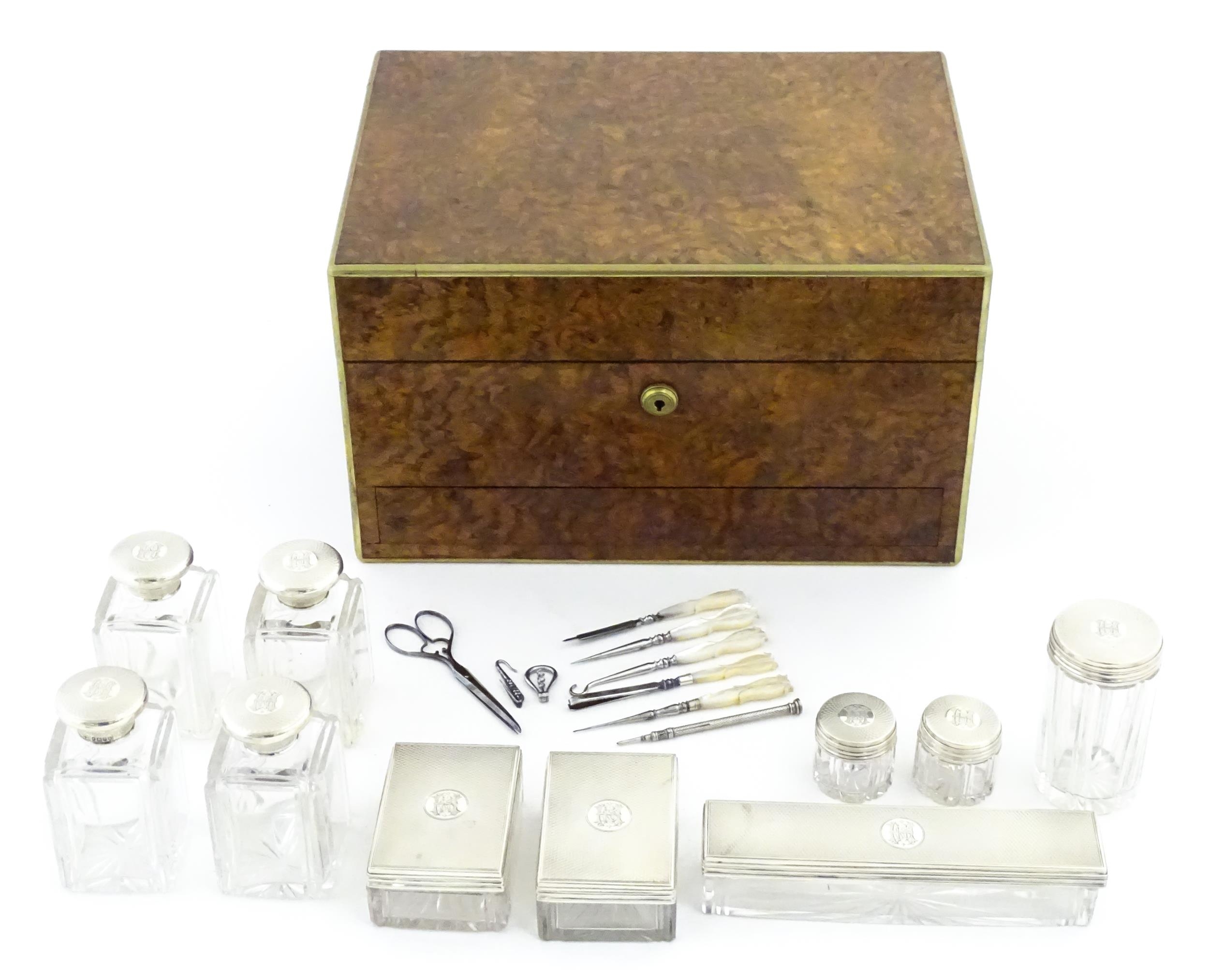 A Victorian brass bound walnut travelling vanity case / box with sprung section lower and to side, opening to reveal a fitted interior with mirror to lid and hidden stationery section behind, with ten dressing table pots / jars with silver lids having engine turned decoration, hallmarked London 1872, maker Frederic Purnell, surrounding a central tool tray with various accoutrements to include Asprey scissors, scent bottle corkscrew, propelling pencil, mother of pearl handled button hook, tweezers, nail file, etc. Approx. 7 3/4" high x 13 1/4" wide x 9 1/2" deep
