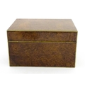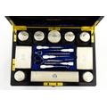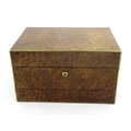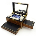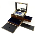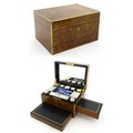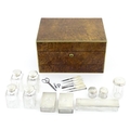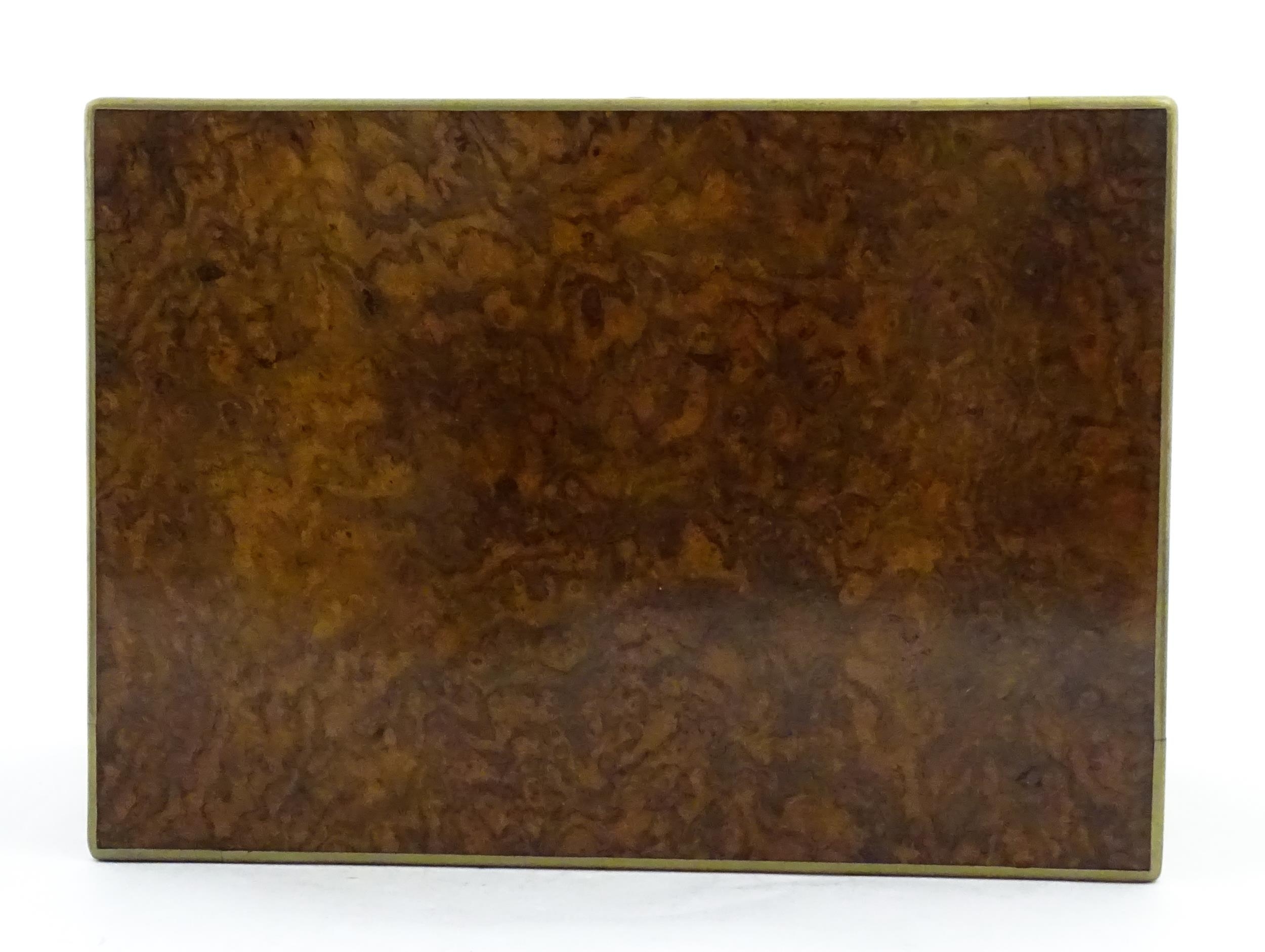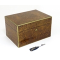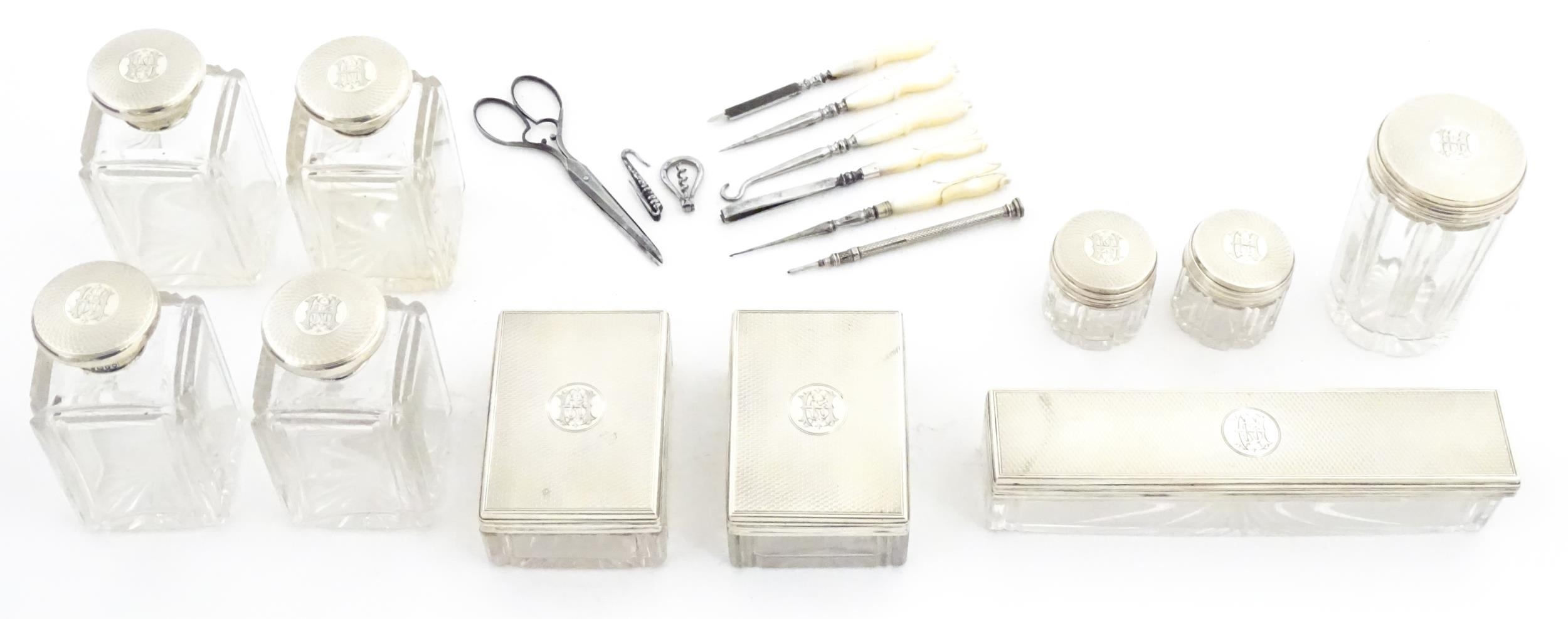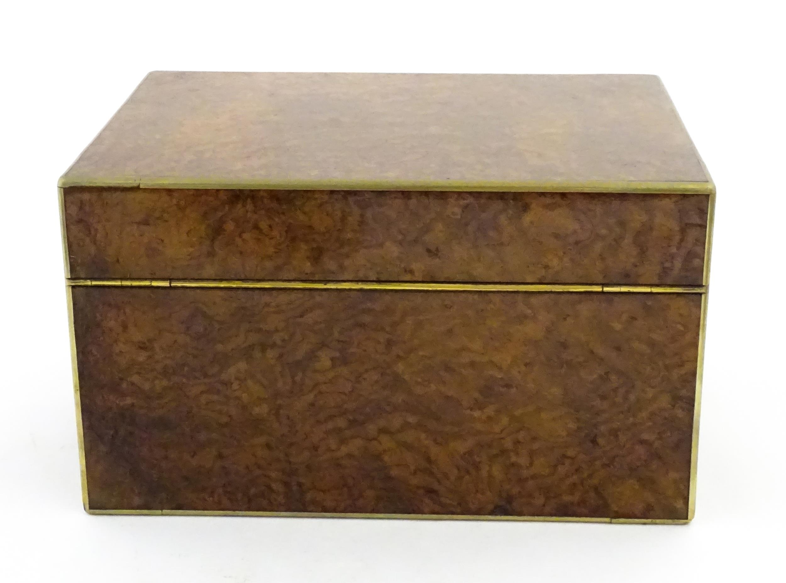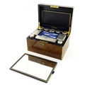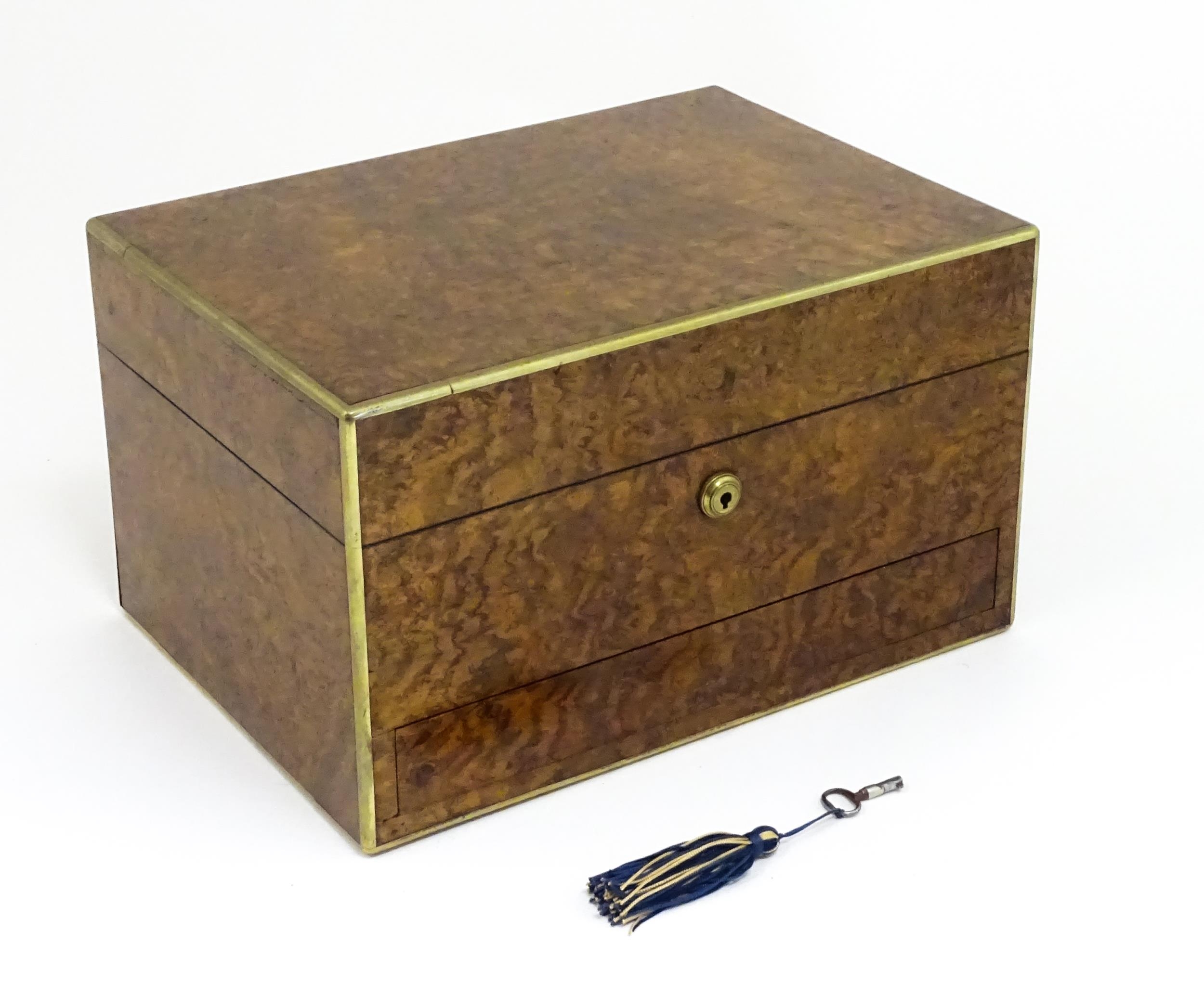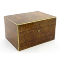 A Victorian brass bound walnut travelling vanity case / box with sprung section lower and to side, opening to reveal a fitted interior with mirror to lid and hidden stationery section behind, with ten dressing table pots / jars with silver lids having engine turned decoration, hallmarked London 1872, maker Frederic Purnell, surrounding a central tool tray with various accoutrements to include Asprey scissors, scent bottle corkscrew, propelling pencil, mother of pearl handled button hook, tweezers, nail file, etc. Approx. 7 3/4" high x 13 1/4" wide x 9 1/2" deep