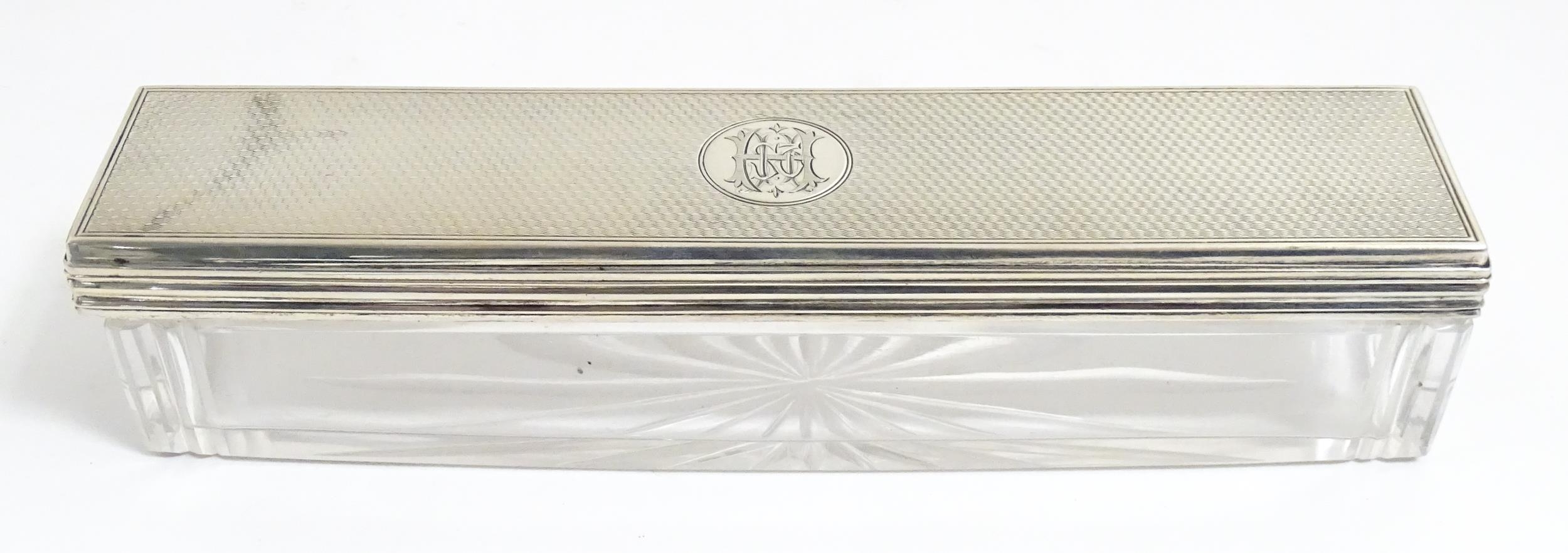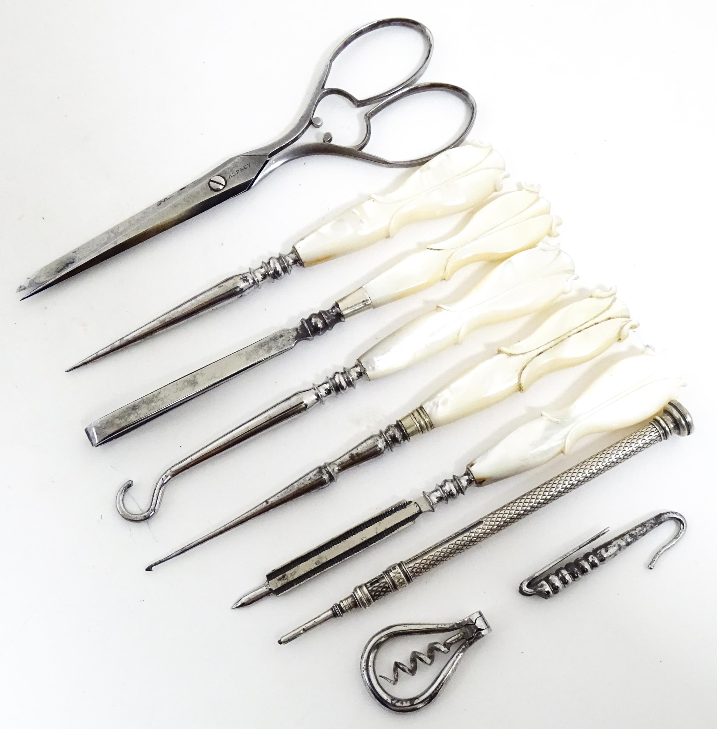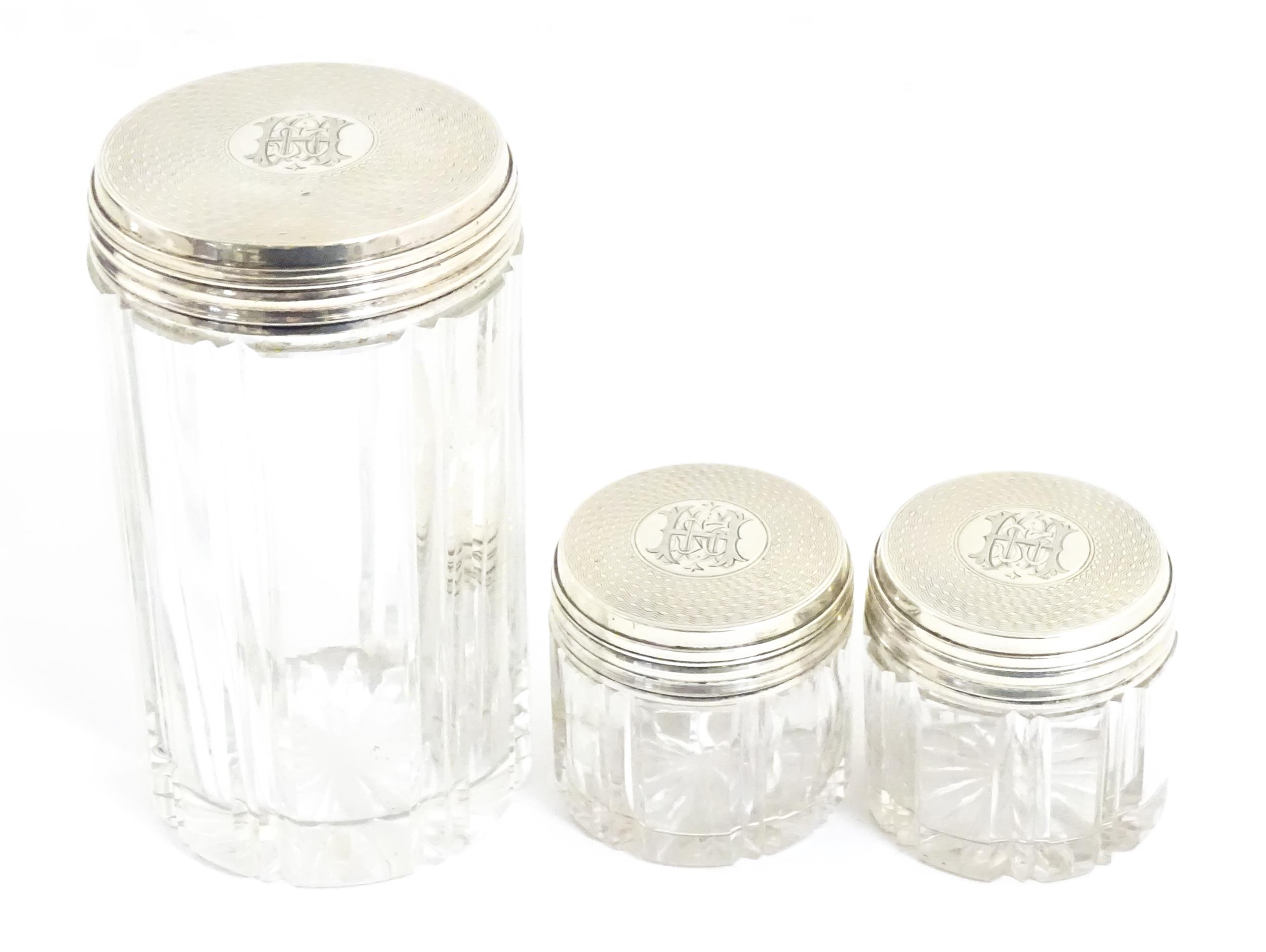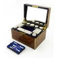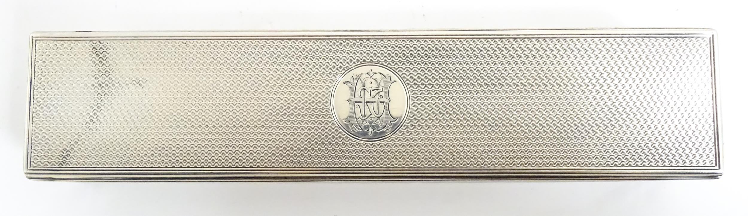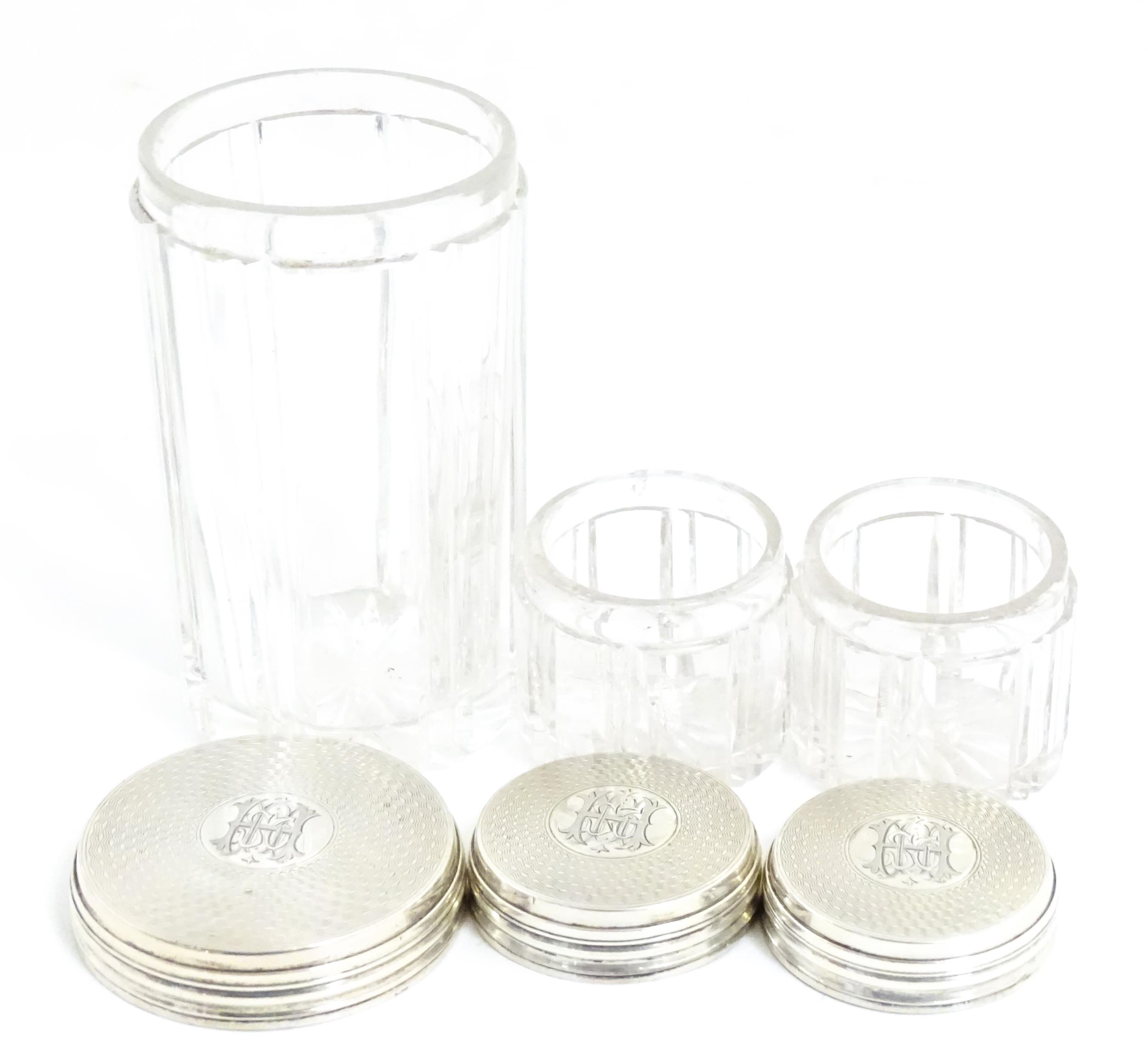 A Victorian brass bound walnut travelling vanity case / box with sprung section lower and to side, opening to reveal a fitted interior with mirror to lid and hidden stationery section behind, with ten dressing table pots / jars with silver lids having engine turned decoration, hallmarked London 1872, maker Frederic Purnell, surrounding a central tool tray with various accoutrements to include Asprey scissors, scent bottle corkscrew, propelling pencil, mother of pearl handled button hook, tweezers, nail file, etc. Approx. 7 3/4" high x 13 1/4" wide x 9 1/2" deep