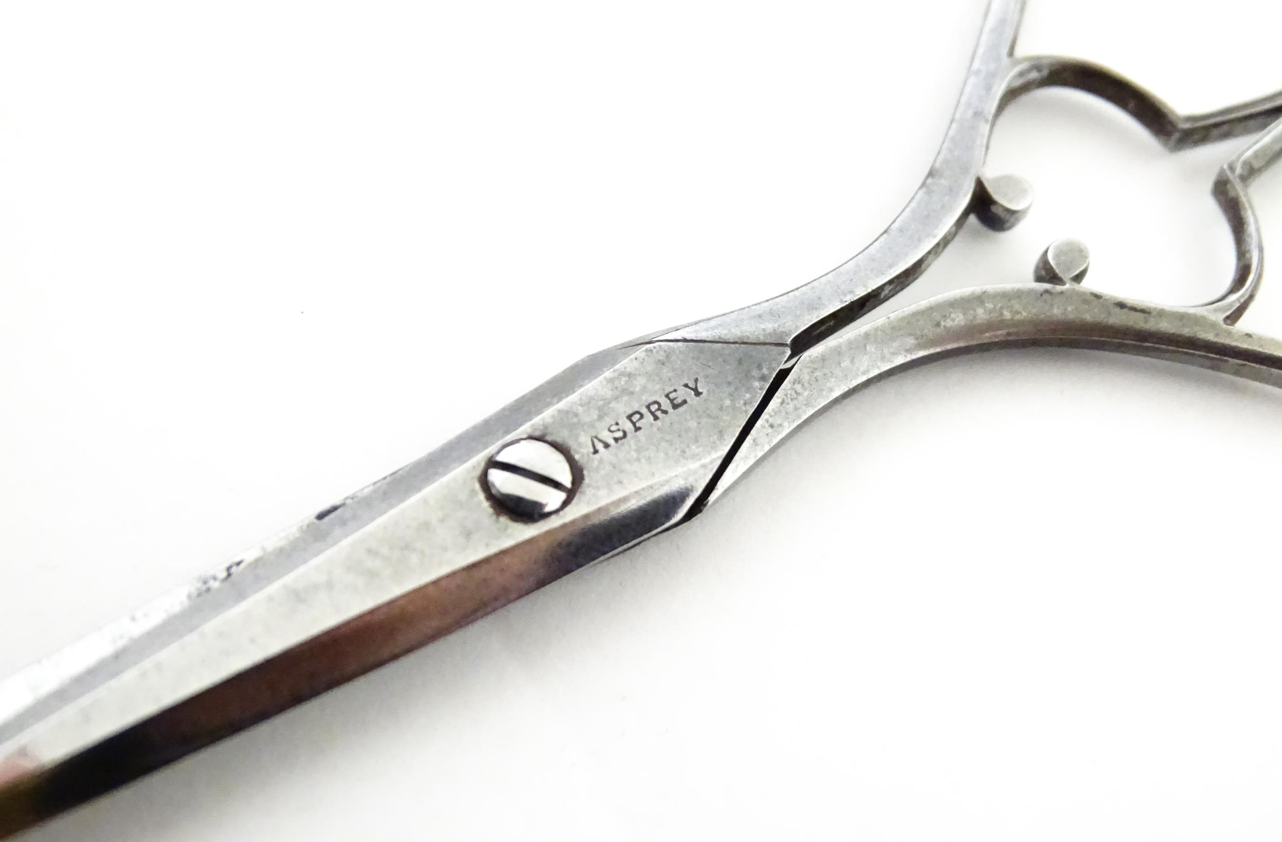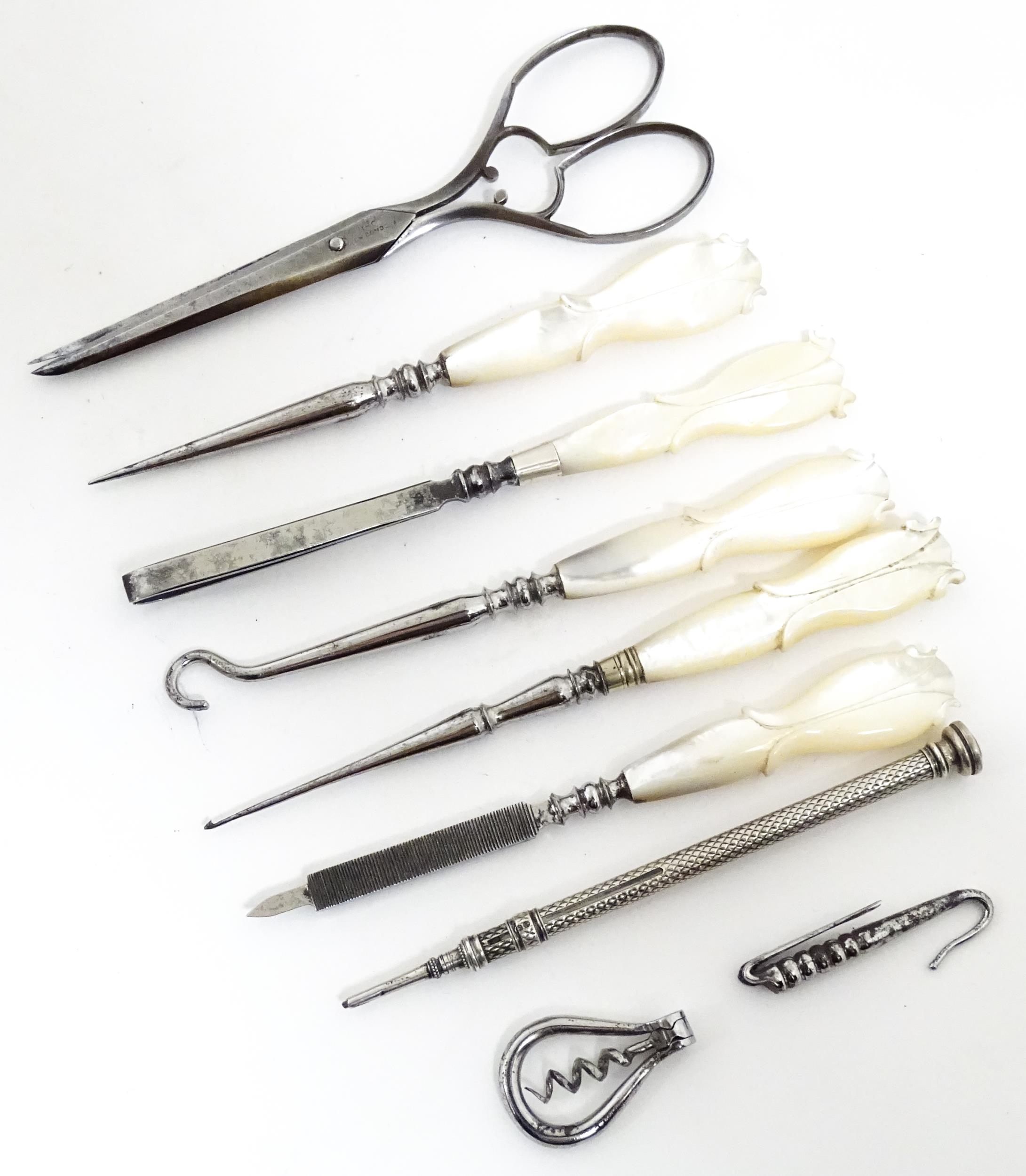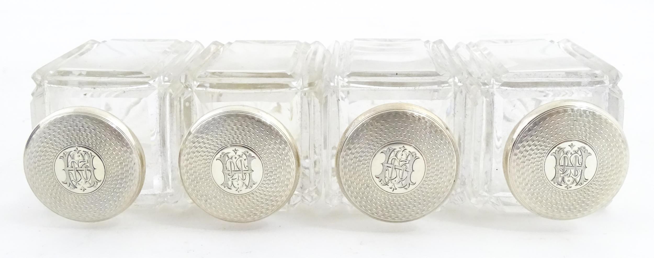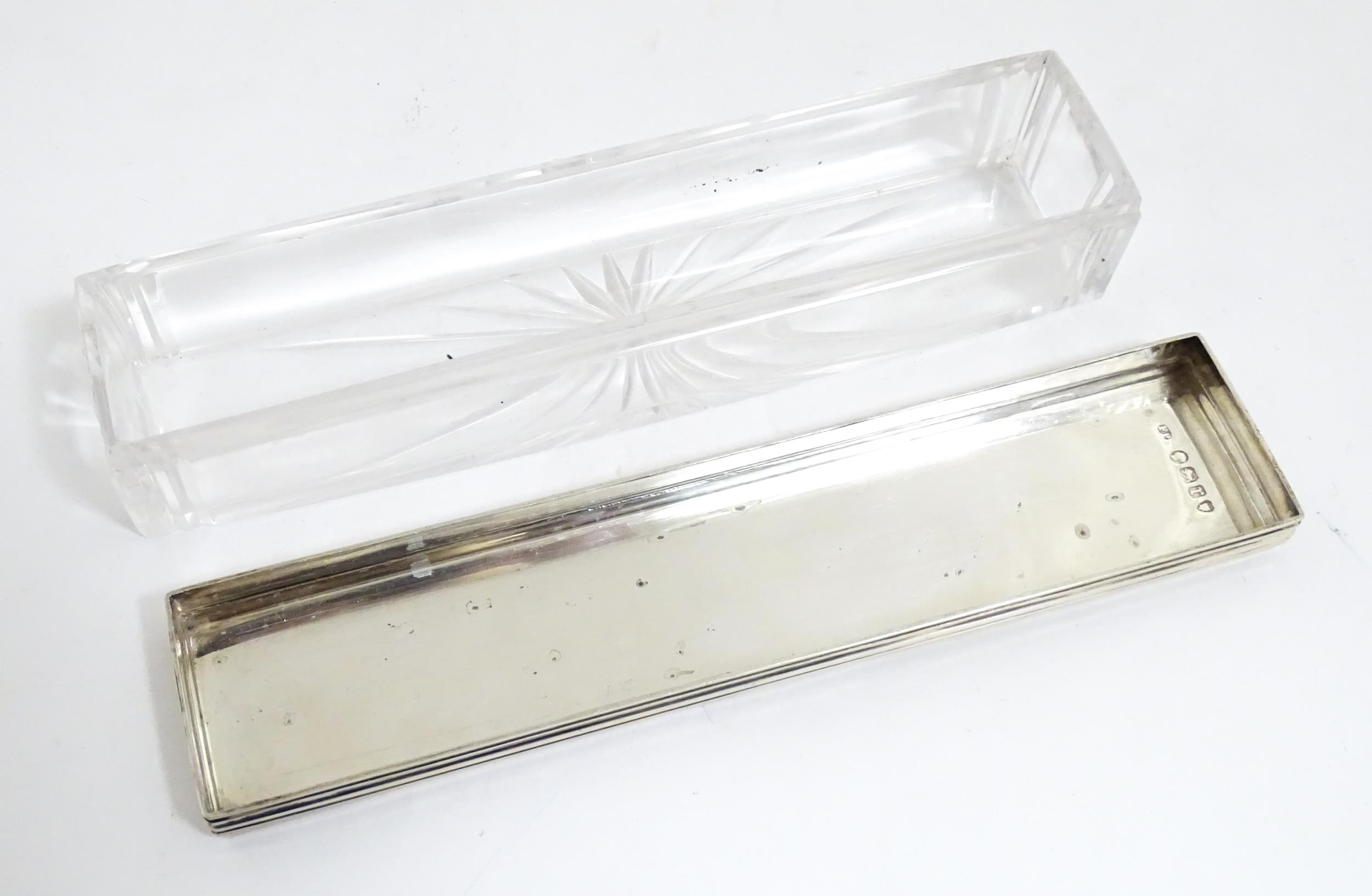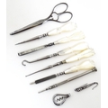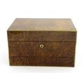 A Victorian brass bound walnut travelling vanity case / box with sprung section lower and to side, opening to reveal a fitted interior with mirror to lid and hidden stationery section behind, with ten dressing table pots / jars with silver lids having engine turned decoration, hallmarked London 1872, maker Frederic Purnell, surrounding a central tool tray with various accoutrements to include Asprey scissors, scent bottle corkscrew, propelling pencil, mother of pearl handled button hook, tweezers, nail file, etc. Approx. 7 3/4" high x 13 1/4" wide x 9 1/2" deep
