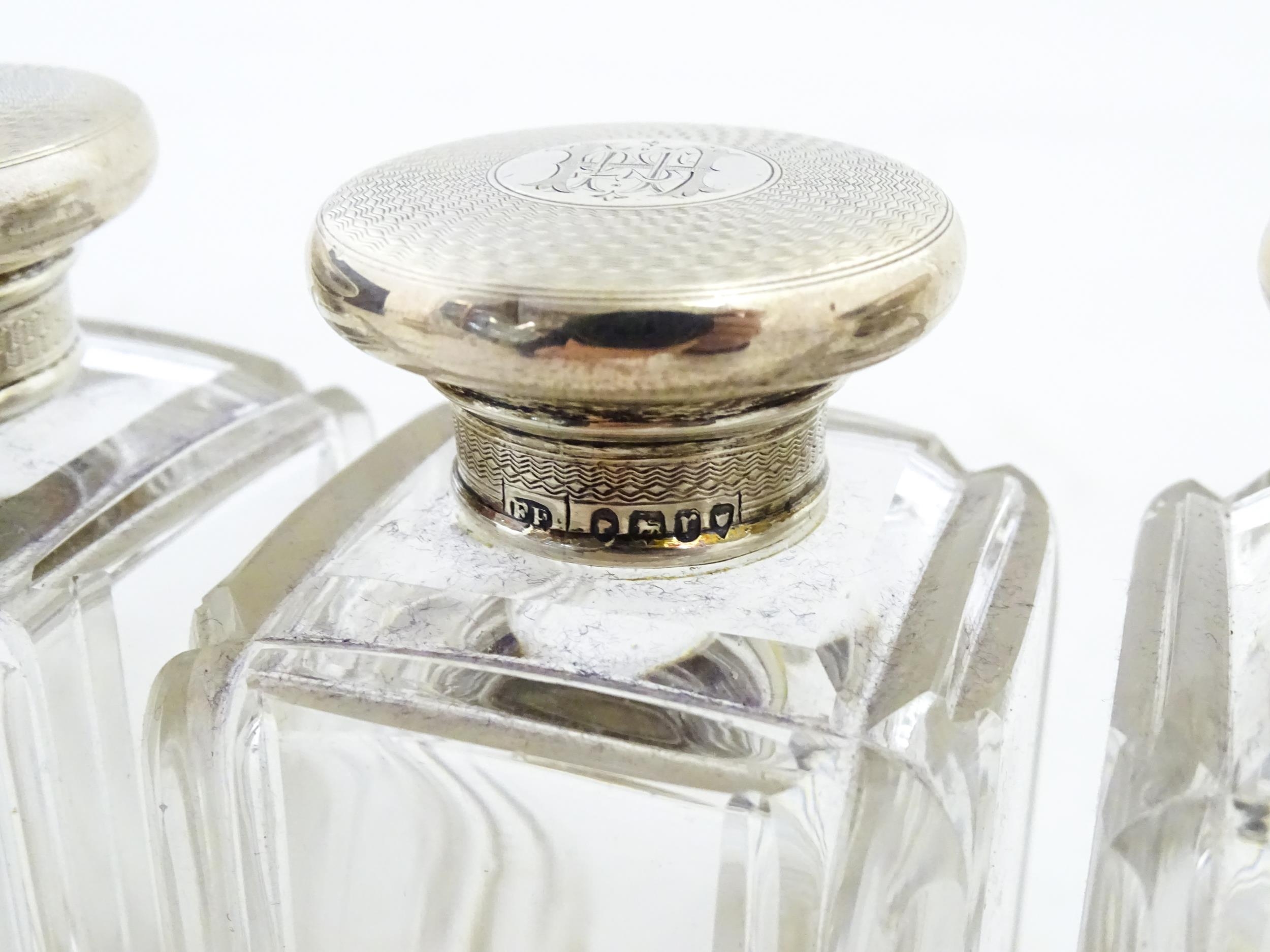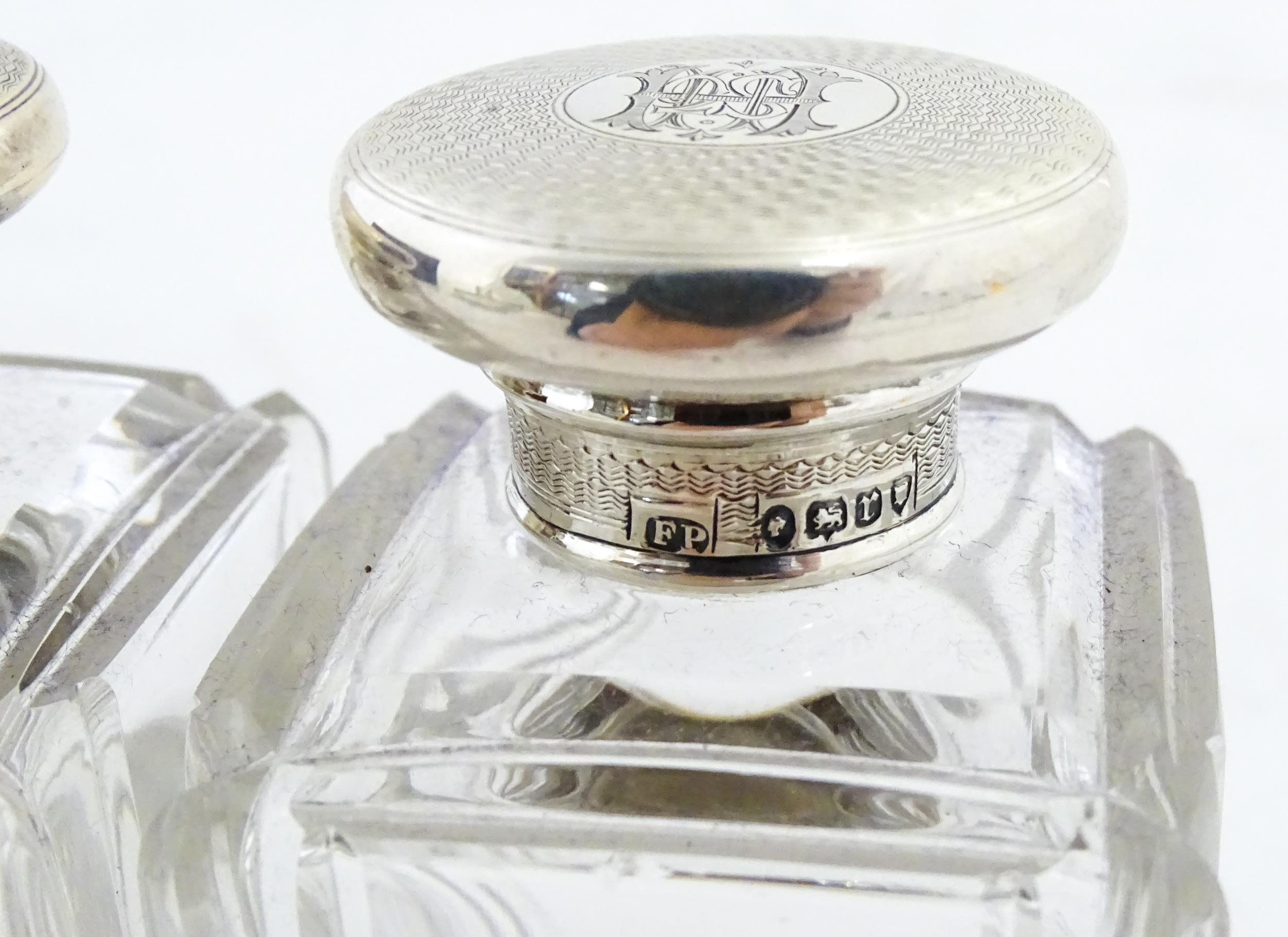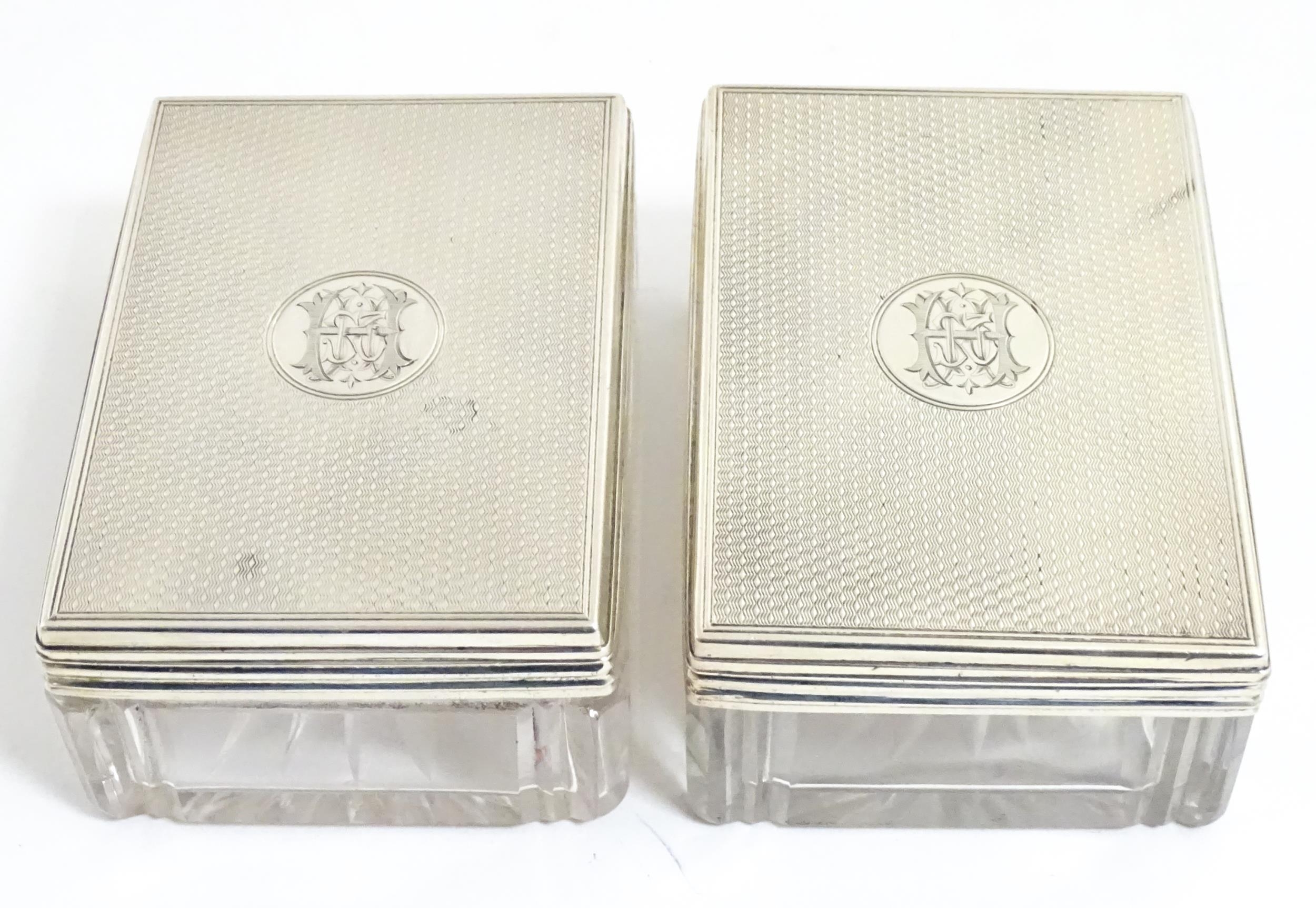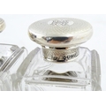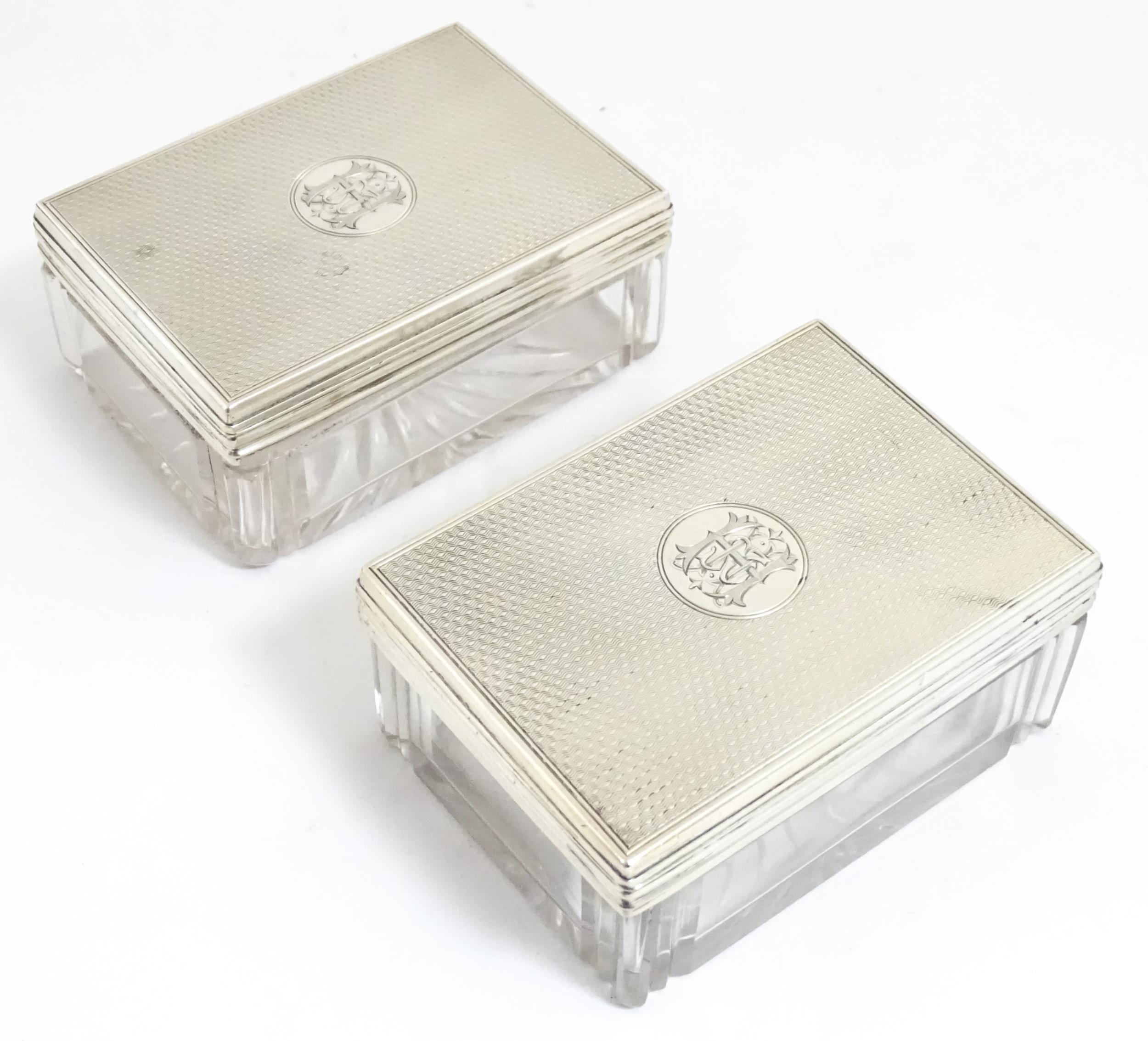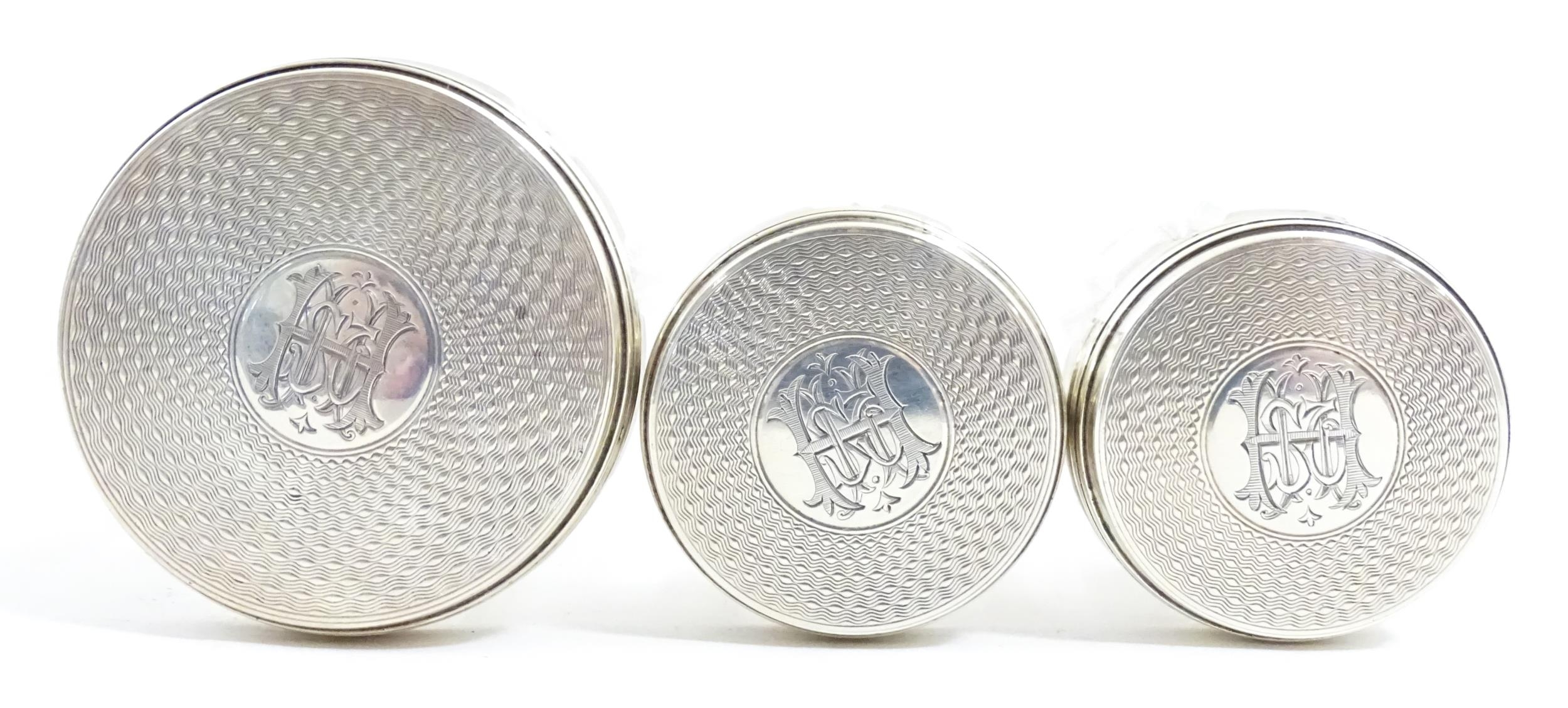 A Victorian brass bound walnut travelling vanity case / box with sprung section lower and to side, opening to reveal a fitted interior with mirror to lid and hidden stationery section behind, with ten dressing table pots / jars with silver lids having engine turned decoration, hallmarked London 1872, maker Frederic Purnell, surrounding a central tool tray with various accoutrements to include Asprey scissors, scent bottle corkscrew, propelling pencil, mother of pearl handled button hook, tweezers, nail file, etc. Approx. 7 3/4" high x 13 1/4" wide x 9 1/2" deep