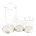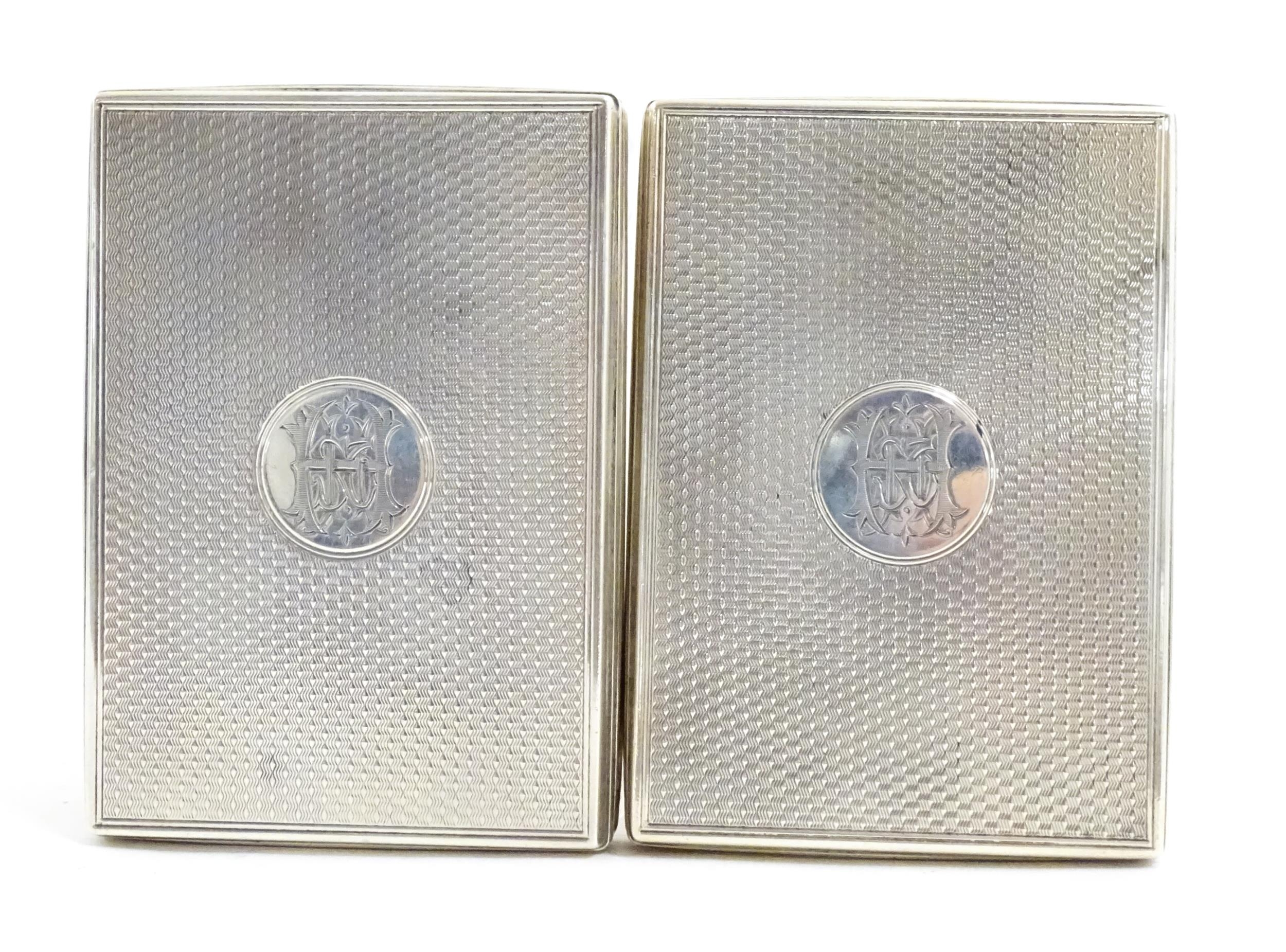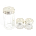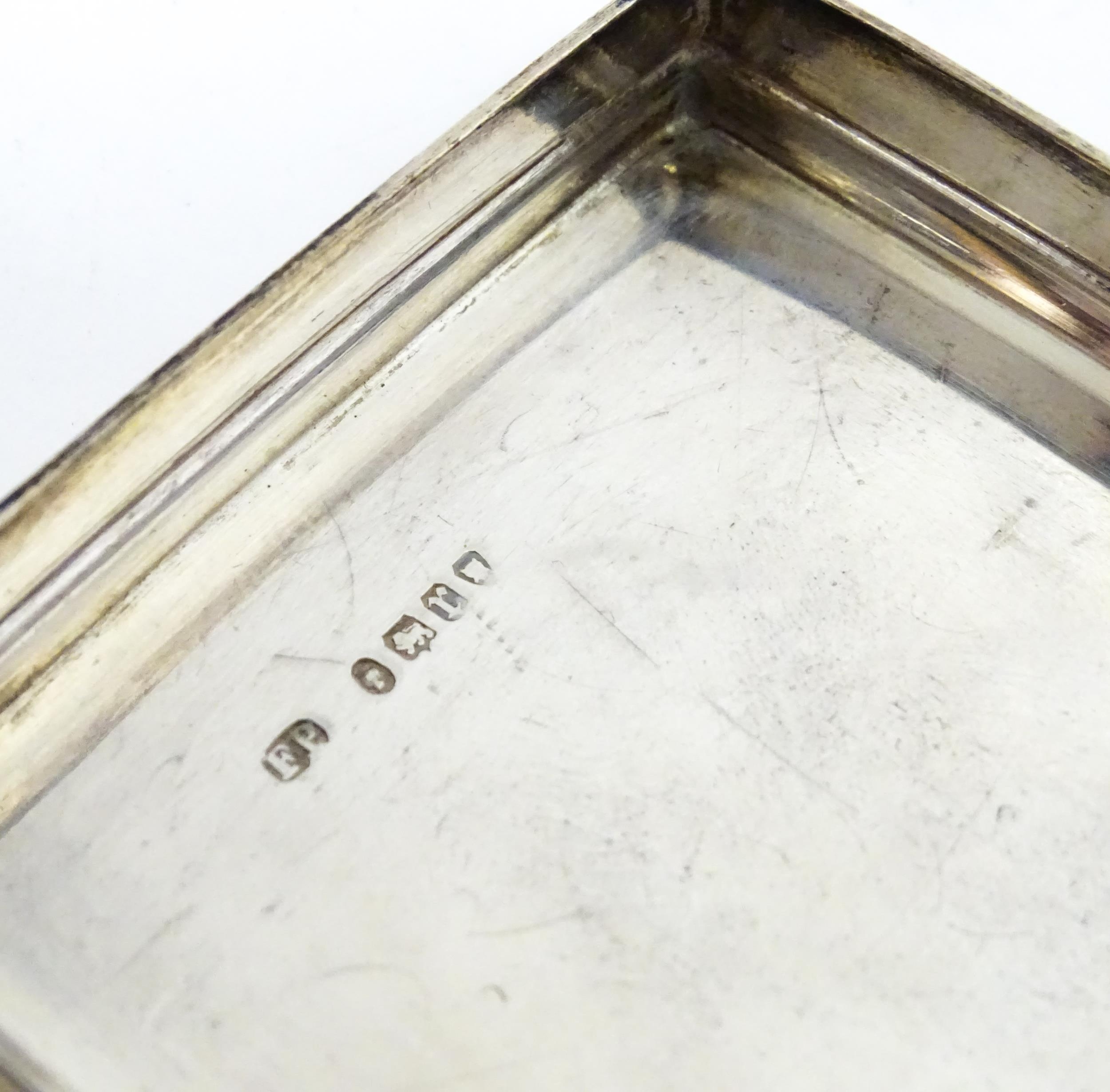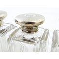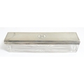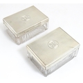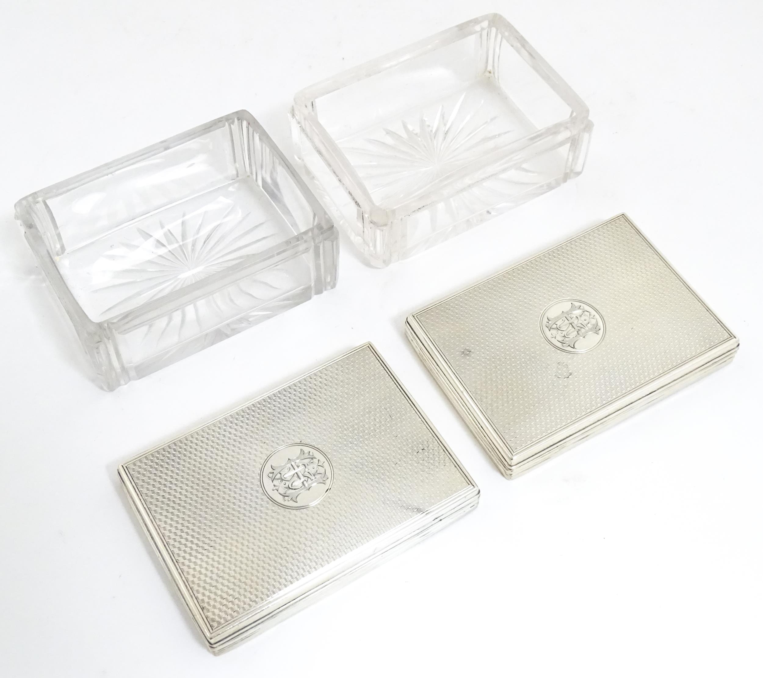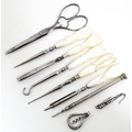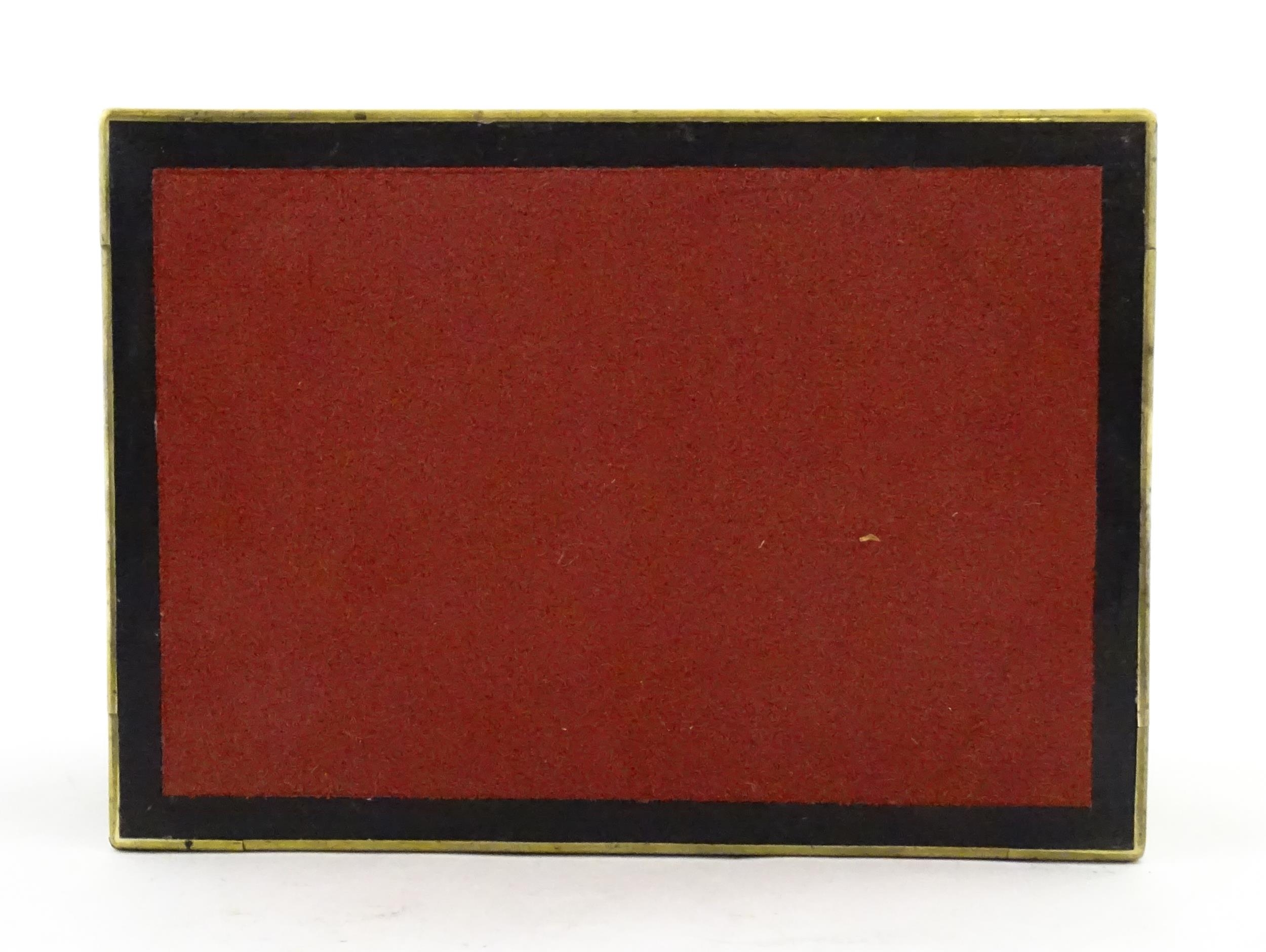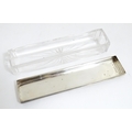 A Victorian brass bound walnut travelling vanity case / box with sprung section lower and to side, opening to reveal a fitted interior with mirror to lid and hidden stationery section behind, with ten dressing table pots / jars with silver lids having engine turned decoration, hallmarked London 1872, maker Frederic Purnell, surrounding a central tool tray with various accoutrements to include Asprey scissors, scent bottle corkscrew, propelling pencil, mother of pearl handled button hook, tweezers, nail file, etc. Approx. 7 3/4" high x 13 1/4" wide x 9 1/2" deep