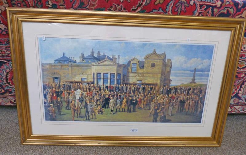 GILT FRAMED PICTURE OF ST ANDREWS GOLF CLUB & PLAYERS 41CM X 81CM