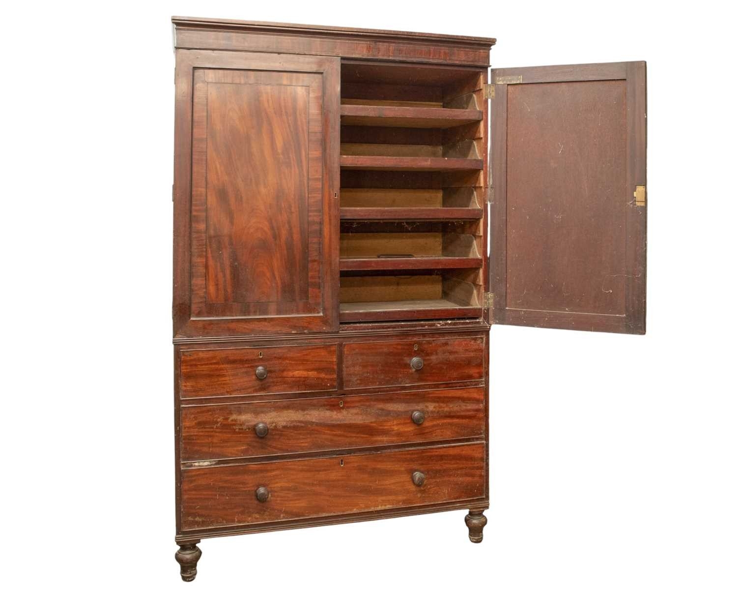 A George IV mahogany and ebony strung linen press, The upper part with two panel doors enclosing sliding trays, the lower part with two short and two long drawers, on turned feet, height 206cm, width 126cm, depth 55cm.