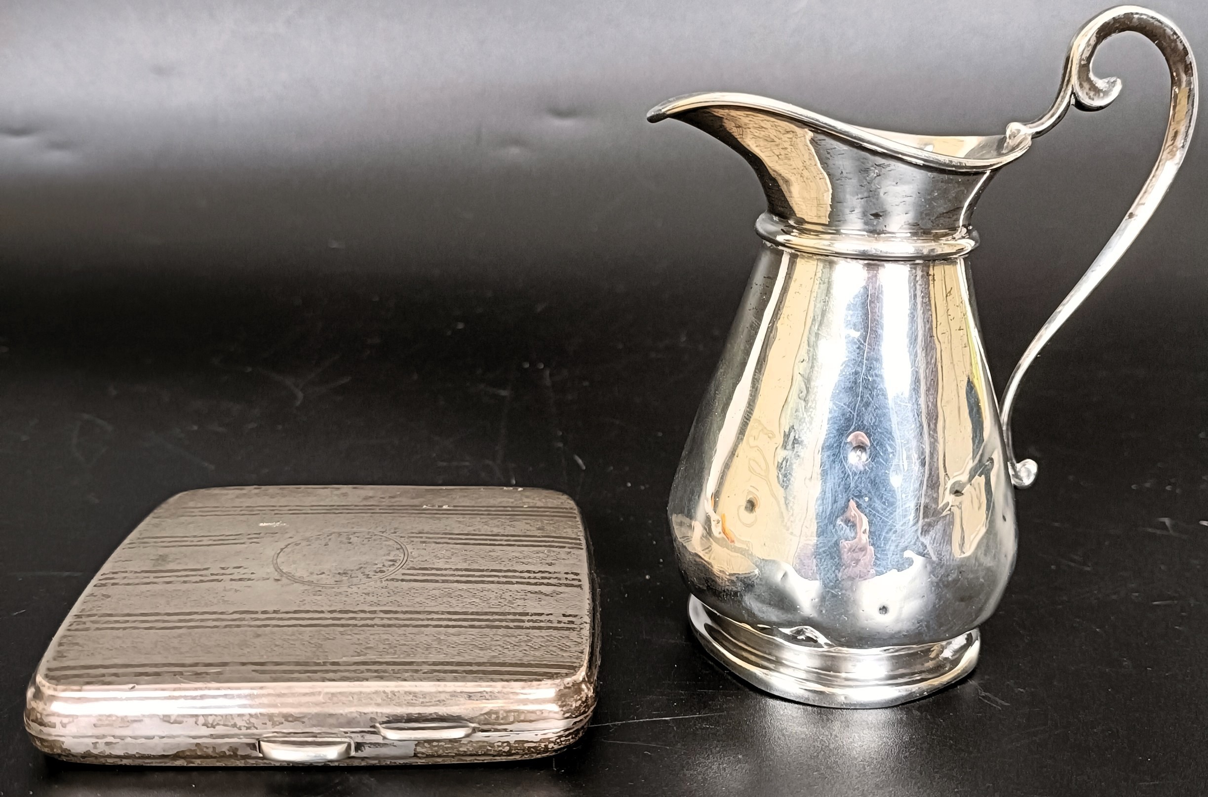 A George V silver cigarette case, and a cream jug, 5.5 ozt (2)
