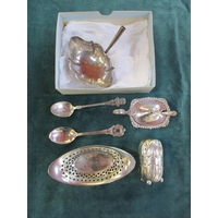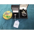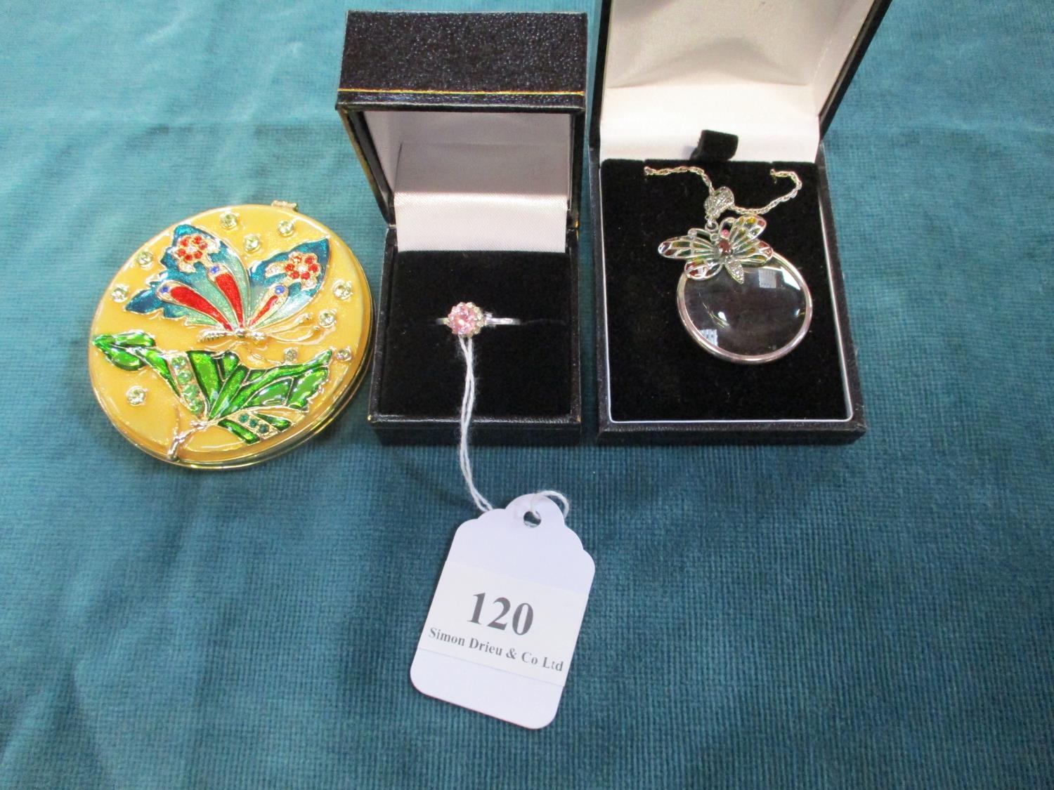 A magnifying glass on chain, handbag mirror and silver ring