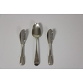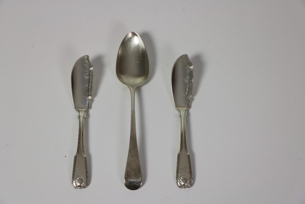 A matching pair of kings pattern type late George III Irish silver Butter Knives, Dublin c. 1816, by Wm. Law & T.T., also an English silver Table Spoon, London c. 1804, possibly by Stephen Adams. (3)
