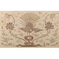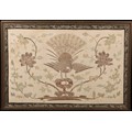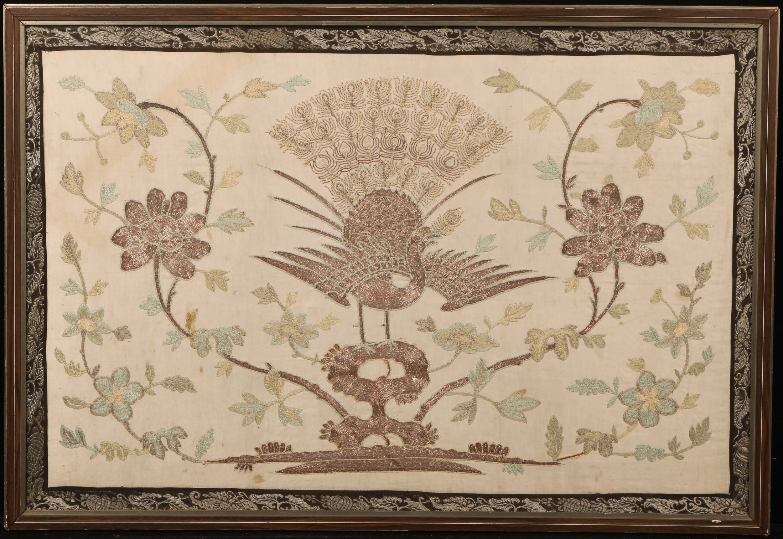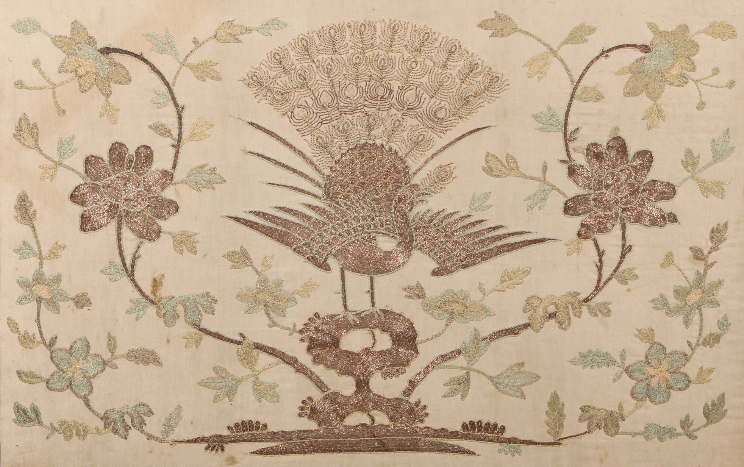 An early 20th century Chinese silk and metal stitch textile panel, worked with a fenghuang and flowering leafy stems, 58cm x 85.5cm