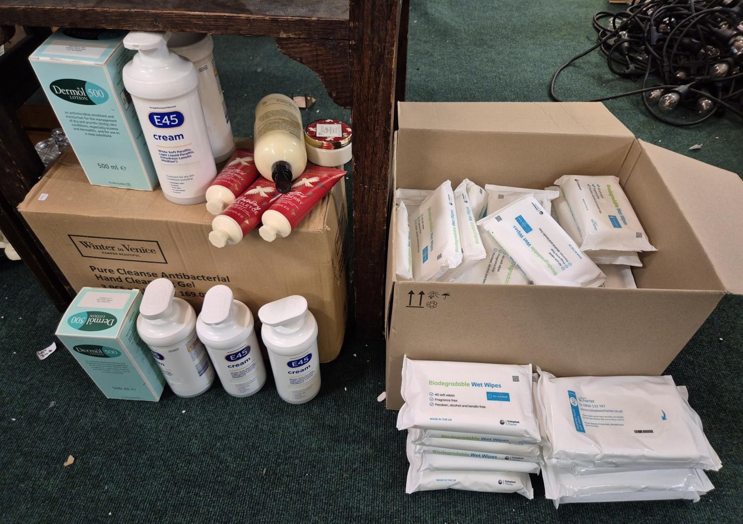 LARGE QTY OF WET WIPES, 5X 500G E45 CREAM (ALL IN DATE) 3X DERMOL 500 LOTION, VARIOUS TOILETRIES AND 3X ANTI BACTERIAL GEL