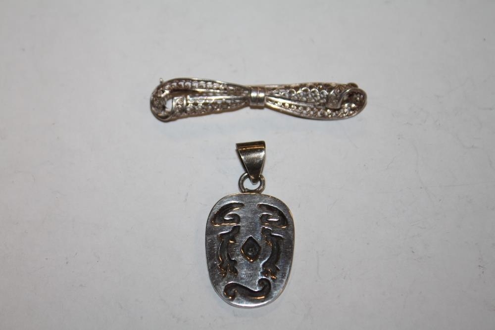 A SILVER BOW TIE SHAPED BROOCH TOGETHER WITH A PENDANT