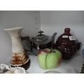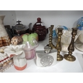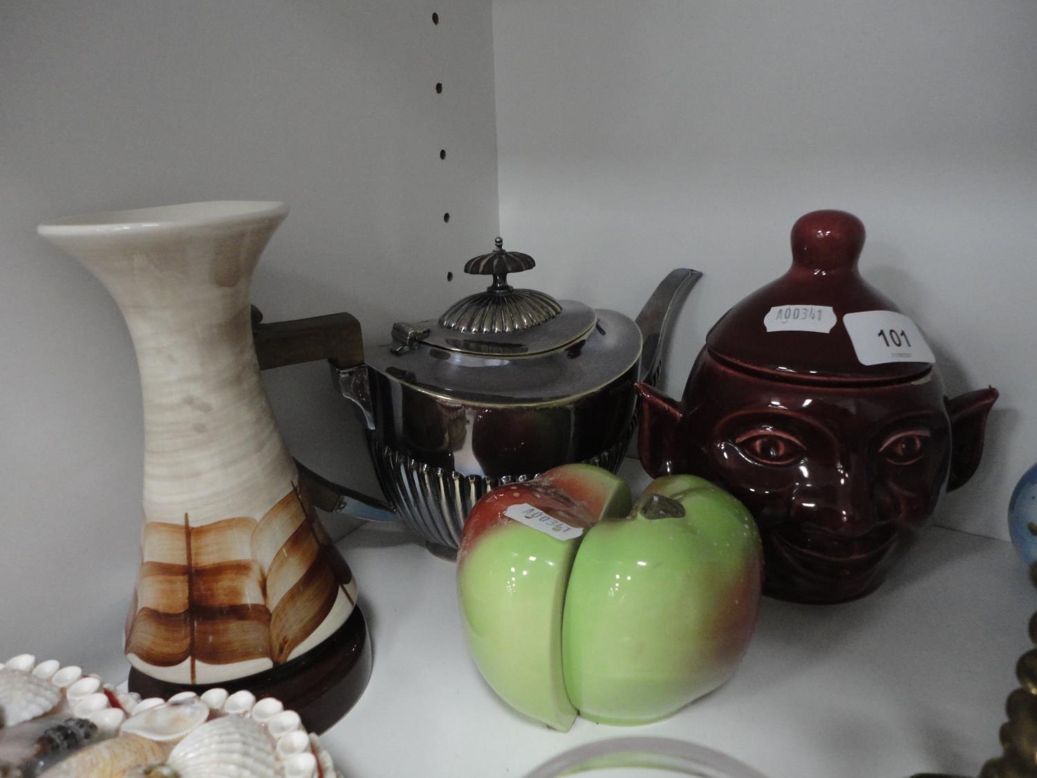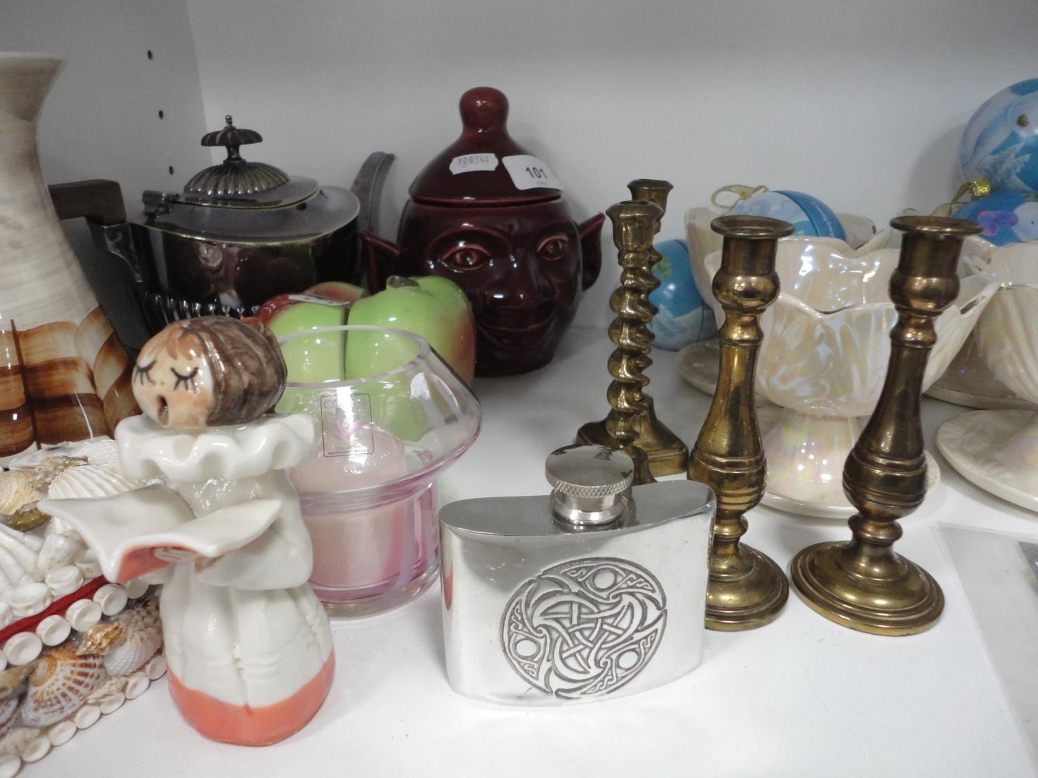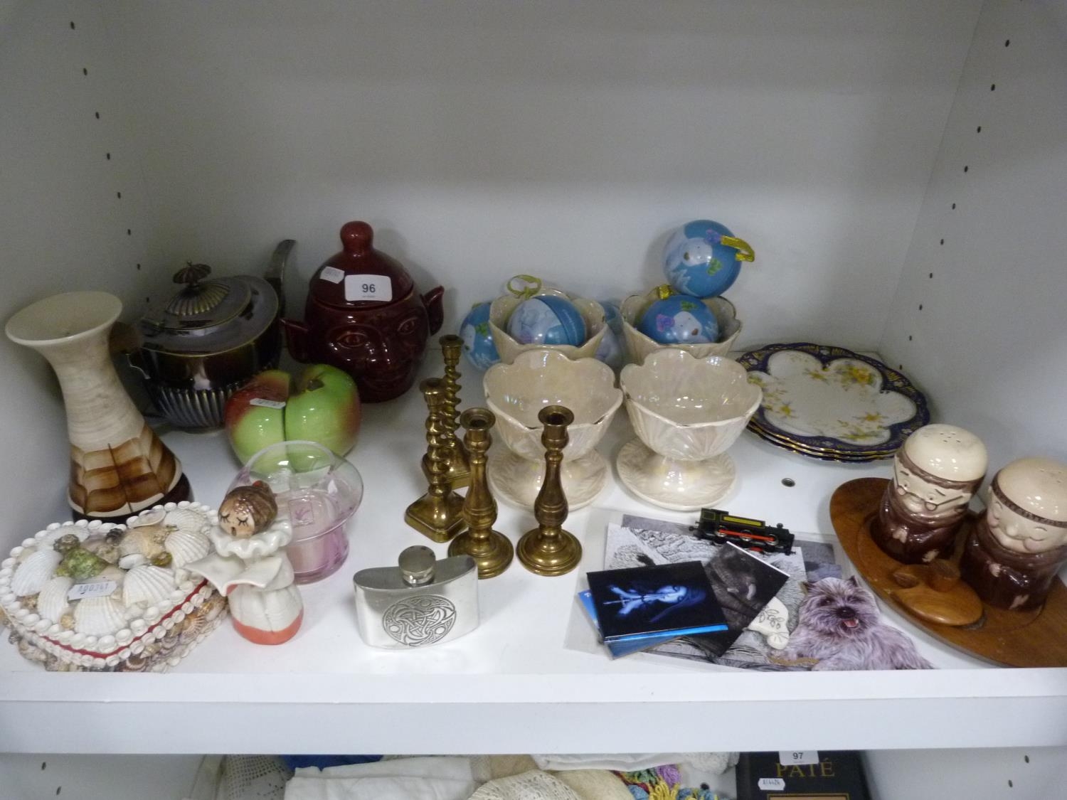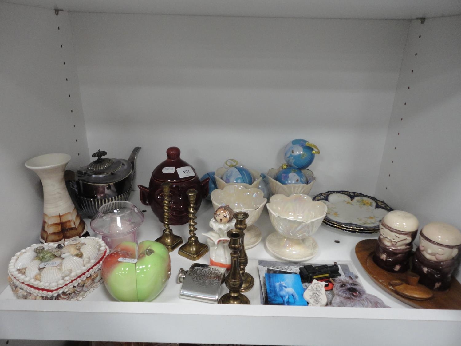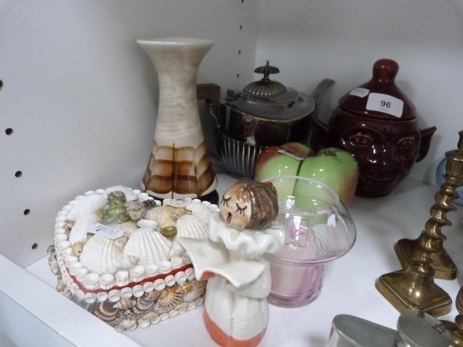Novelty jar and cover, sugar dispenser modelled as an apple, four sundae dishes, china plates, novelty salt and pepper, faux shell-decorated box, Jersey Ware vase, EP teapot, small brass candlesticks etc.