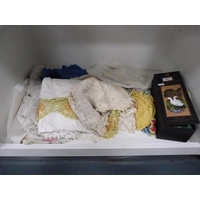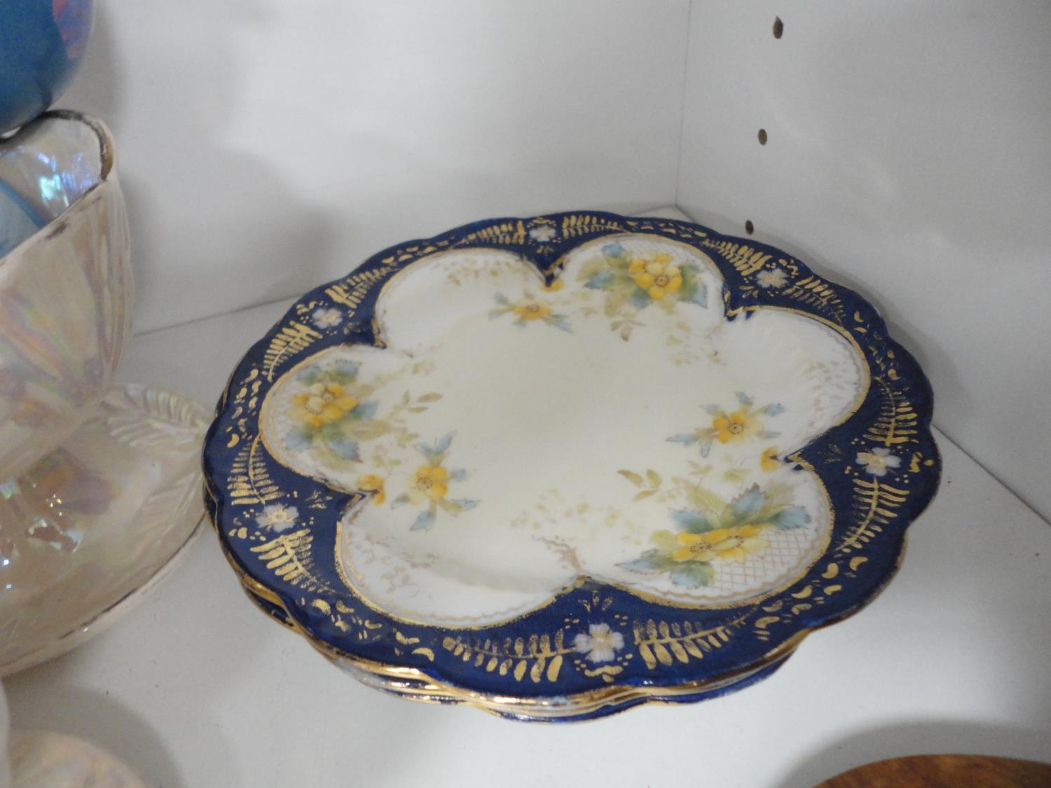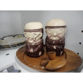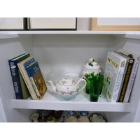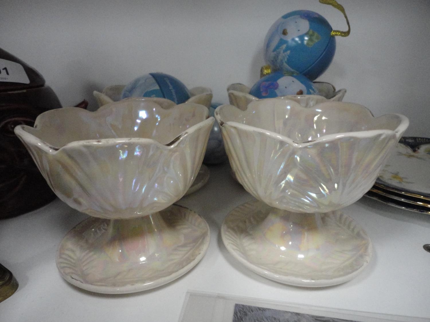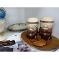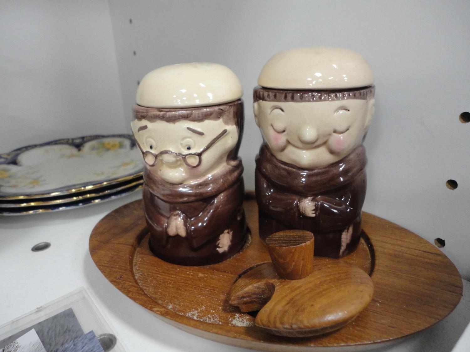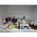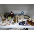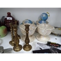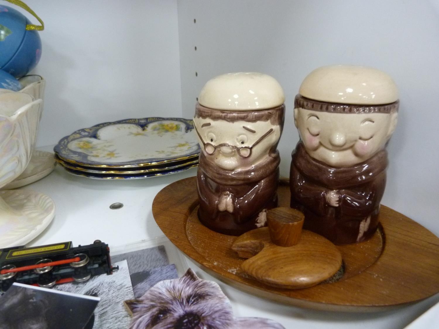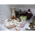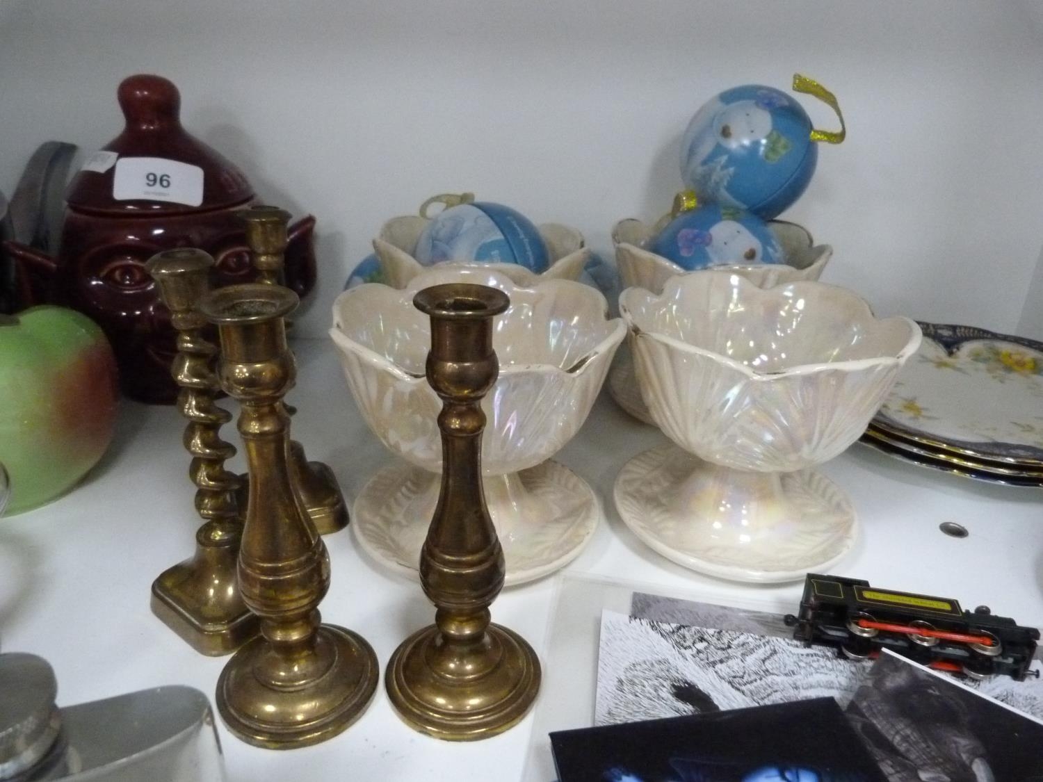Novelty jar and cover, sugar dispenser modelled as an apple, four sundae dishes, china plates, novelty salt and pepper, faux shell-decorated box, Jersey Ware vase, EP teapot, small brass candlesticks etc.