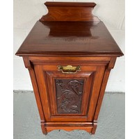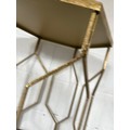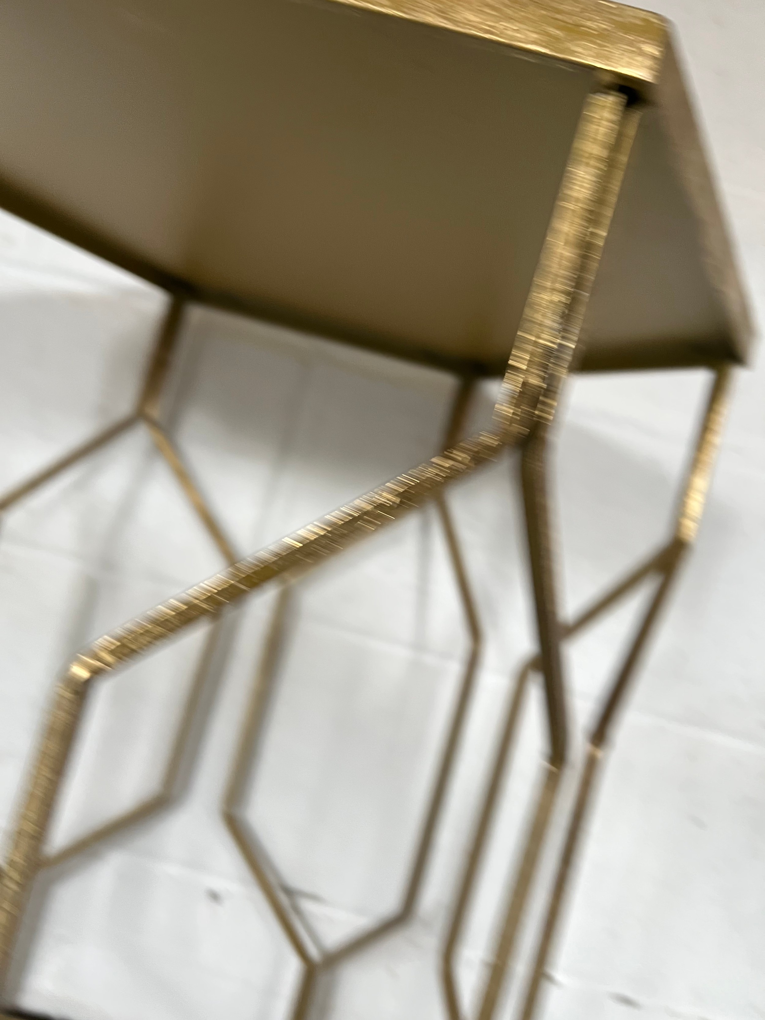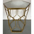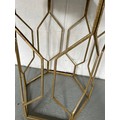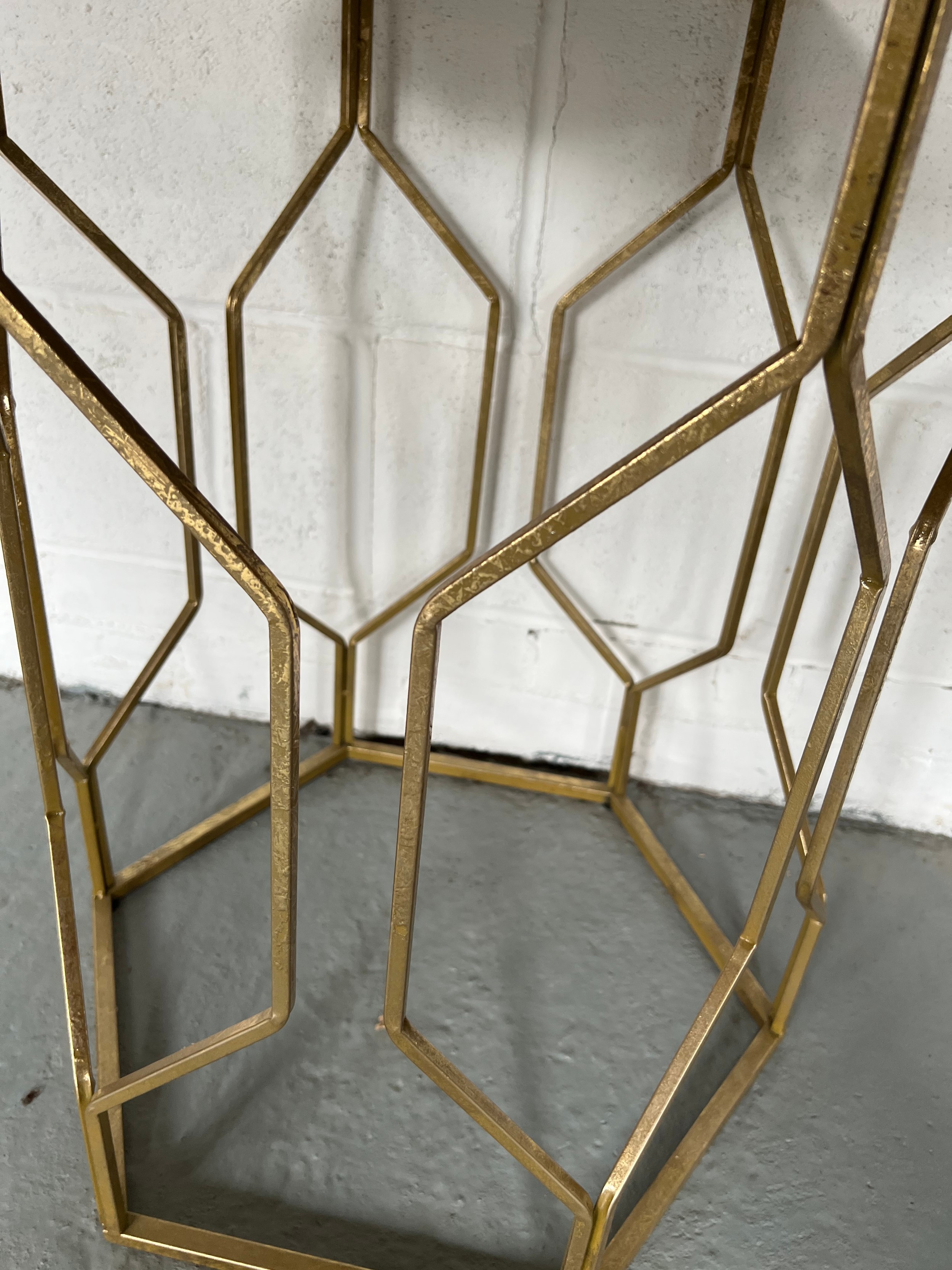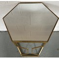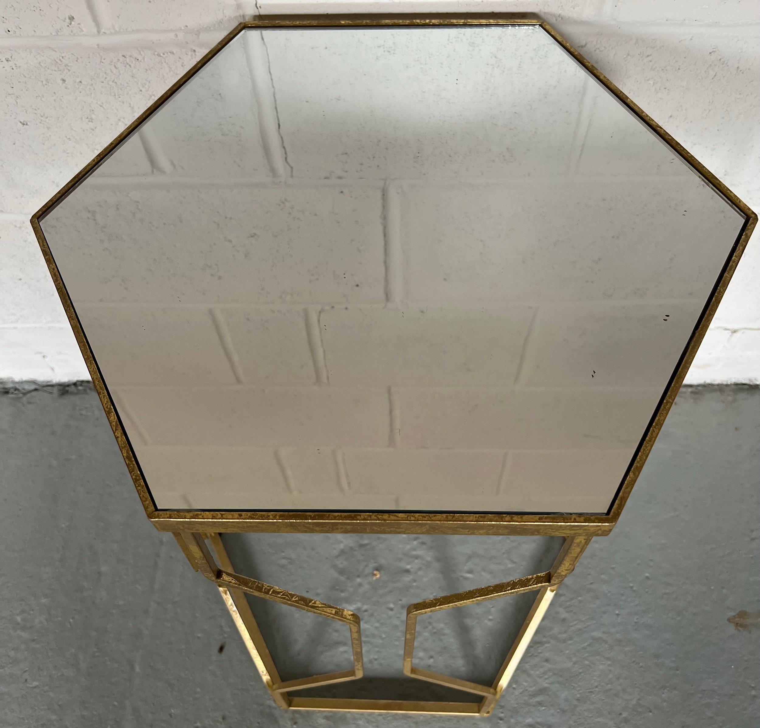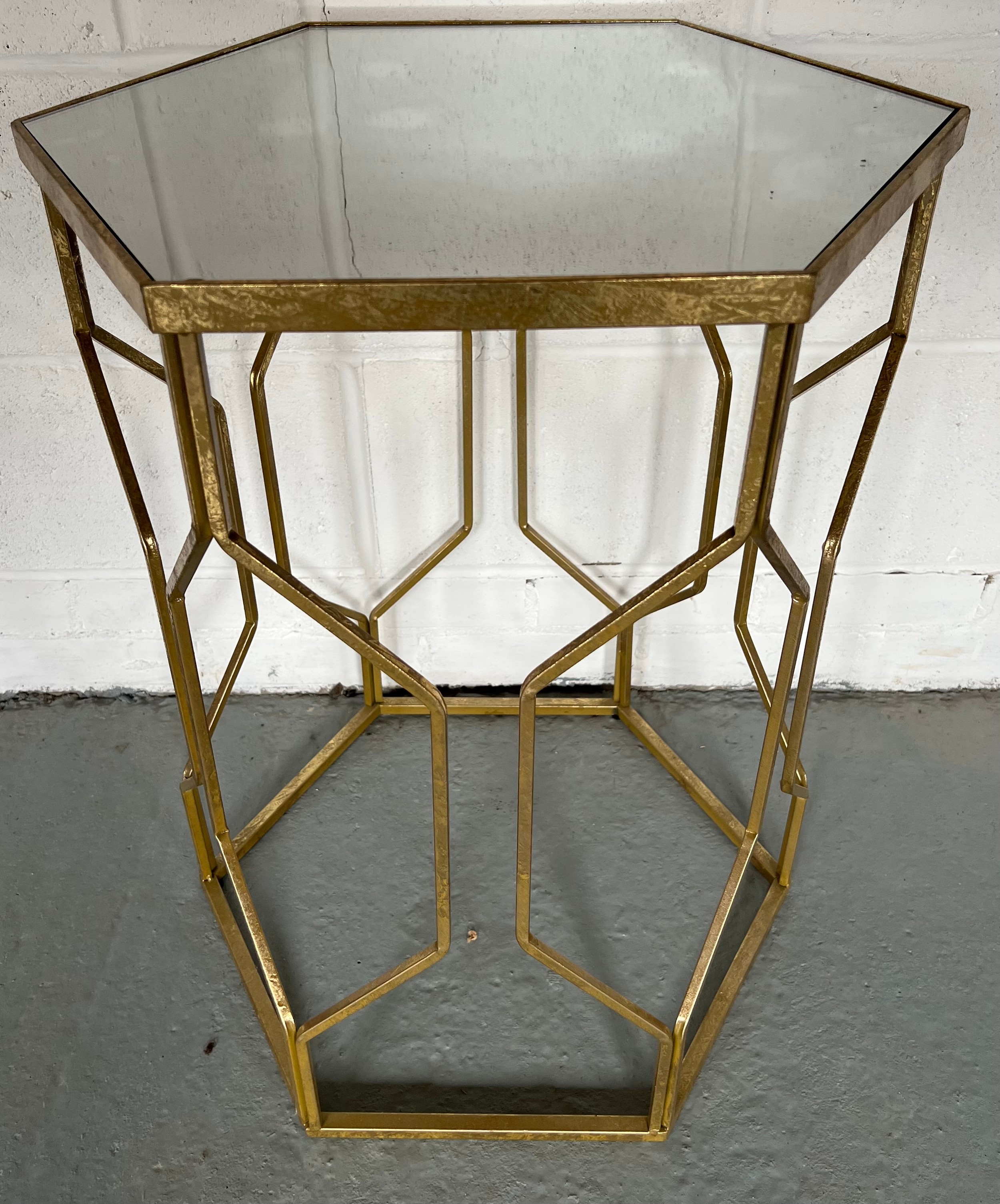A metal framed hexagon side table with mirror top. Top 45cm d x 85cm h.