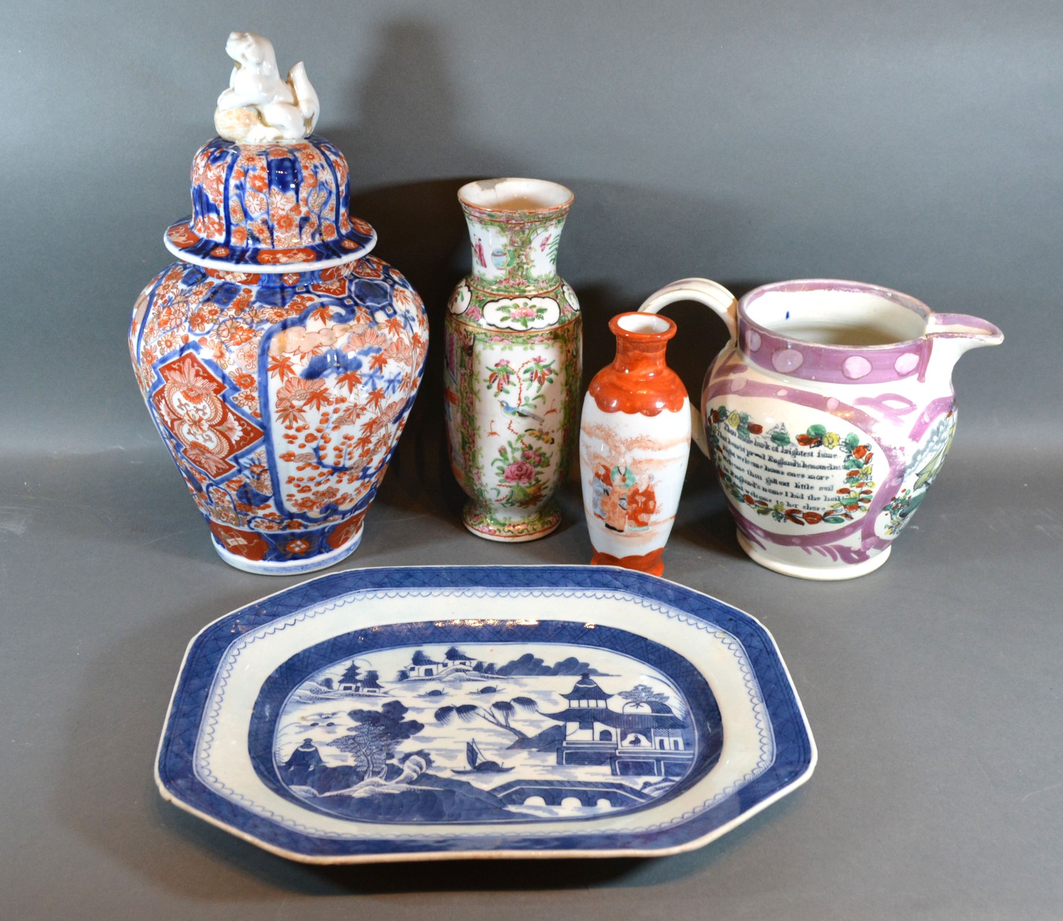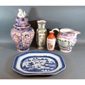 A 19th Century Imari Covered Vase together with a Lustre Ware Jug, two vases and a blue and white meat platter