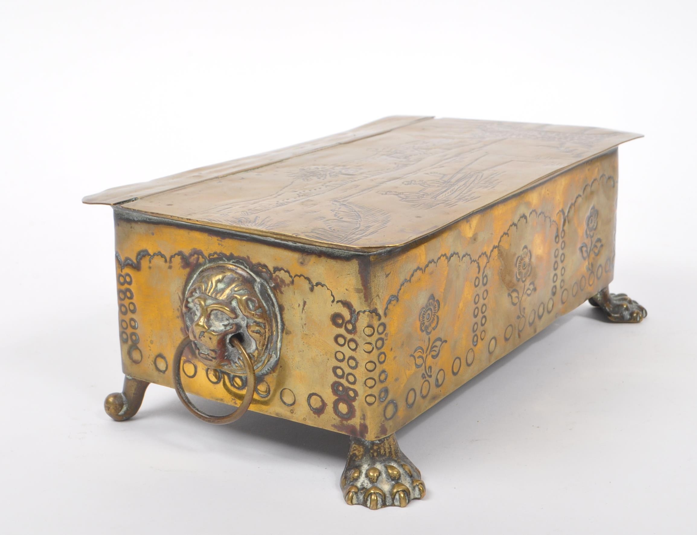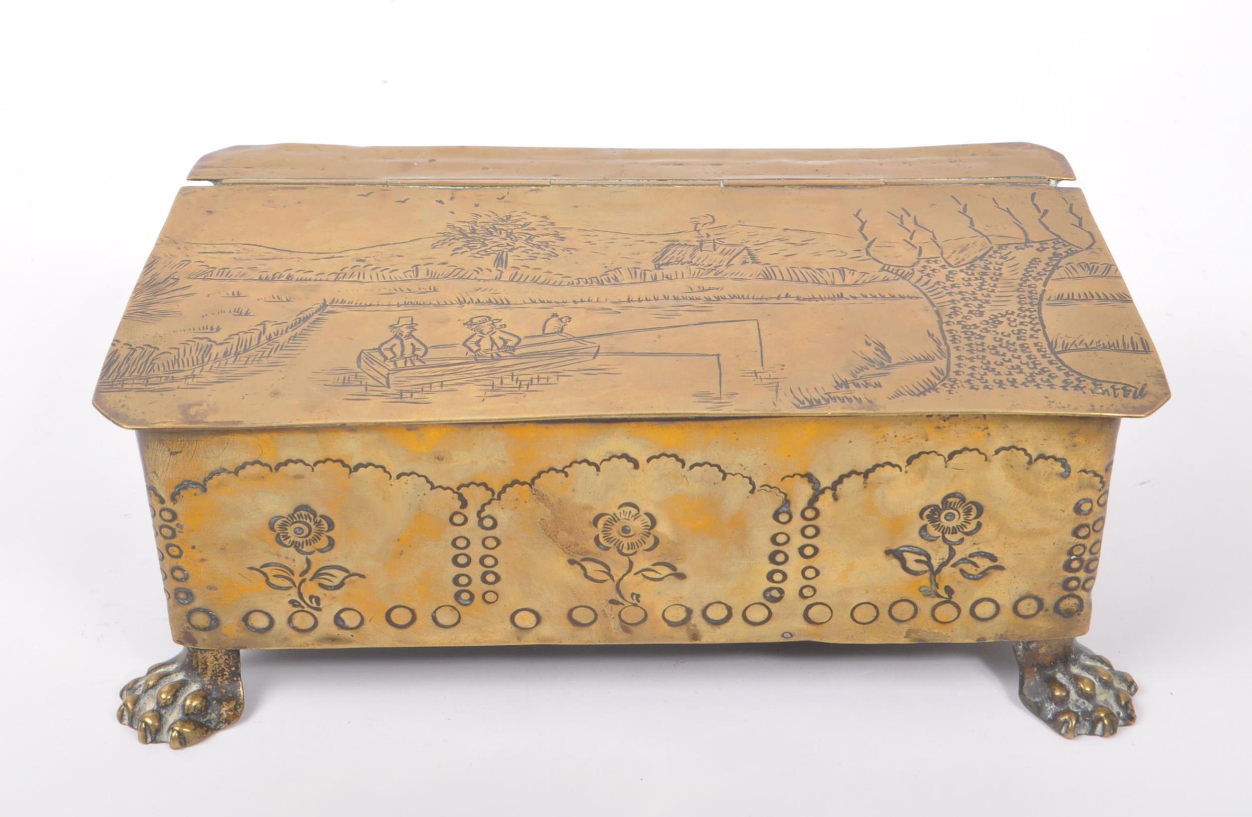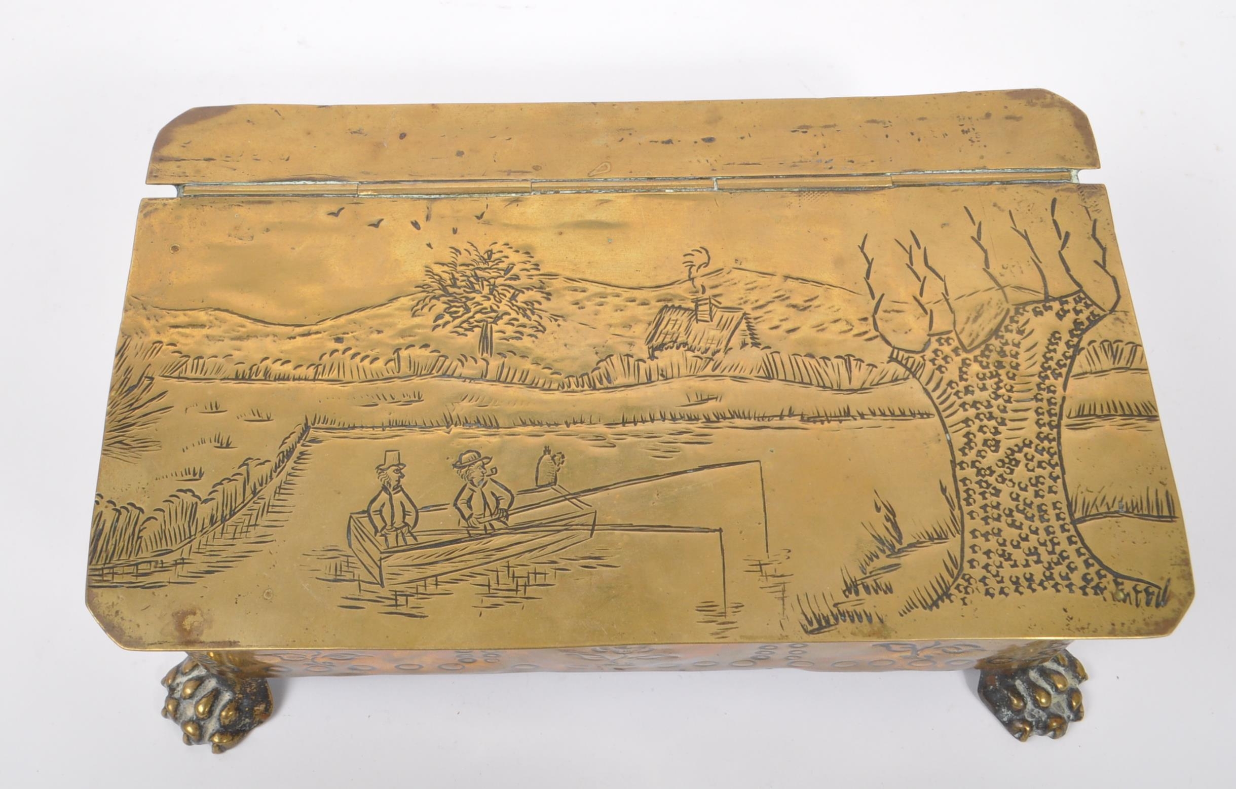A 19th century Dutch brass tobacco tin / box. The box raised on paw feet to front, with lions head ring handles to sides. Having an etched fishing scene to top, with hinged lid. Decorated with repeating floral decoration to sides. Measures approx. 8cm x 21cm x 13cm.