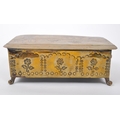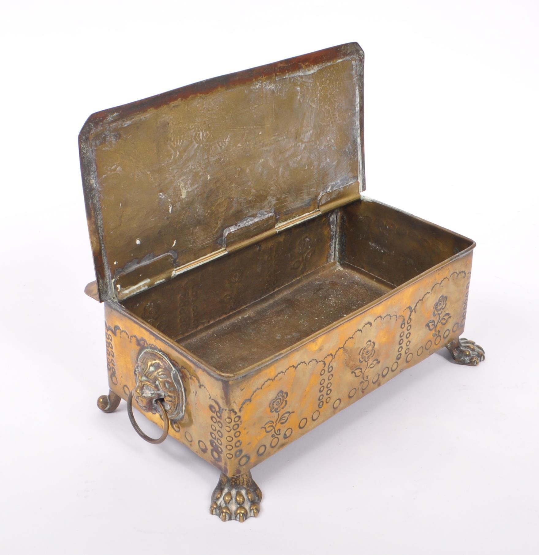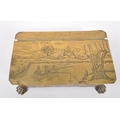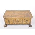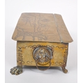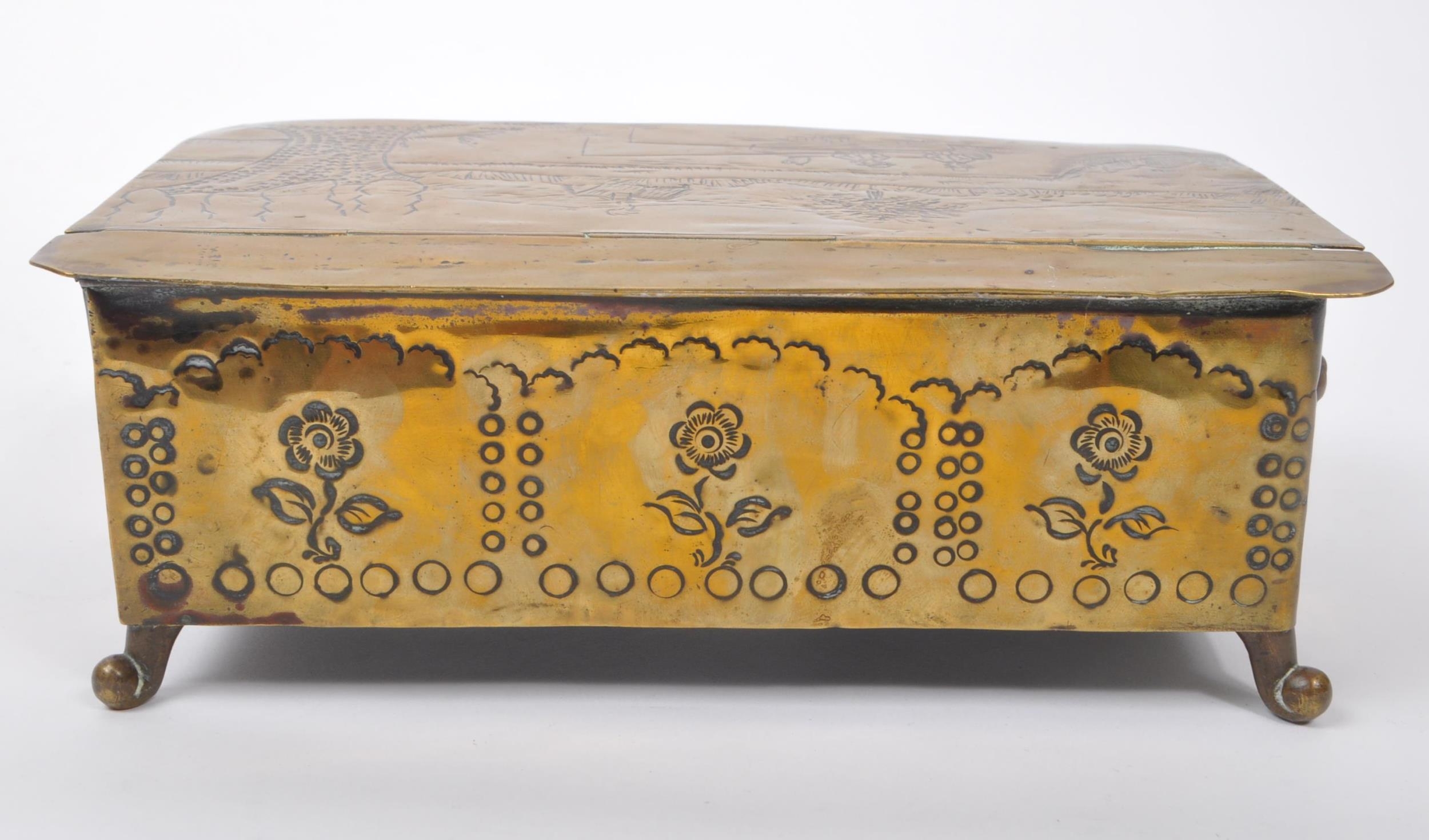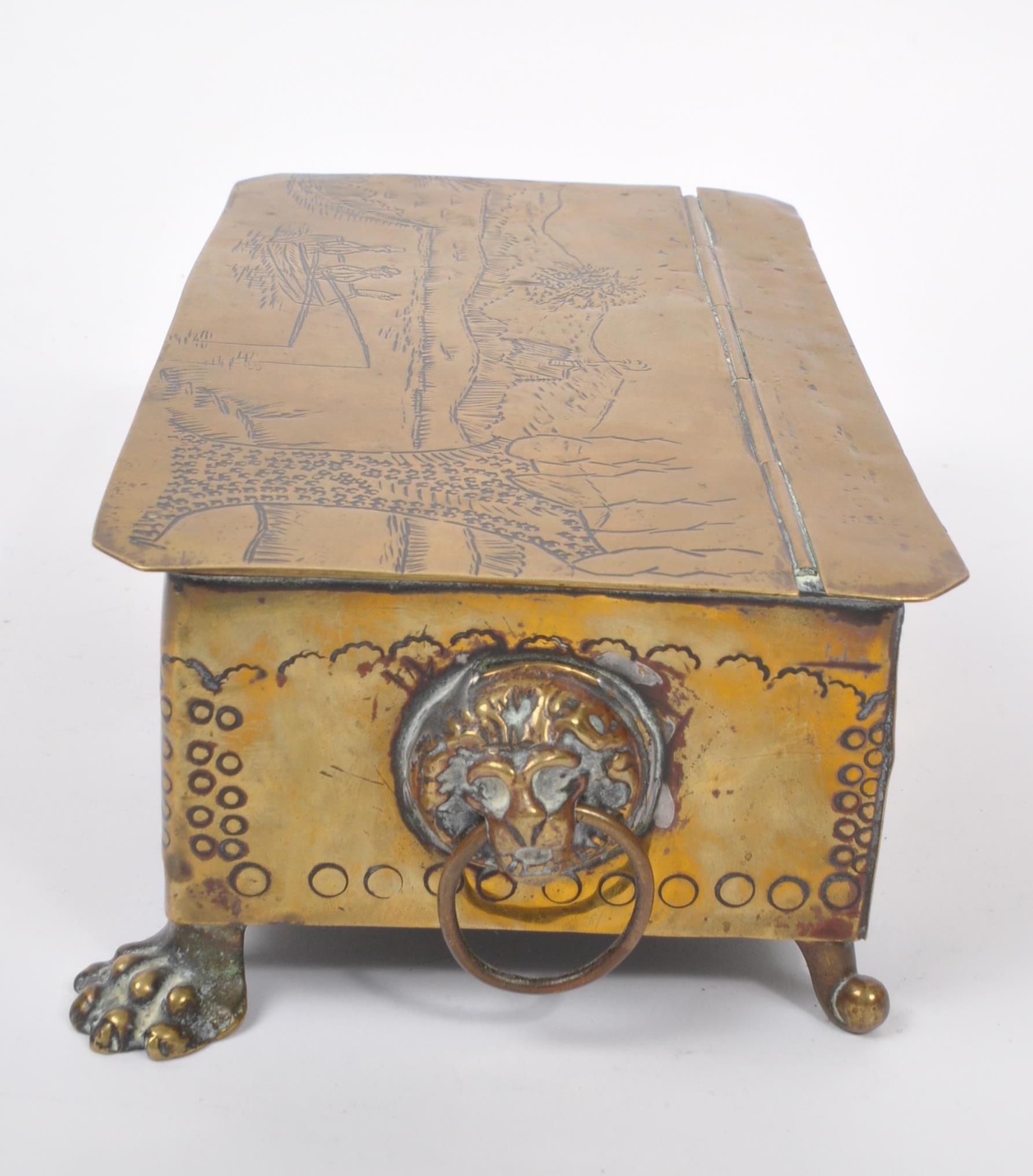 A 19th century Dutch brass tobacco tin / box. The box raised on paw feet to front, with lions head ring handles to sides. Having an etched fishing scene to top, with hinged lid. Decorated with repeating floral decoration to sides. Measures approx. 8cm x 21cm x 13cm.