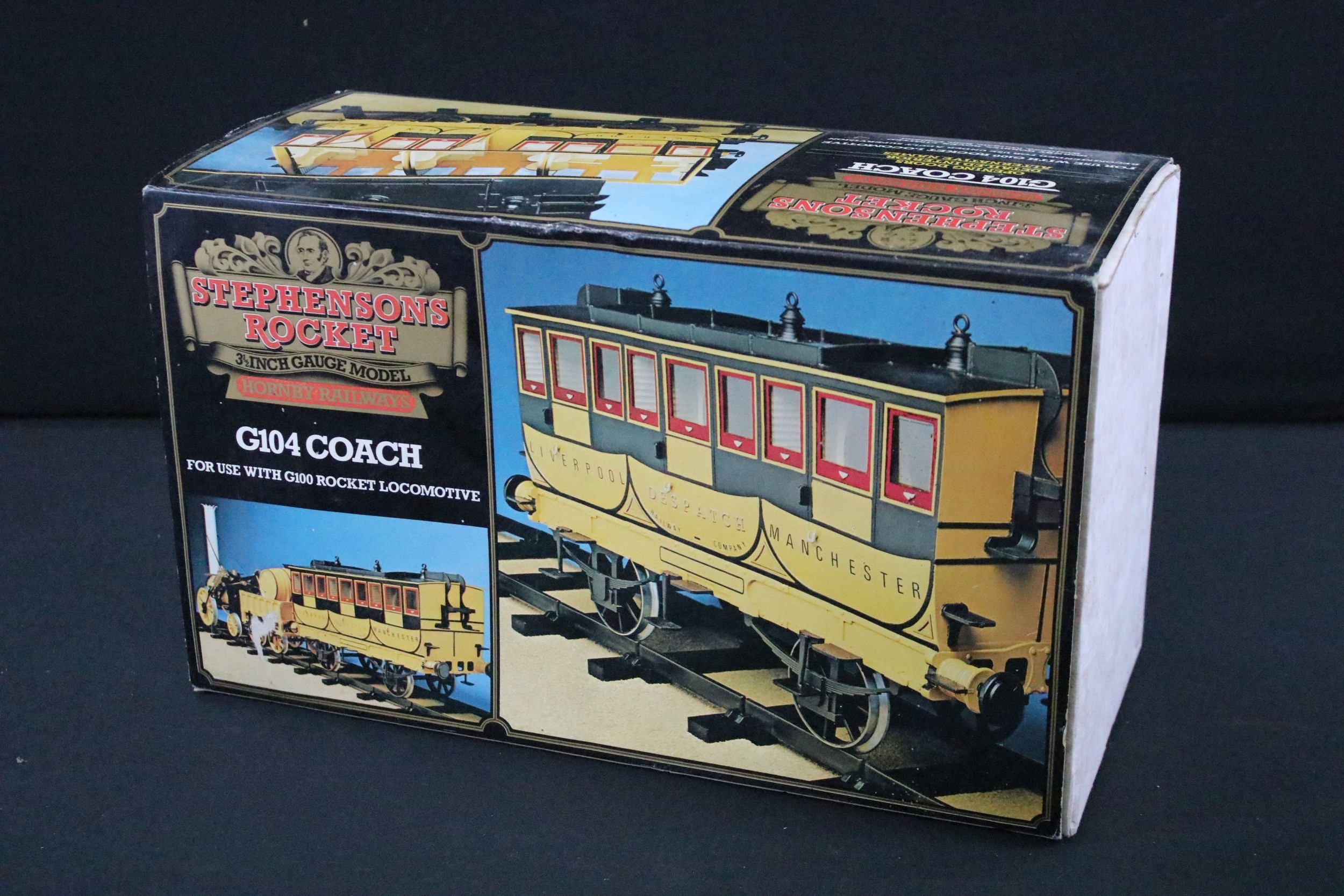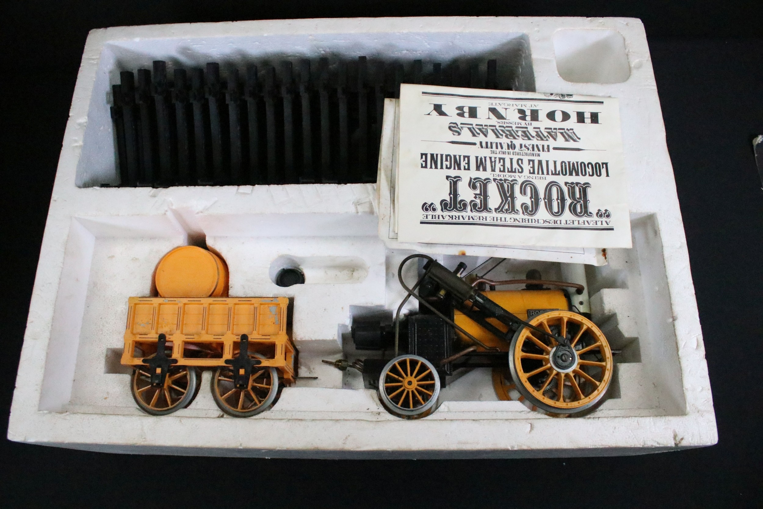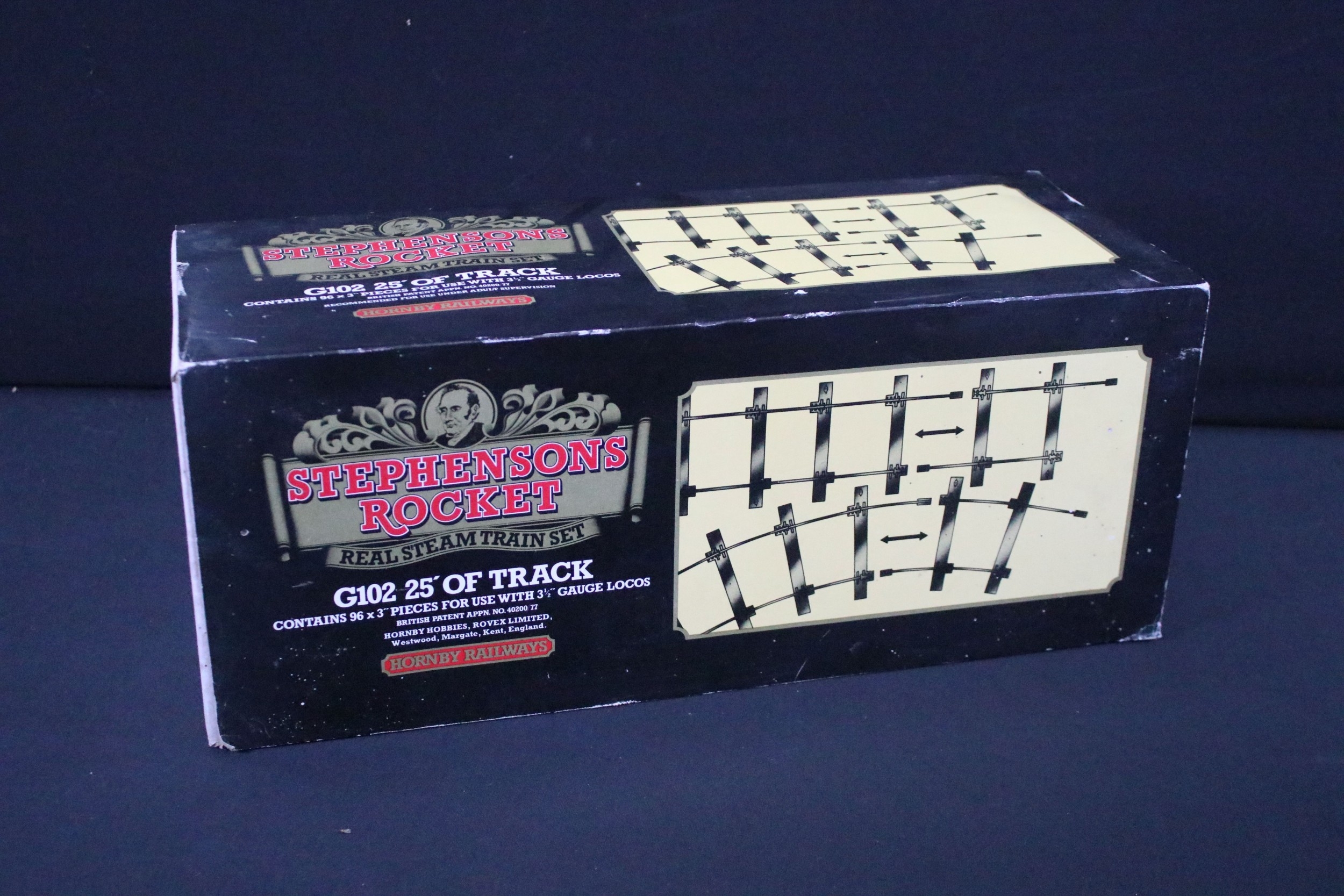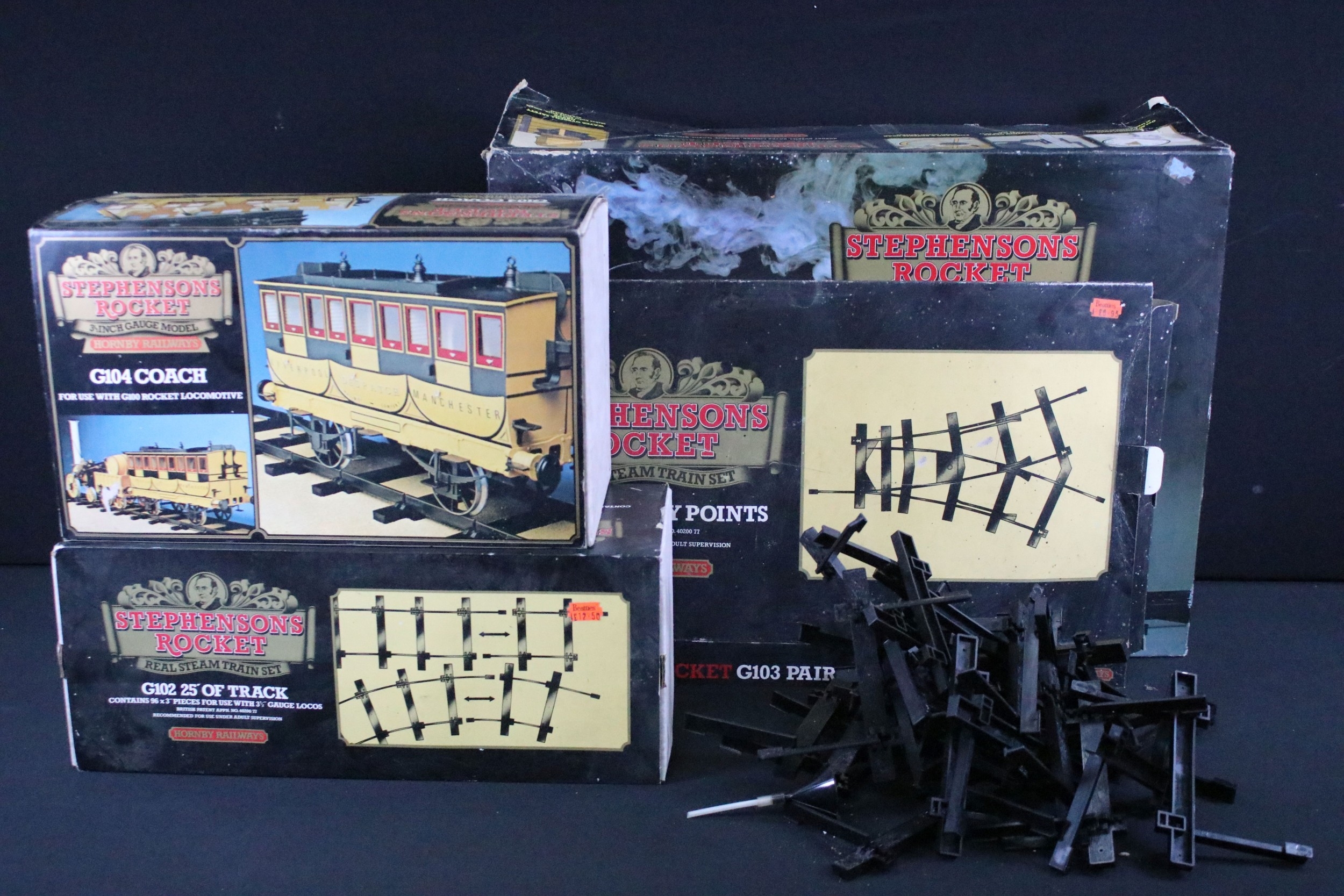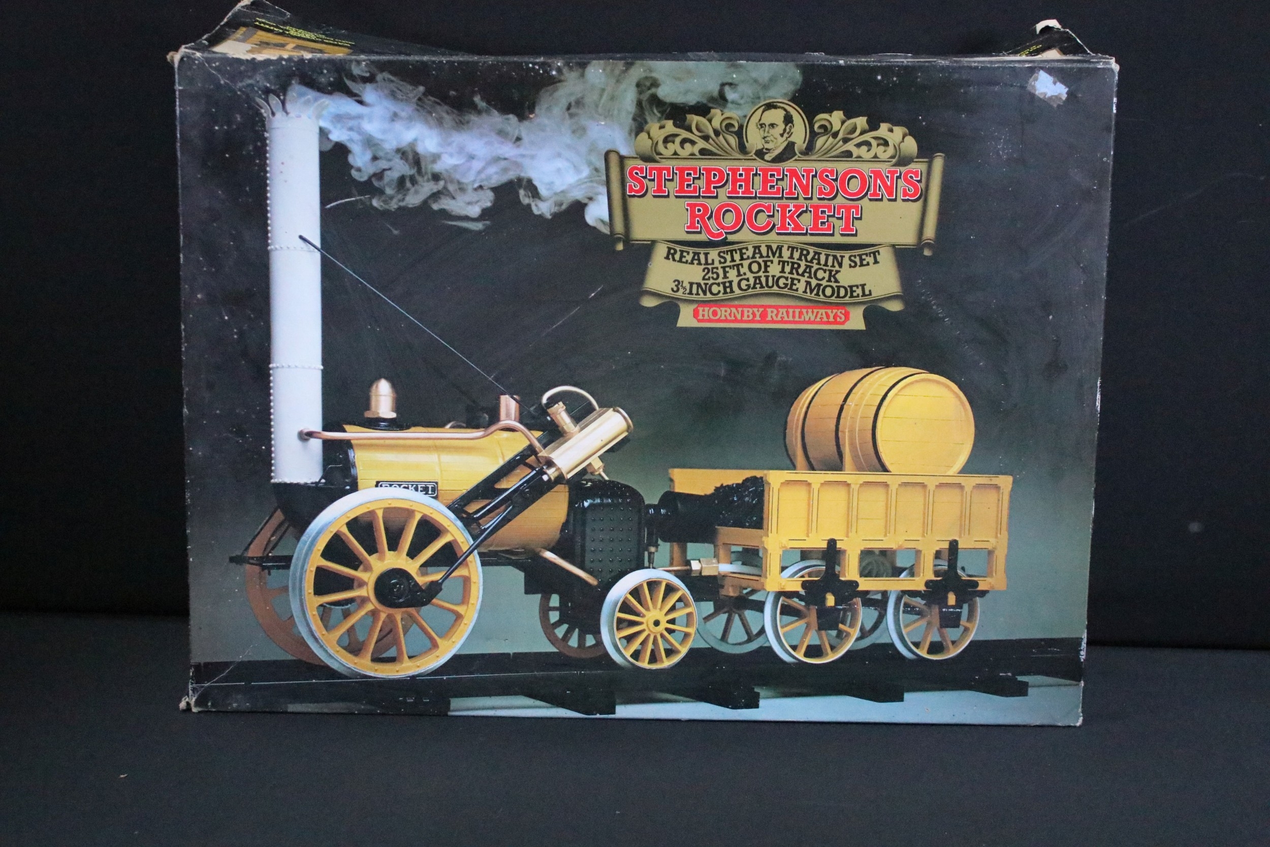 Four boxed 3.5 gauge Hornby Stephensons Rocket items to include Real Steam Train Set, G102 25' Of Track, G104 Coach and G103 Pair Of Y Points, contents vg, boxes showing signs of wear but gd overall