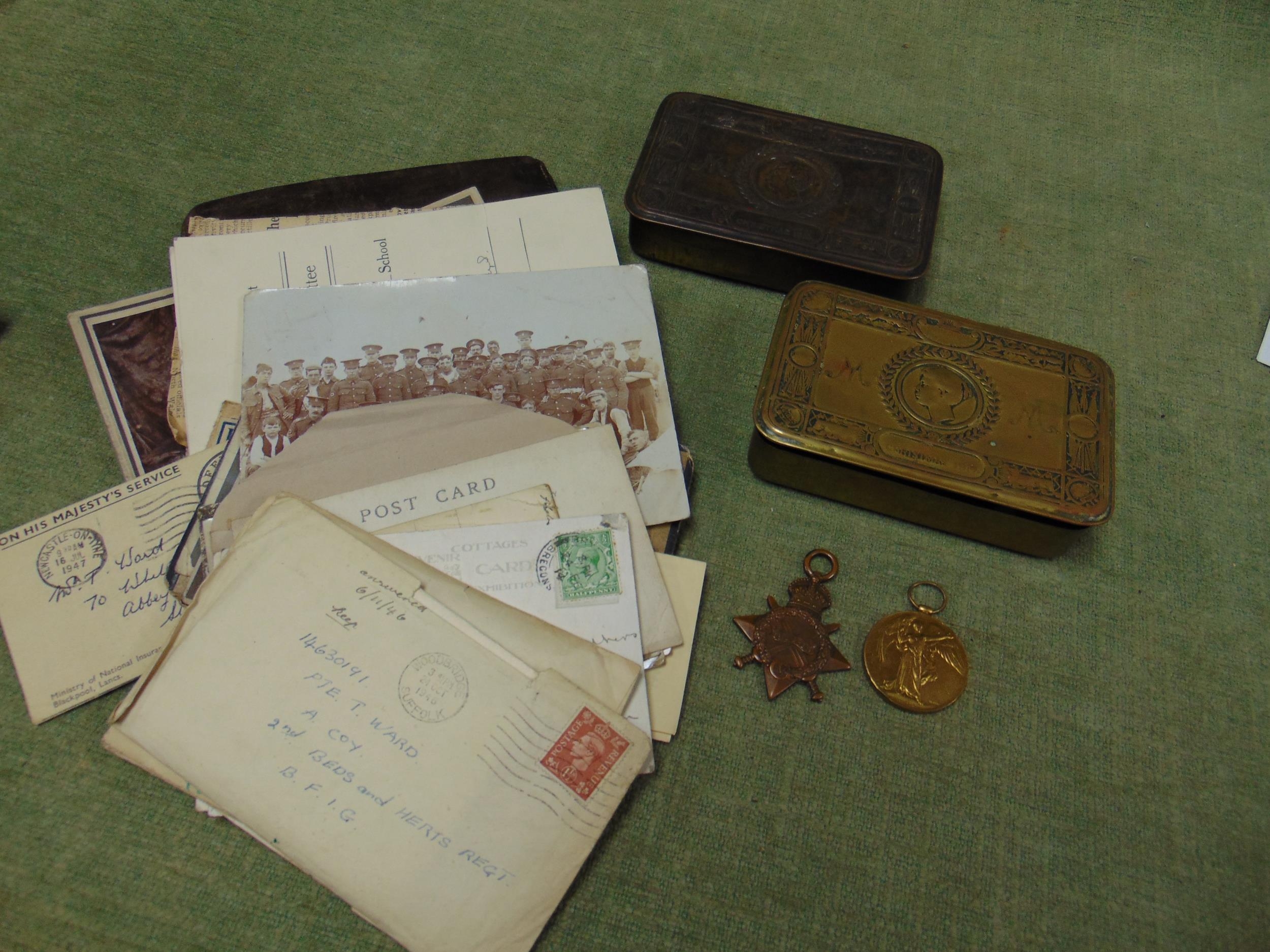 Two Christmas 1915 brass tobacco tins from Princess Mary, WWI 1914 - 15 Star and Victory Medal to 3-16262. Pte. F. Ward. W. Rid. R., with associated papers and photos.