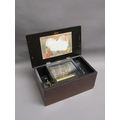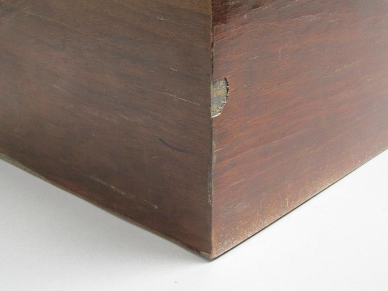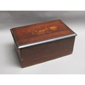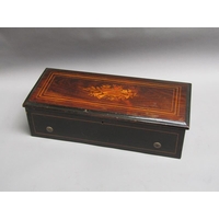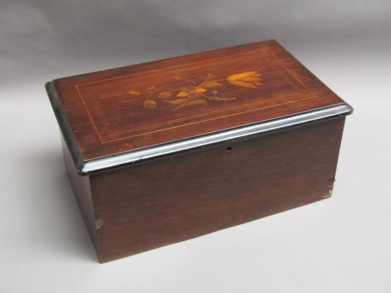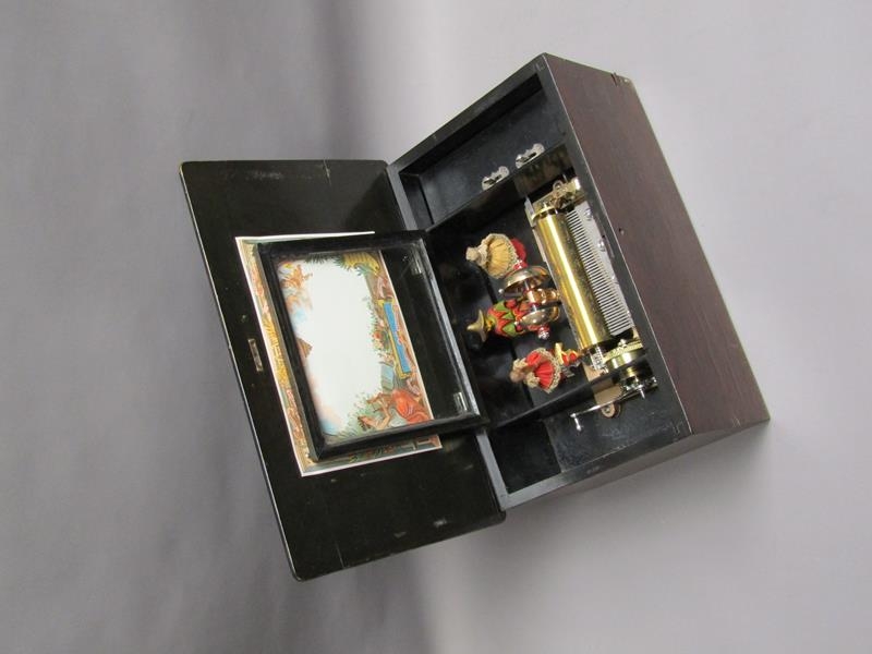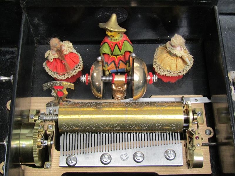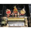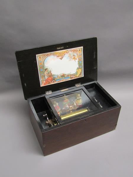A late 19c Swiss music box retailed by Julio Musques of Montevideo. The 16cm long barrel has a comb with forty three teeth and plays eight airs. Behind the barrel are the figures of two pirouetting dancers between which sits the figure of a mandarin playing two bells and turning his head with the music. Next to the barrel is an indicator showing which air is playing. The box has a rosewood finish top with rectangular line inlays and a floral inlay to the centre. The lid has a replacement tune-paper inside it, but without the names of the tunes played. The box is 46cm w overall.
