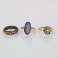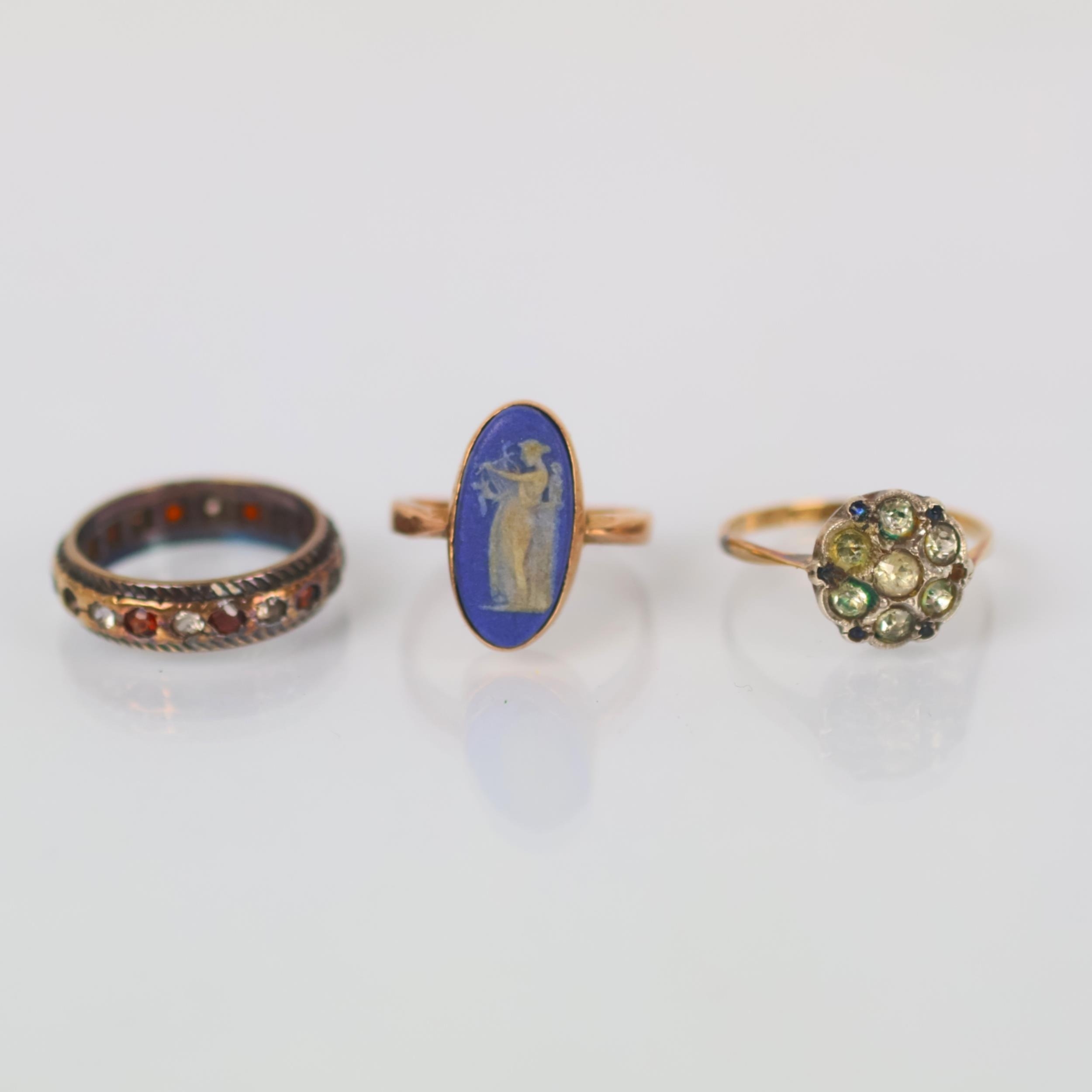 A group of three rings, including a 9ct gold Wedgwood plaque ring, hallmarked to interior for Chester, ring size H, with a 9ct gold dress ring, ring size I and further yellow meal dress ring, gross weight 6.7gms (3)