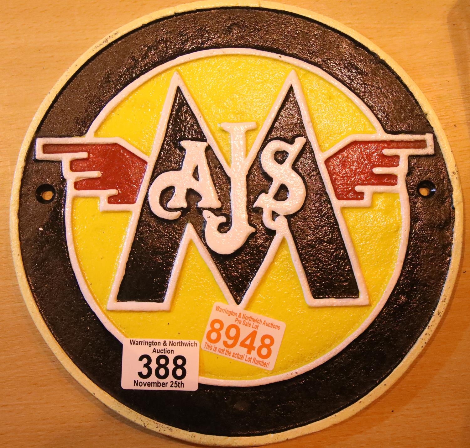 Cast iron AJS sign, D: 23 cm. P&P Group 1 (£14+VAT for the first lot and £1+VAT for subsequent lots)