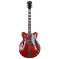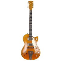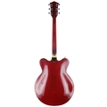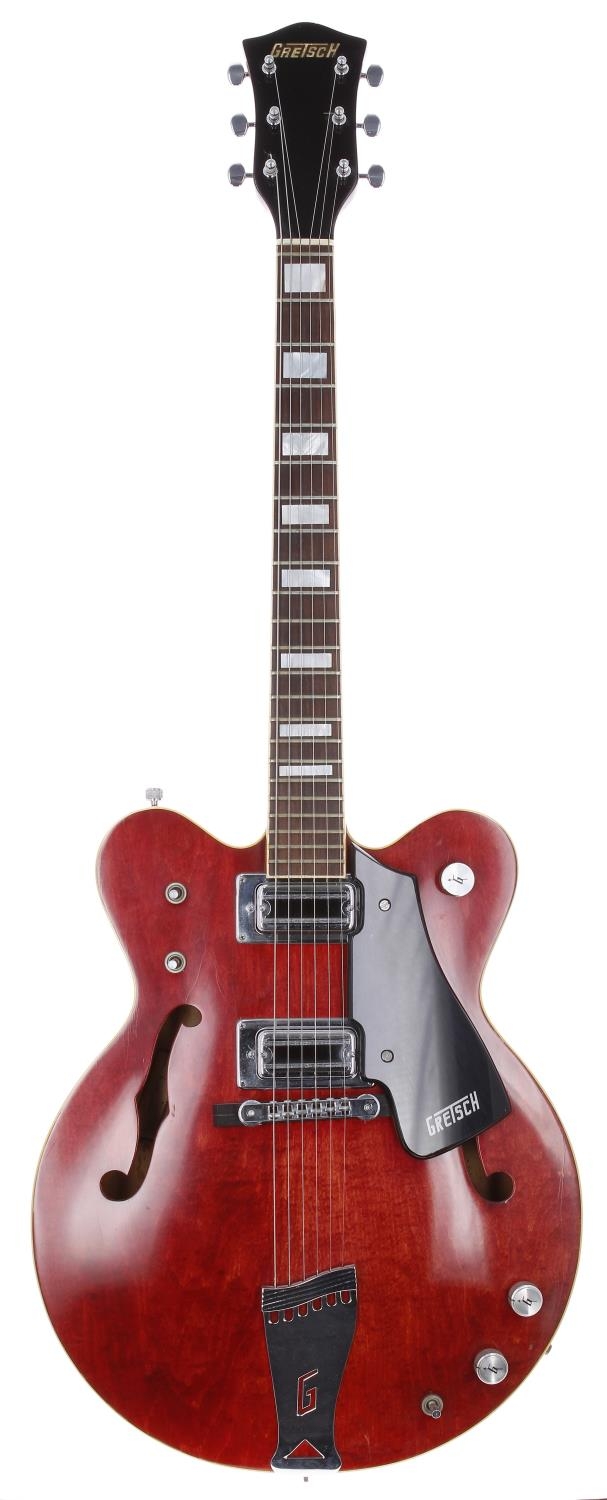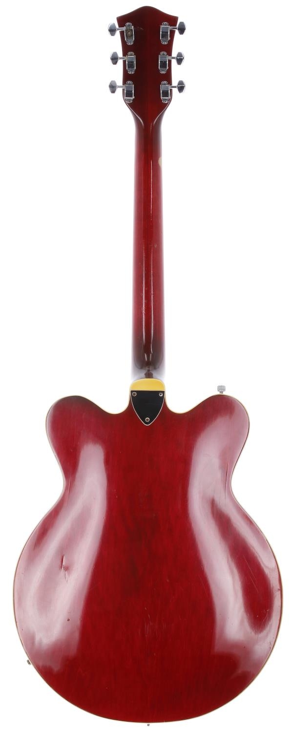1973 Gretsch 7566 Streamliner semi-hollow body electric guitar, made in USA; Body: red finish, light checking and minor dings, light surface buckle scratching to centre back; Neck: light dings and marks but generally good; Fretboard: rosewood; Frets: generally good, light wear to first position, some tarnishing; Electrics: working; Hardware: generally good; Case: original hard case; Weight: 4.15kg; Overall condition: good for age