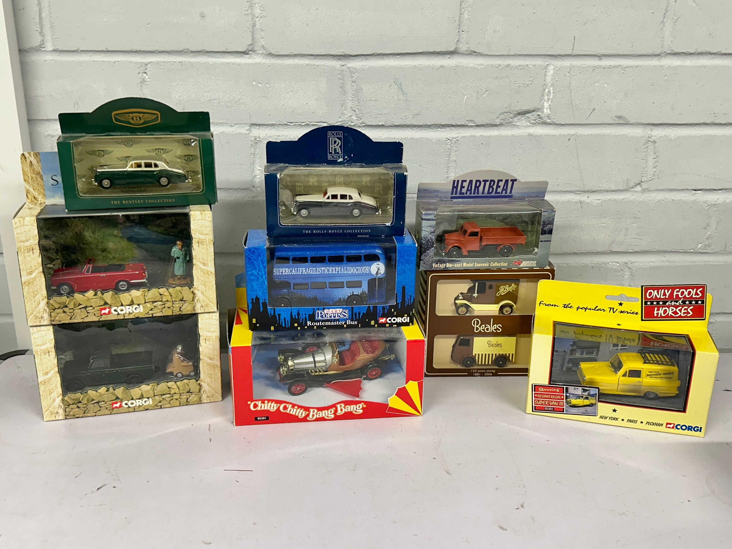 Corgi 05201 Only Fools and Horse reliant regal together with Corgi 05301 Chitty Chitty Bang Bang, two Corgi last of the Summer Wine sets, Mary Poppins Bus etc
