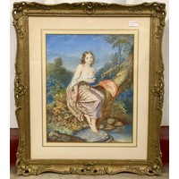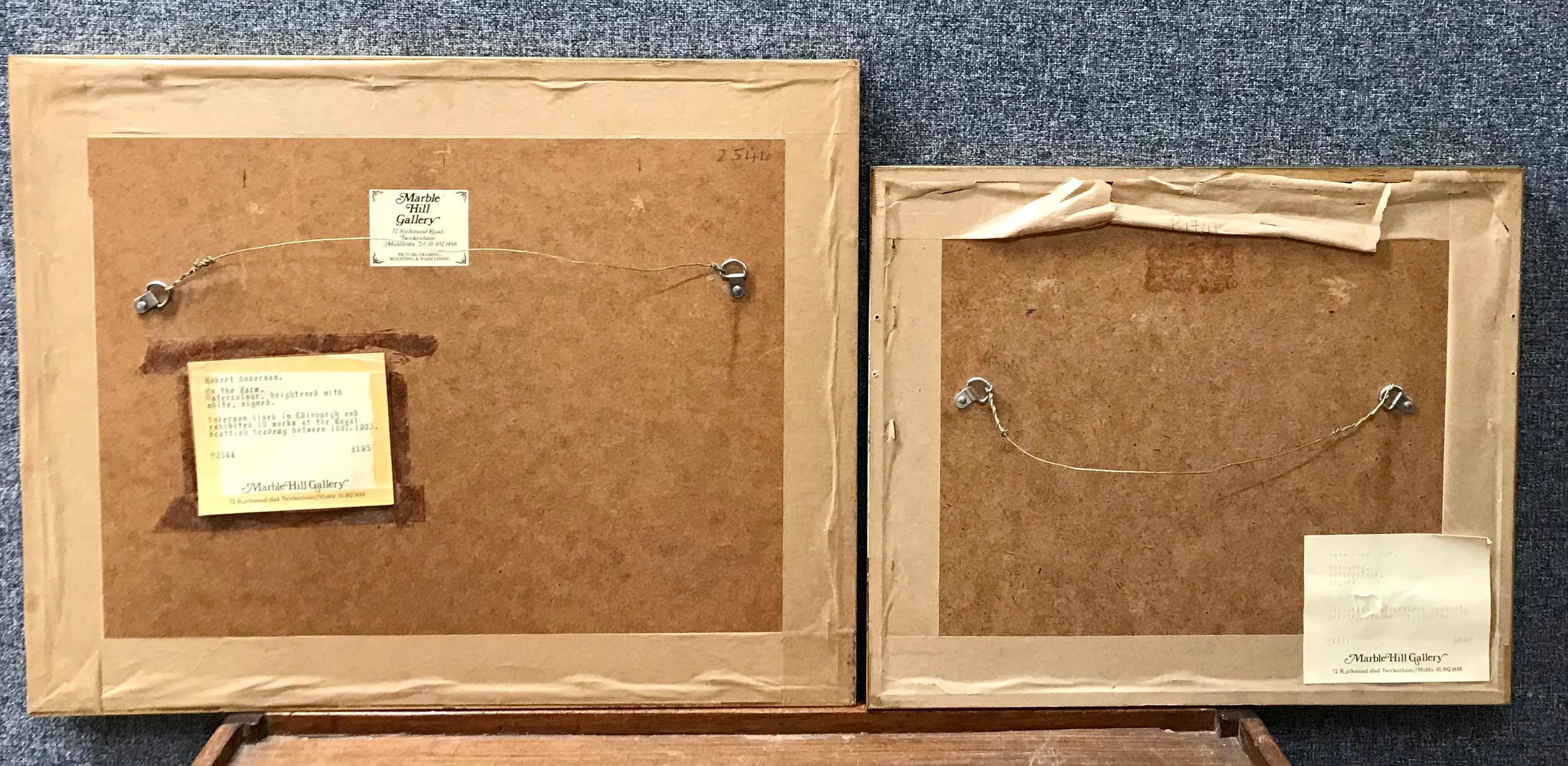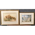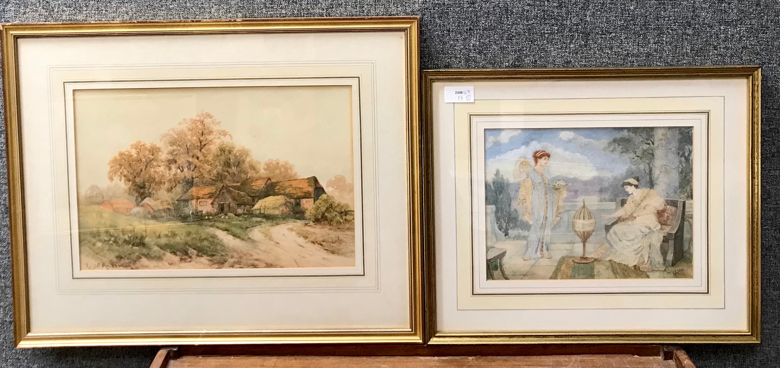 Robert Anderson, farming landscape with a barn beside a country lane, watercolour and a Pre-Raphaelite watercolour depitcing lady's weaving on a balcony, framed
