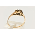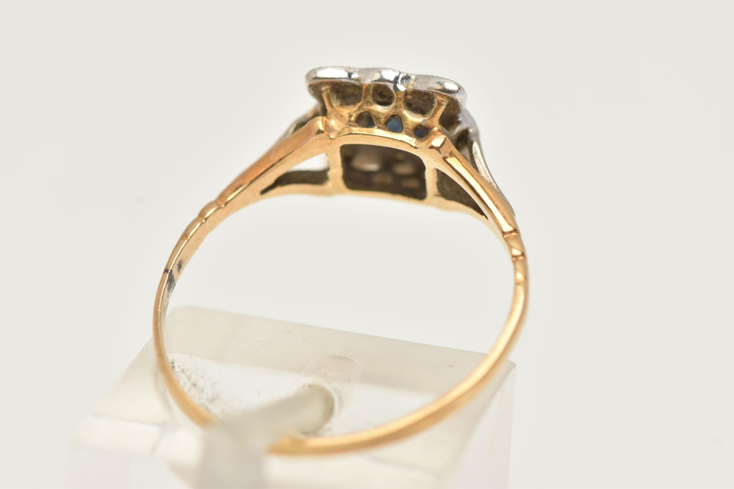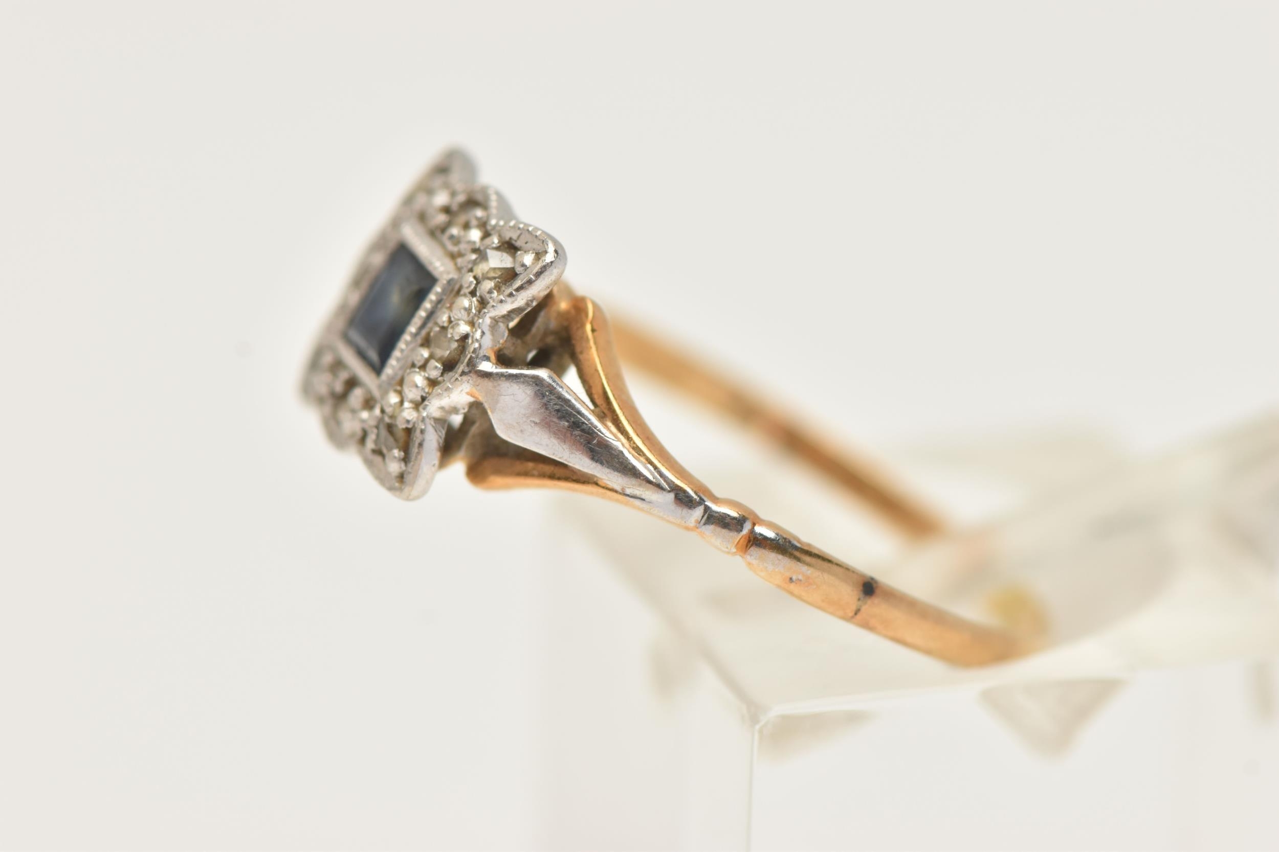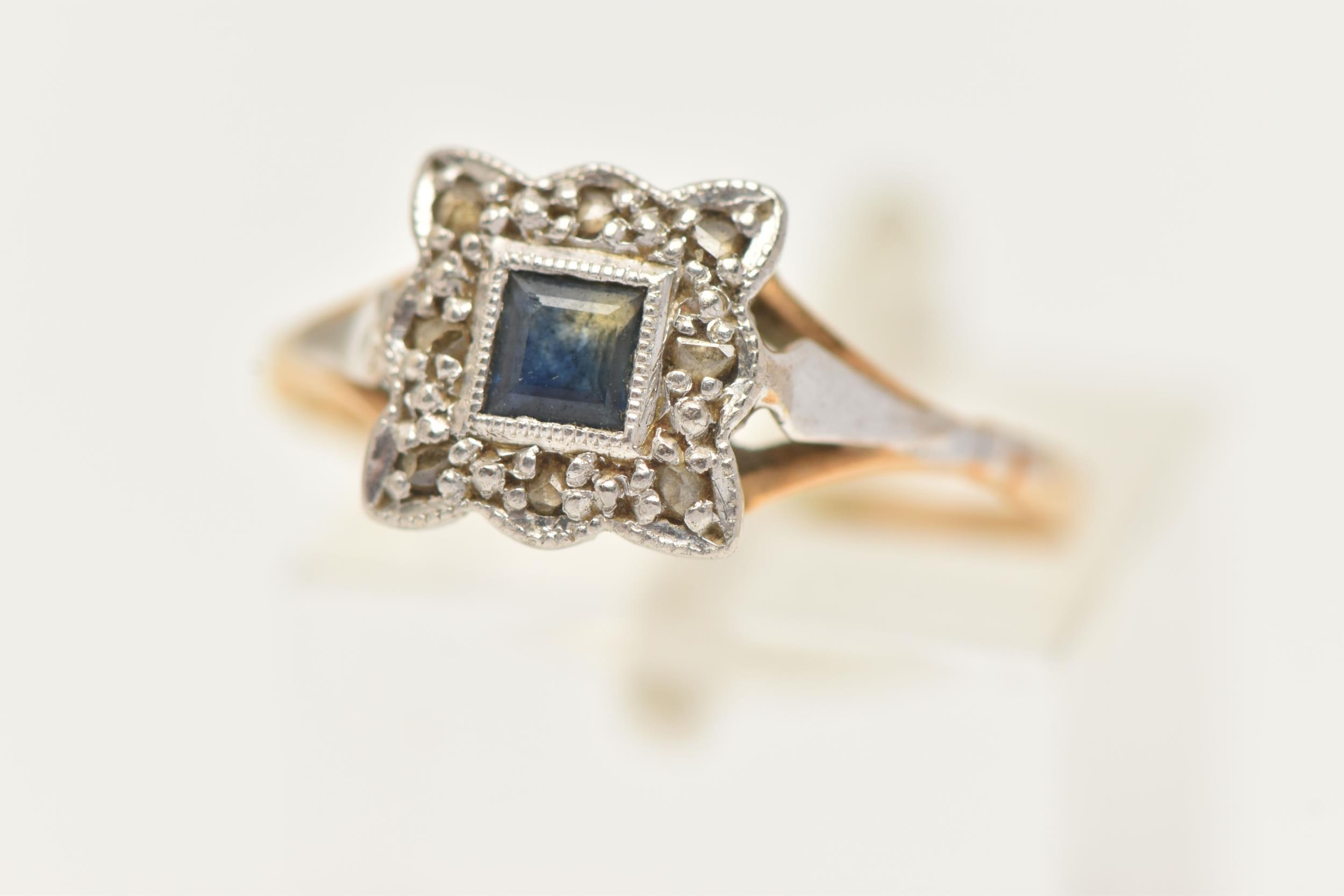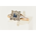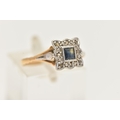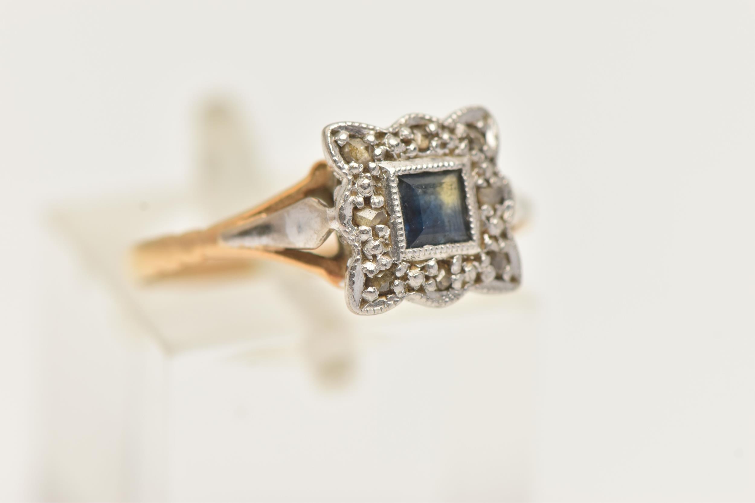 A YELLOW METAL SAPPHIRE AND DIAMOND CLUSTER RING, of a square form, set with a central square cut blue sapphire, in a surround of rose cut diamonds, set in a white metal mount, leading onto a polished yellow metal band, unmarked, band misshapen, approximate gross weight 2.5 grams (condition report: band misshapen will require some attention, stones secure, general wear, signs of a previous ring size alteration)