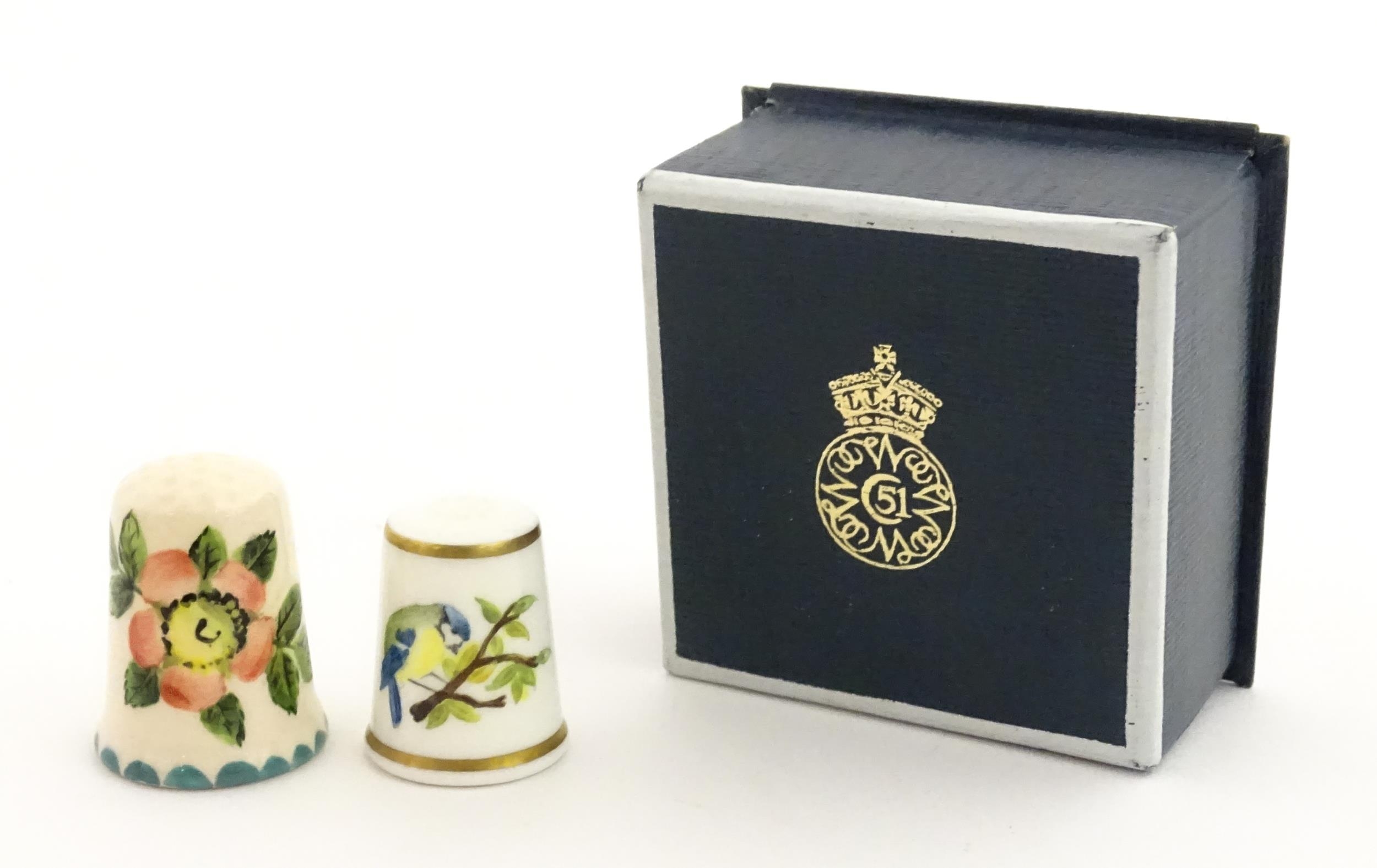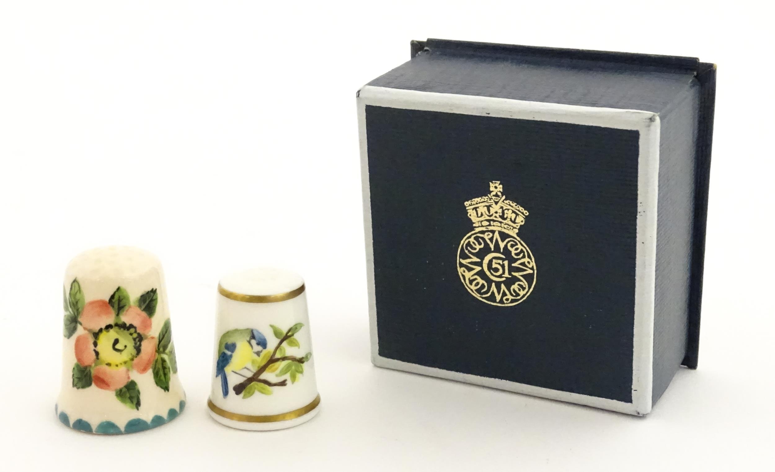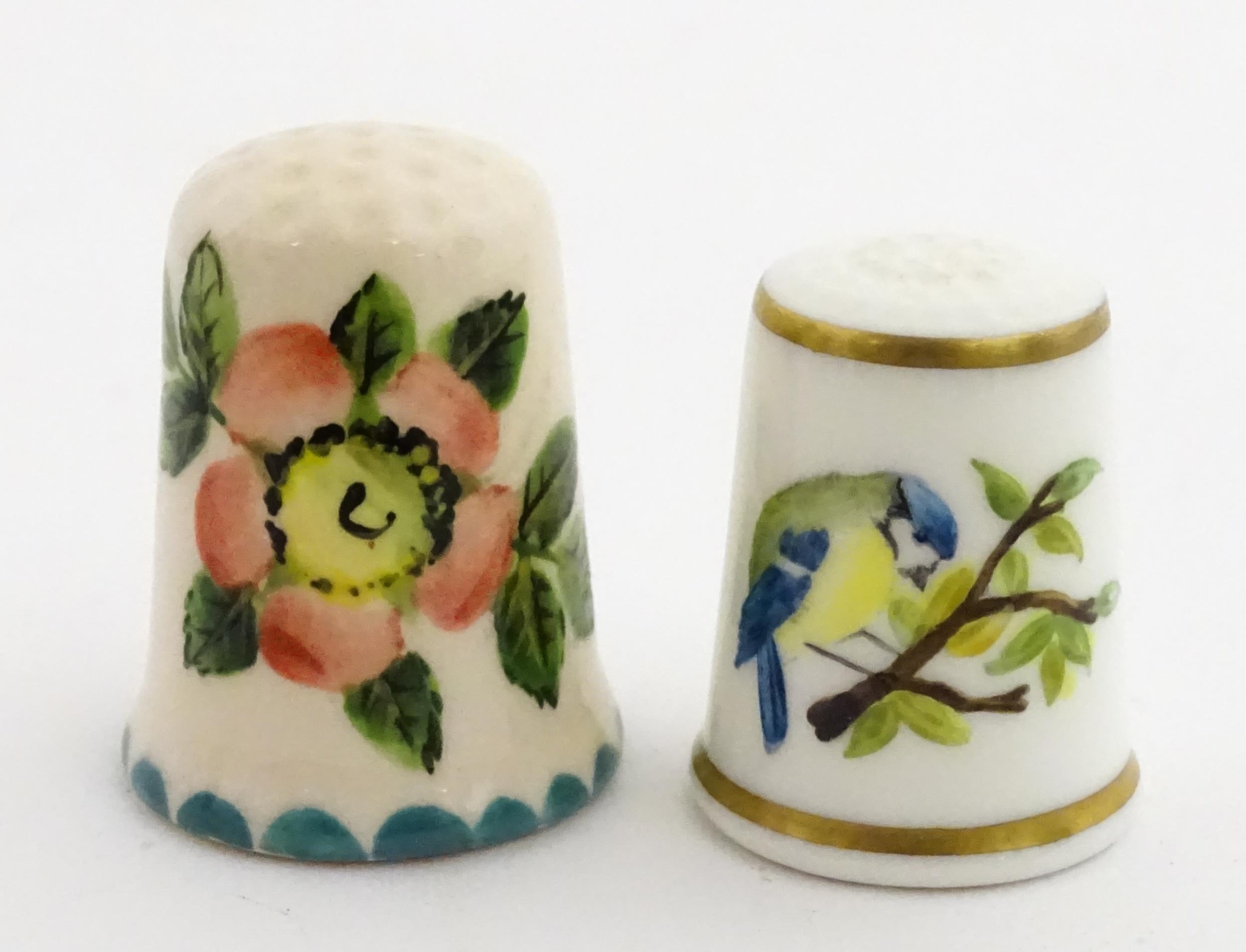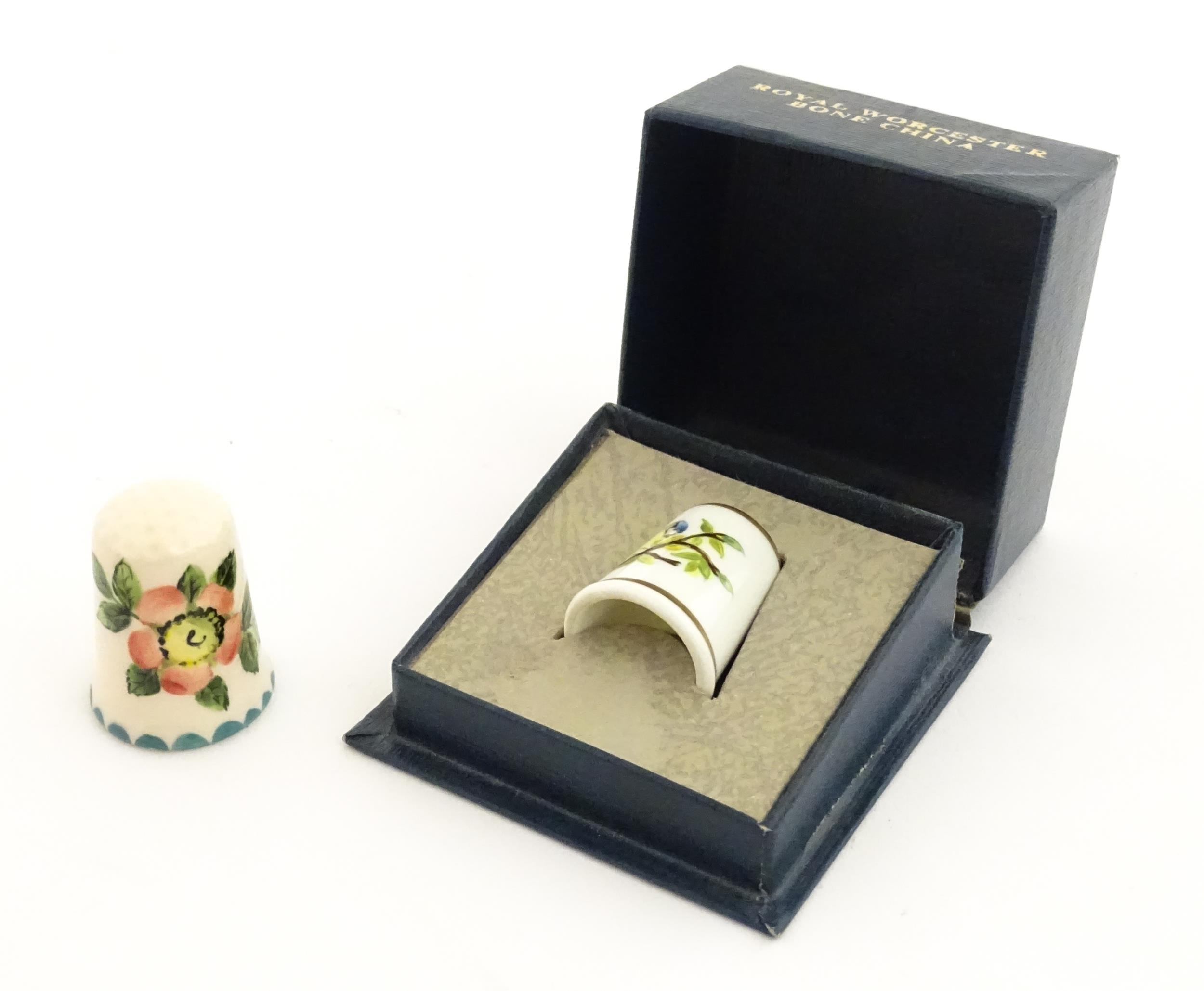 A Wemyss Ware thimble with hand painted flower detail. Together with a boxed Royal Worcester thimble with blue tit detail (2)