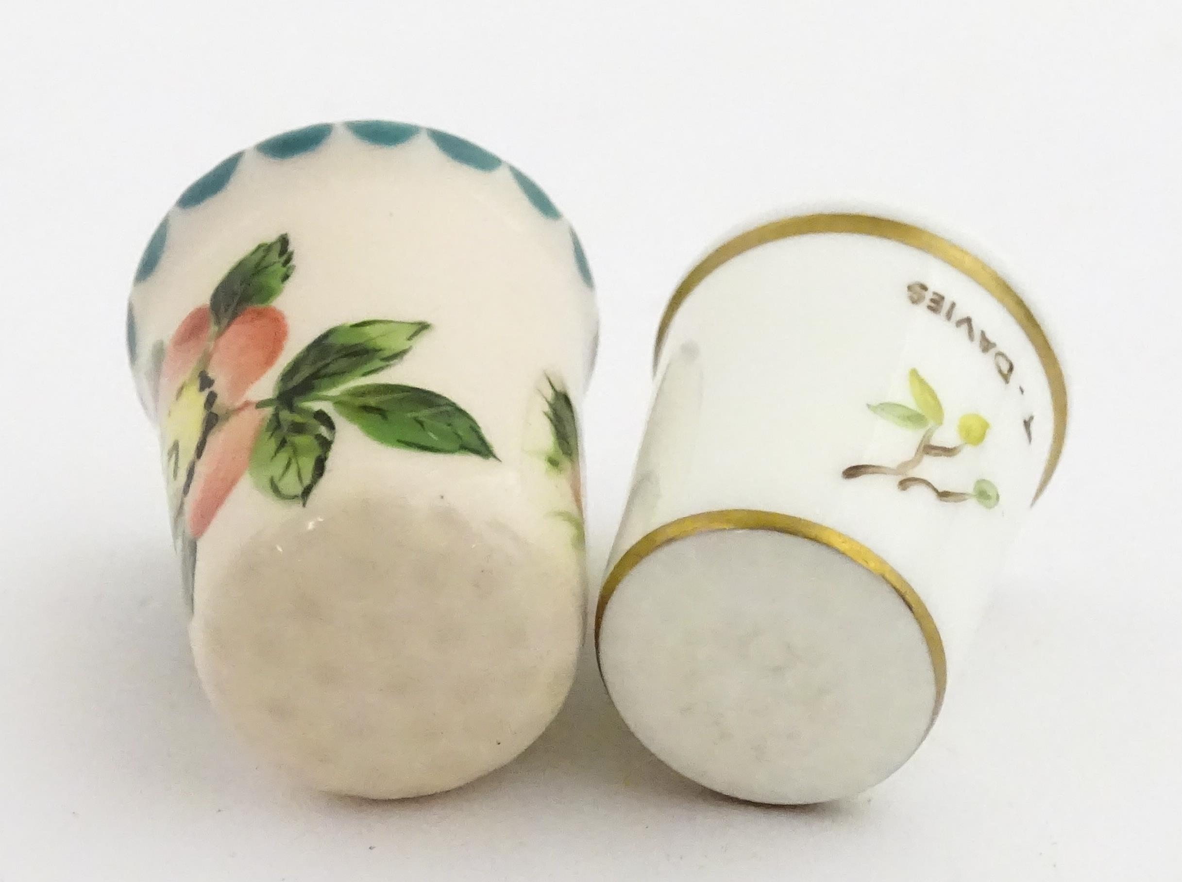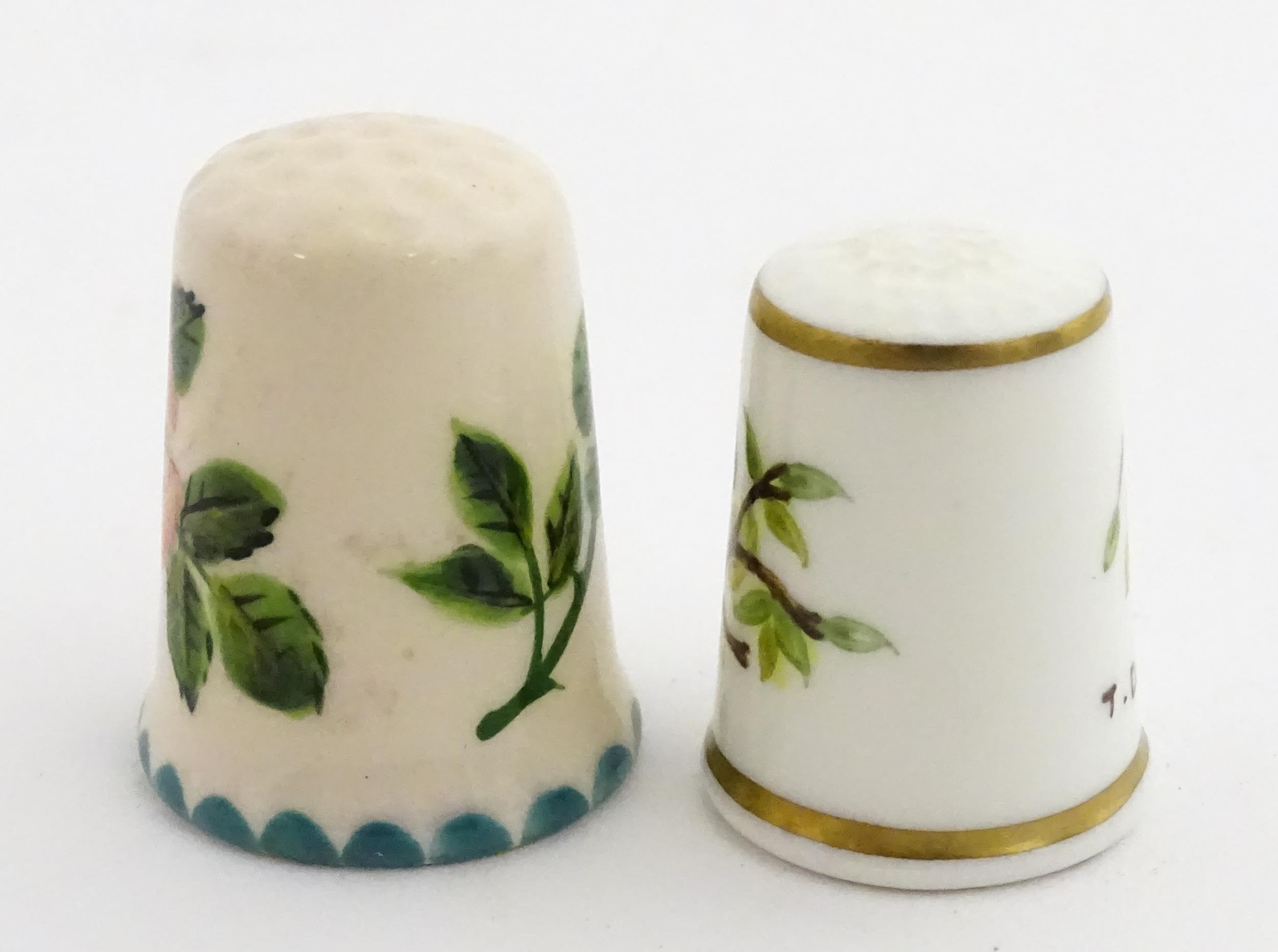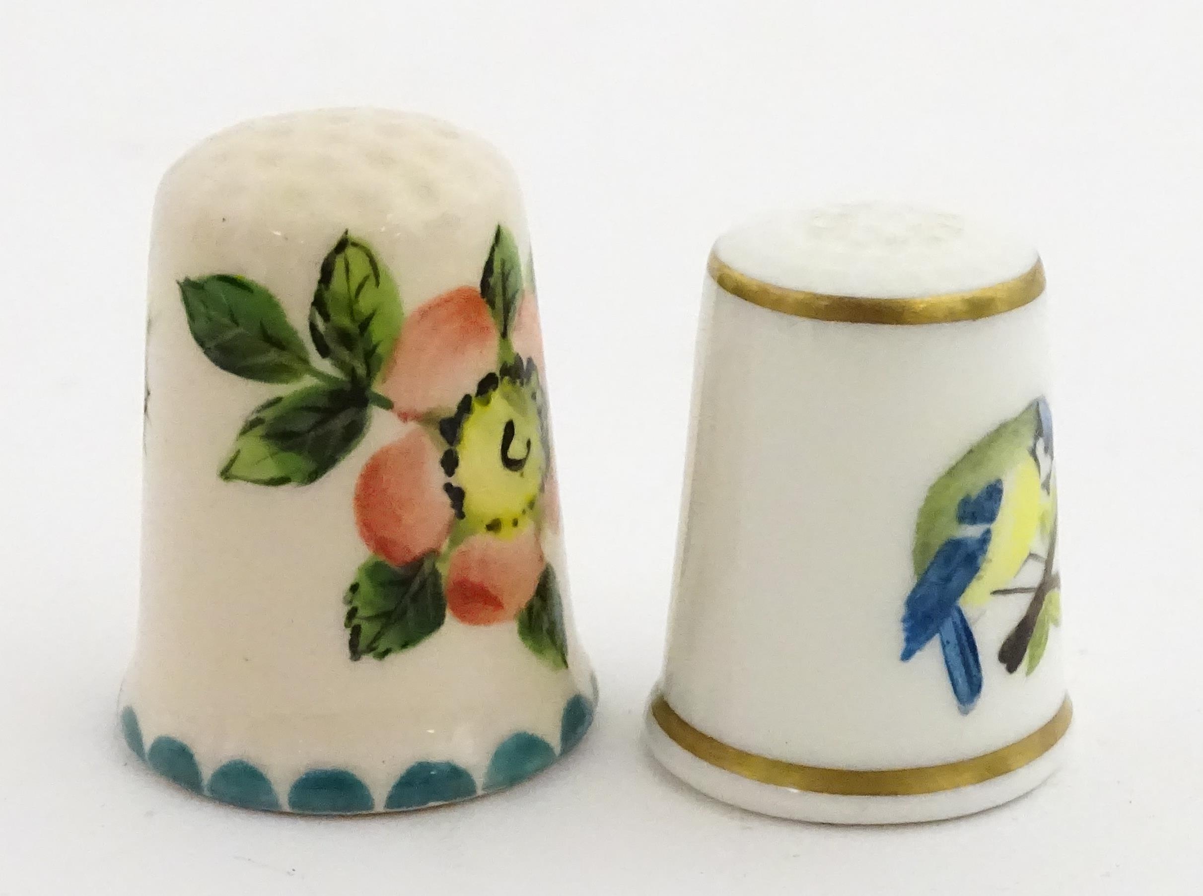A Wemyss Ware thimble with hand painted flower detail. Together with a boxed Royal Worcester thimble with blue tit detail (2)