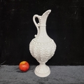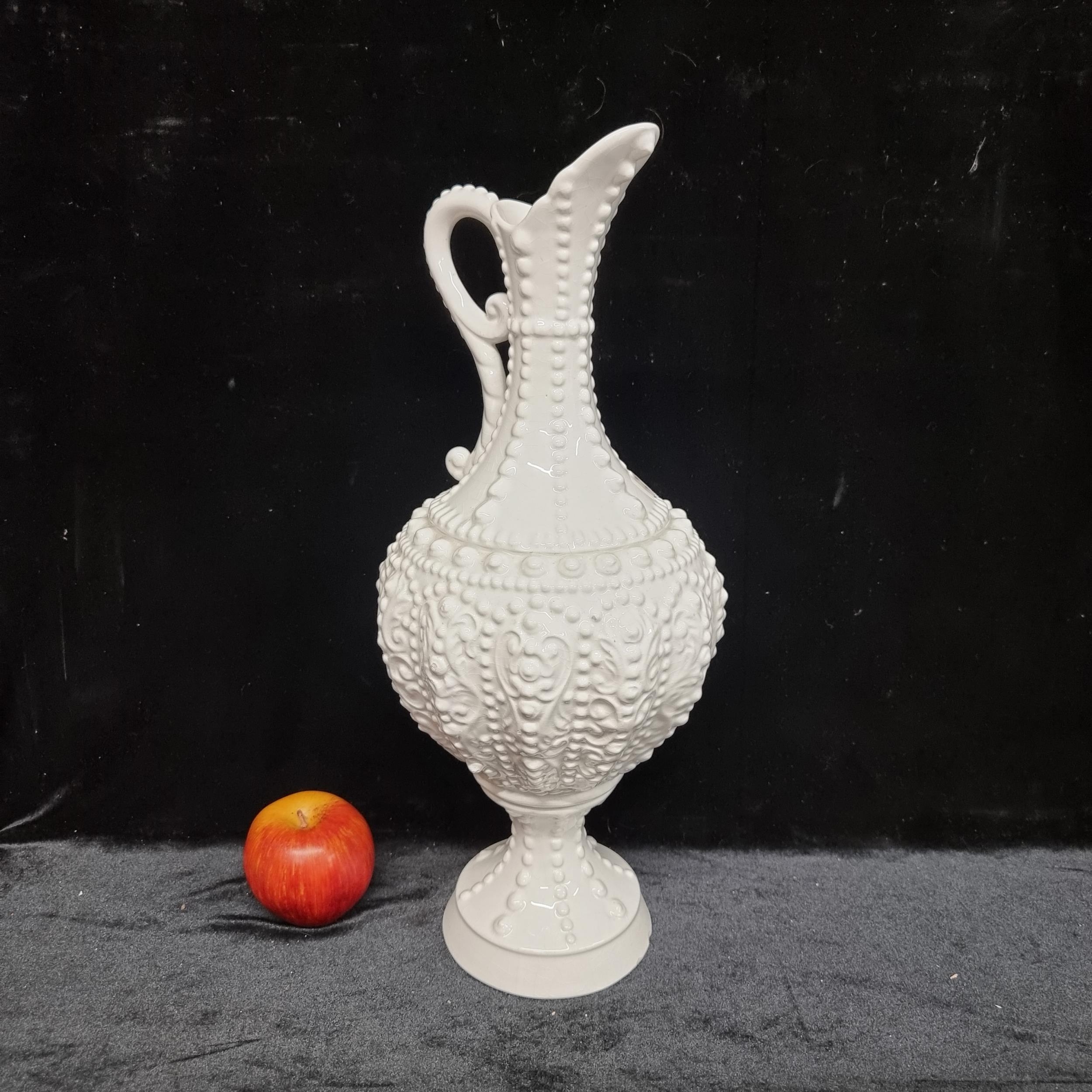 An antique tall ceramic decorative pitcher vase with slim neck and dot and scroll surface texture in relief. Made in Italy, a very elegant statement piece. In very good condition.