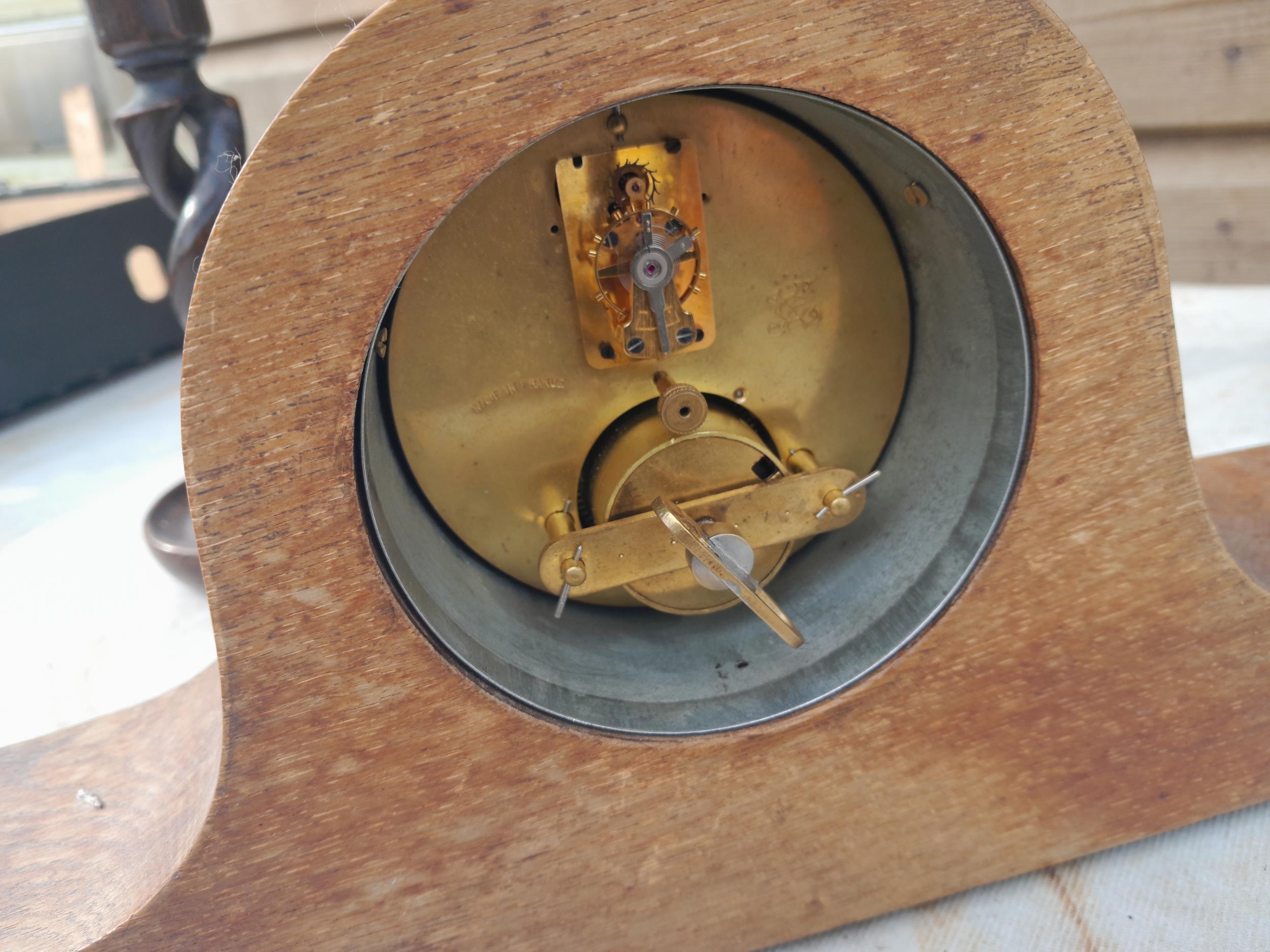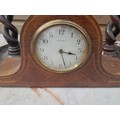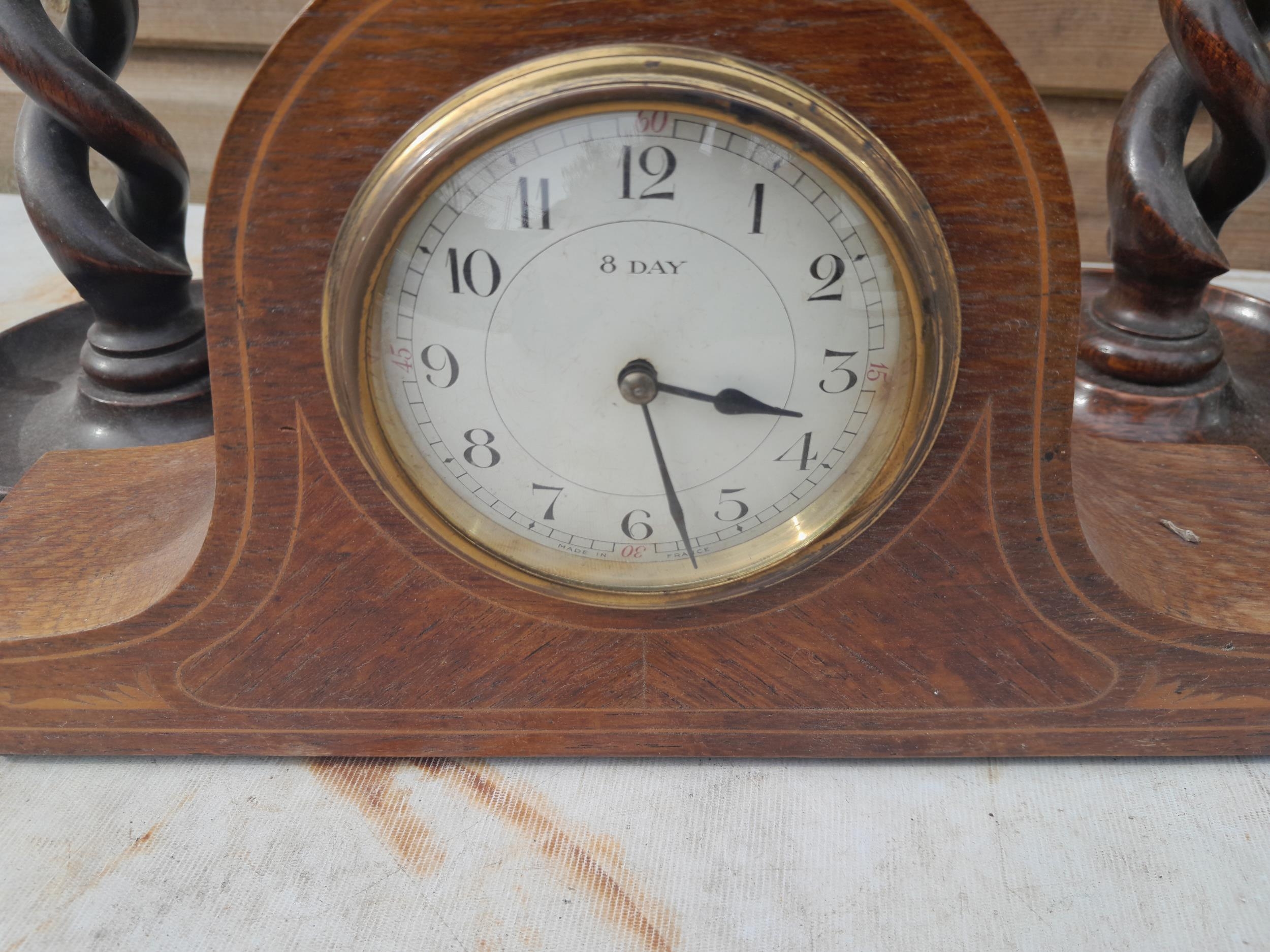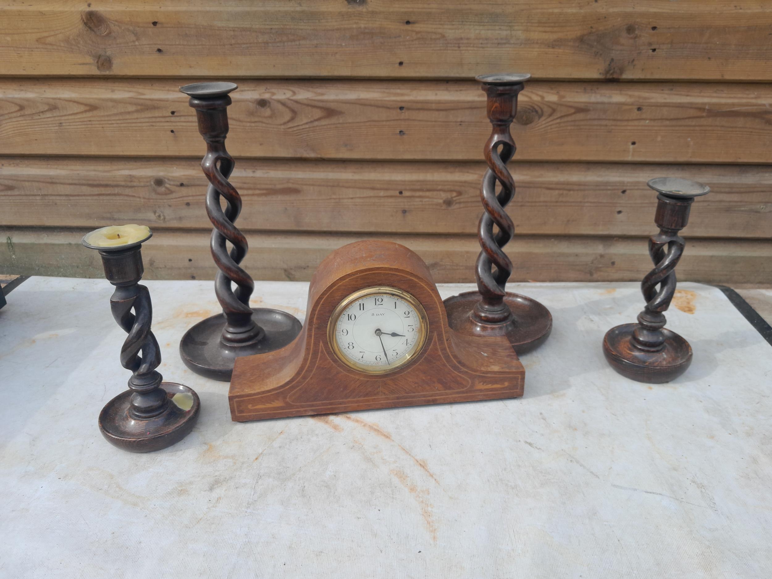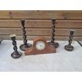 Early 20th century French mahogany case mantle clock, & 2 x pairs of oak barley twist candlesticks