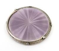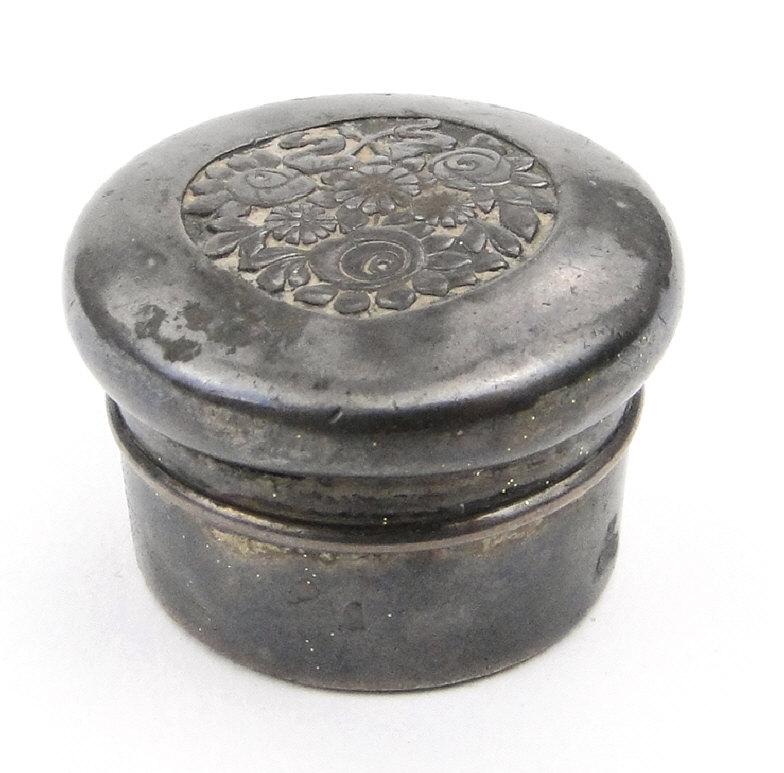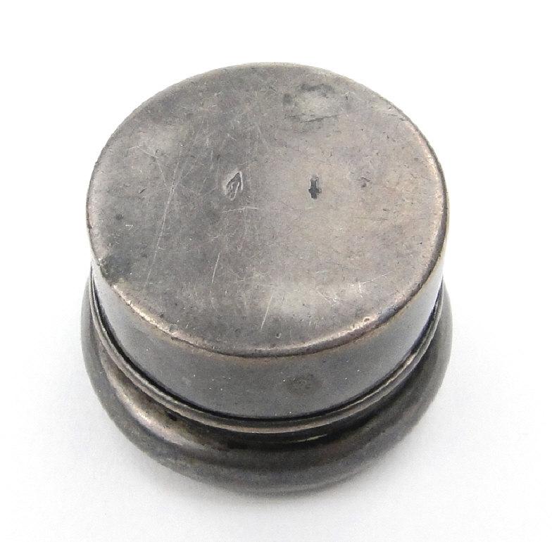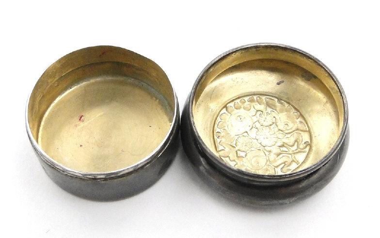 Circular silver coloured metal pill box, the lid embossed with flowers, indistinctly marked to the base, 2.5cm diameter
