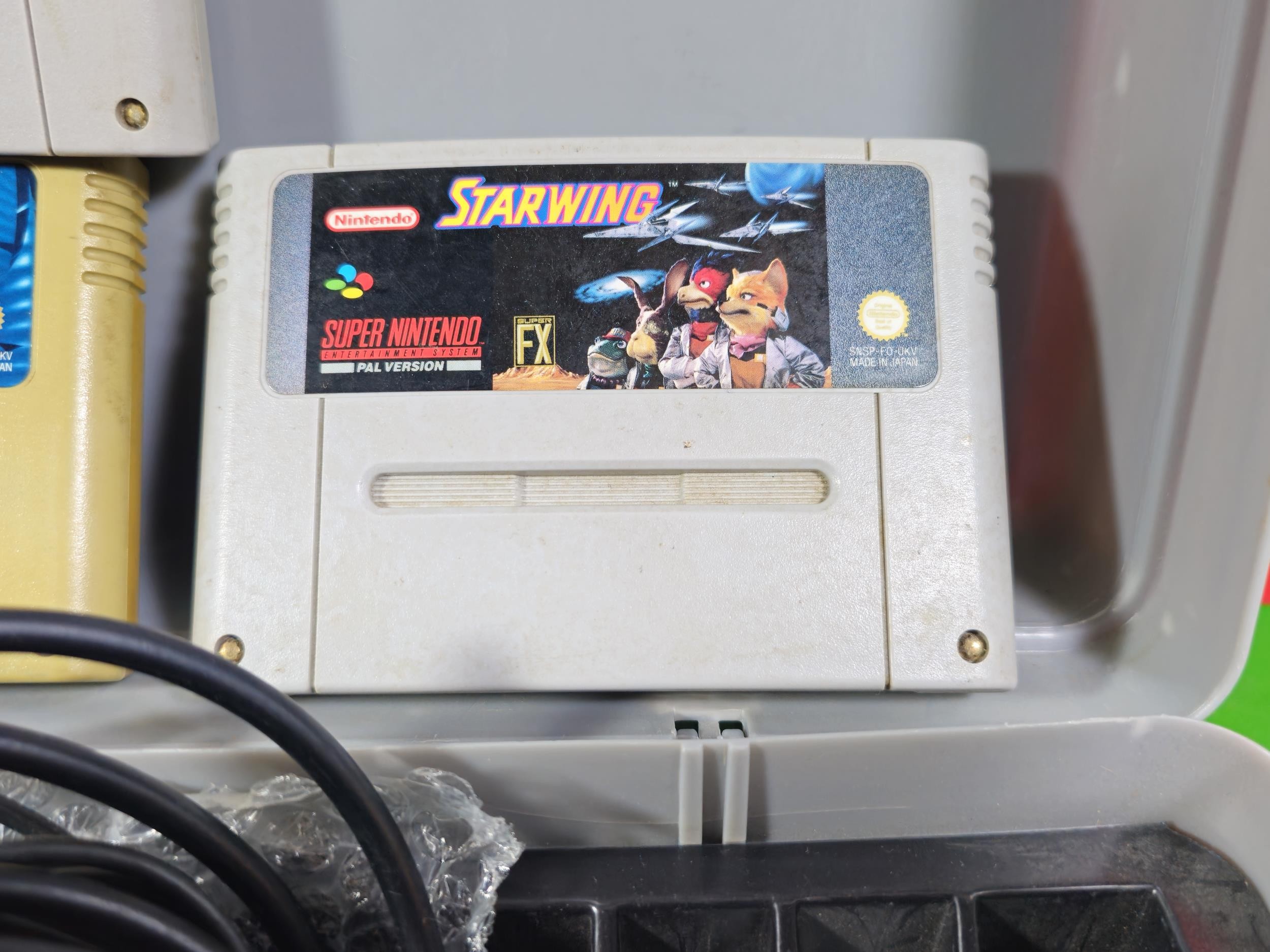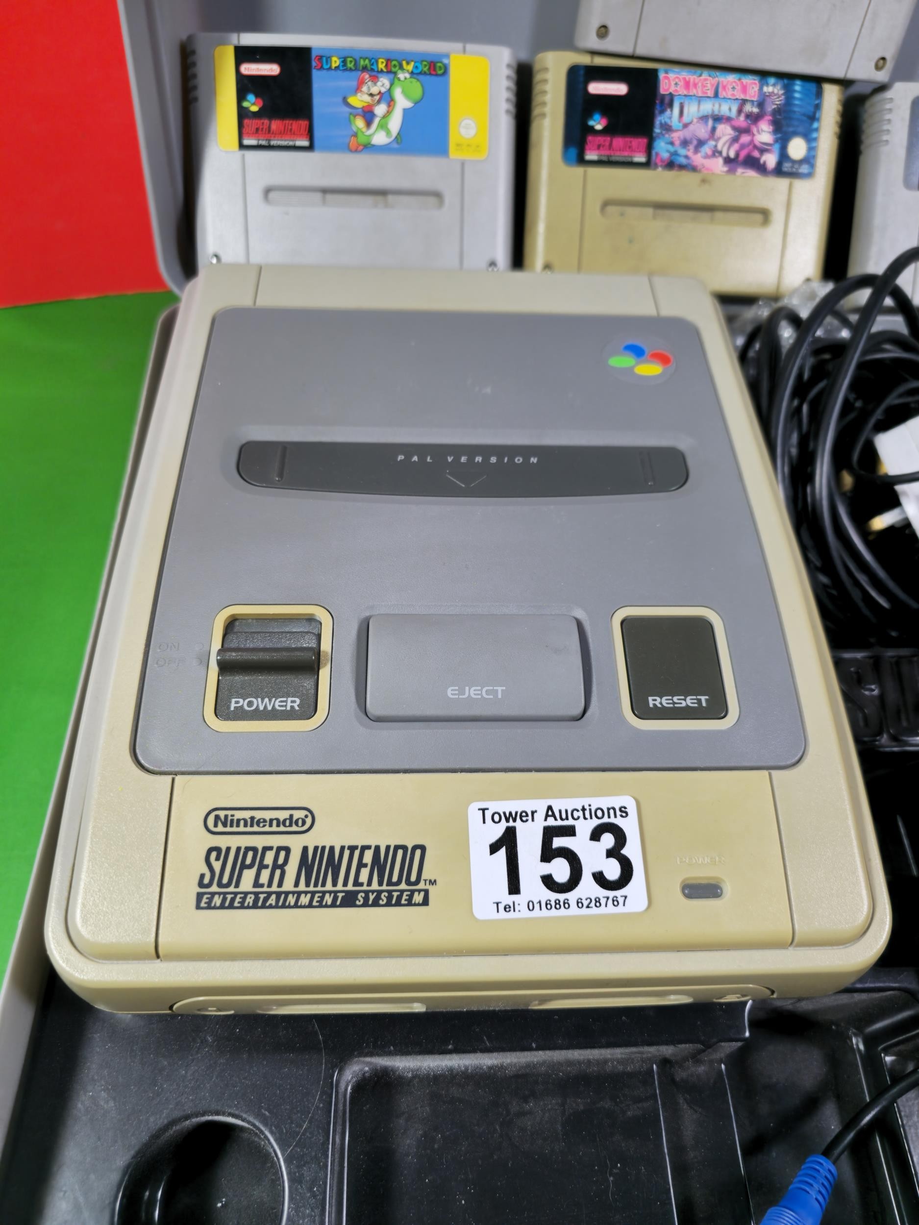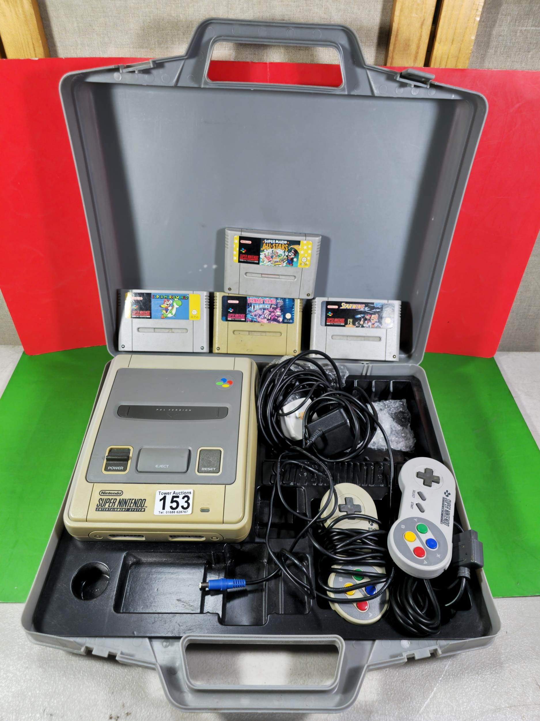 A cased Super Nintendo Entertainment System in a rare Original Nintendo case, model number SNSP-001A (UKV) comes with power cable, controllers and leads along with a collection of 4x games to include Super Mario All Stars, Super Mario World, Starwing and Donkey Kong, In full working order, TV not included in this lot.