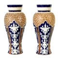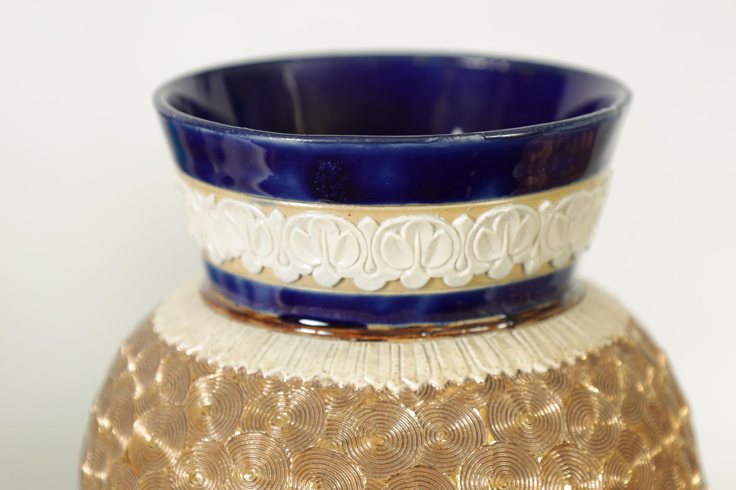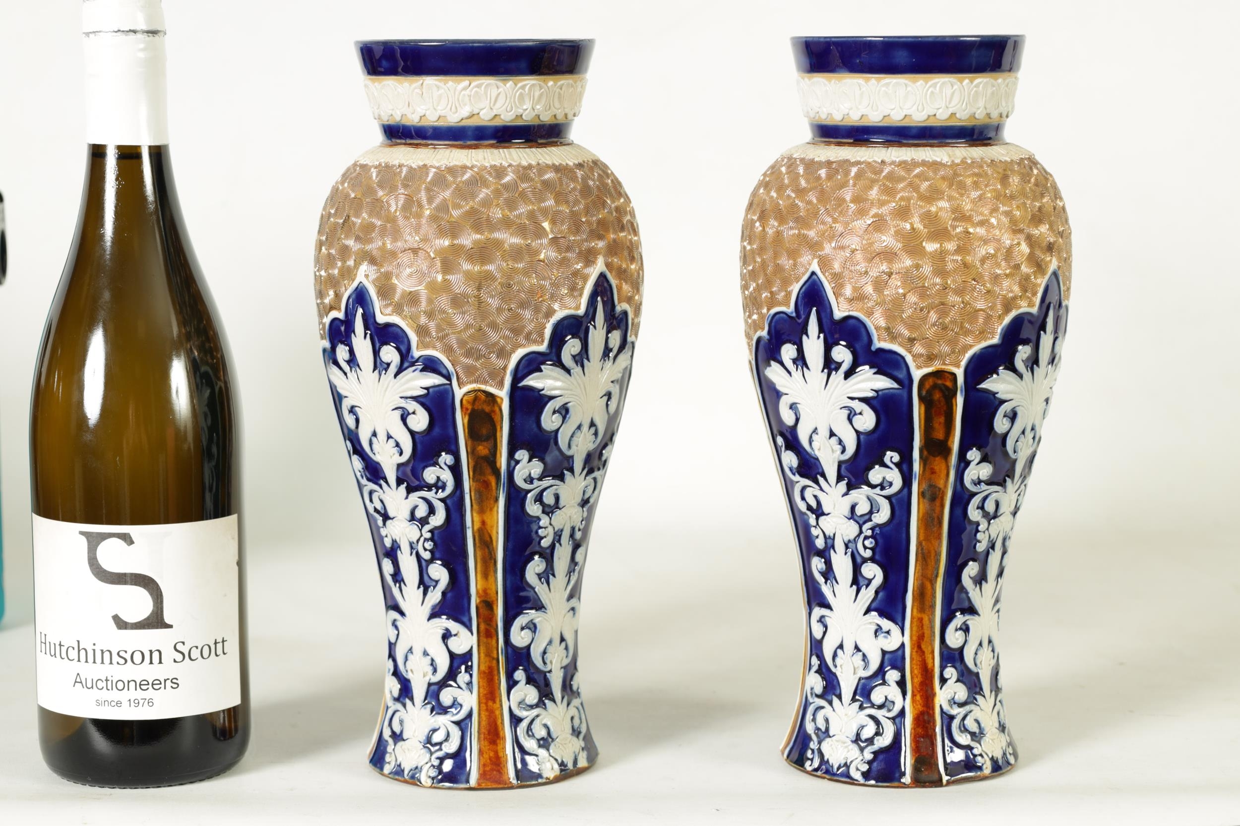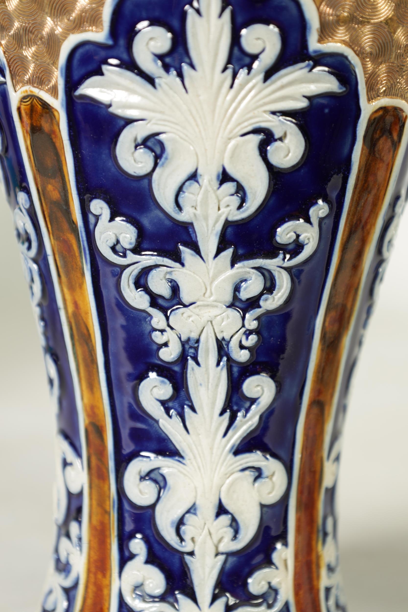 A PAIR OF DOULTON LAMBETH STONEWARE TAPERED SHOULDERED VASES WITH FLARED NECKS decorated with raised floral blue ground panels benath gilt chine decoraed shoulders and raised leafwork neck band - impressed marks beneath. (28cm high)