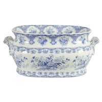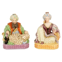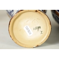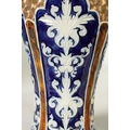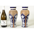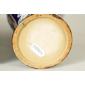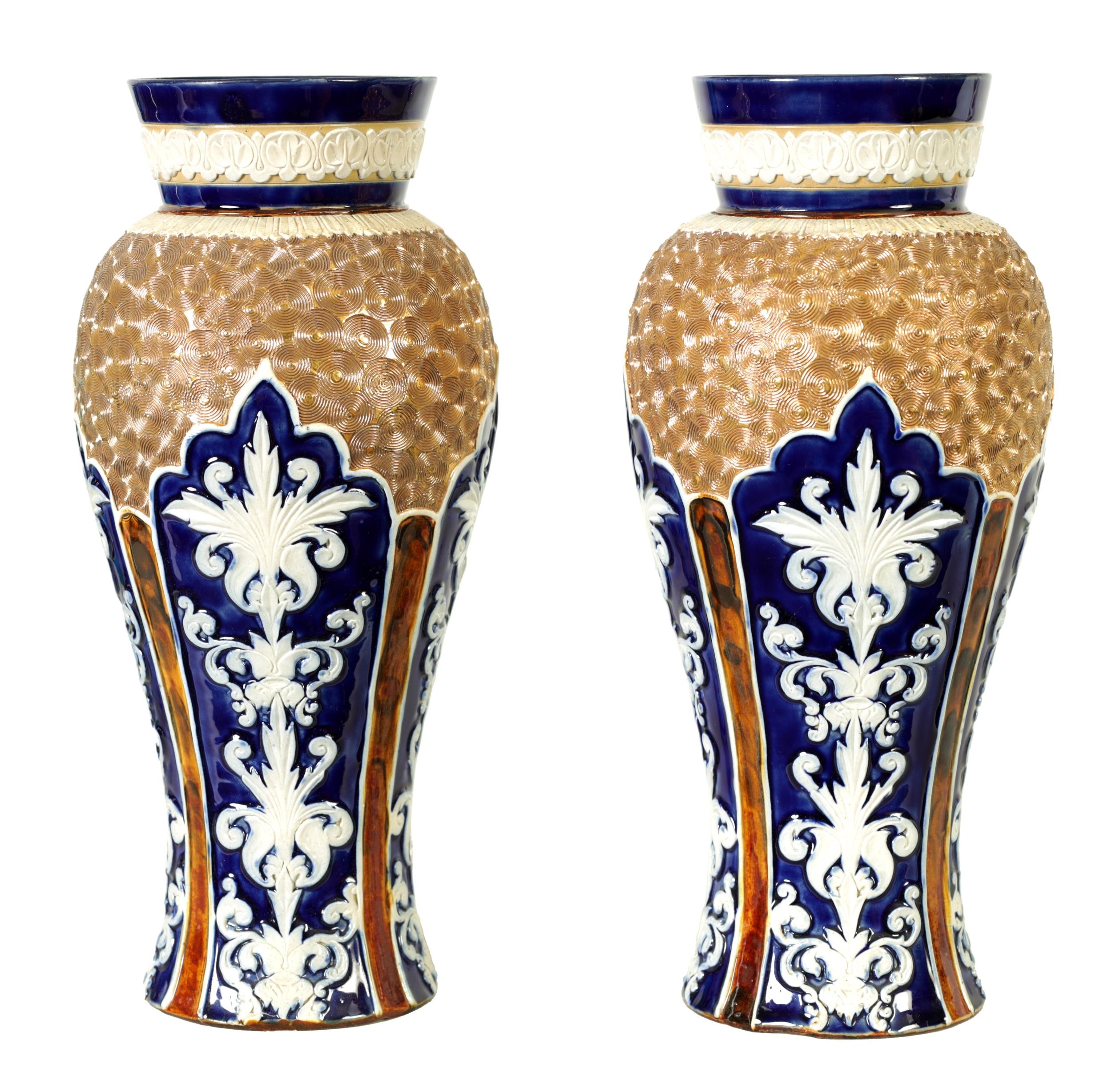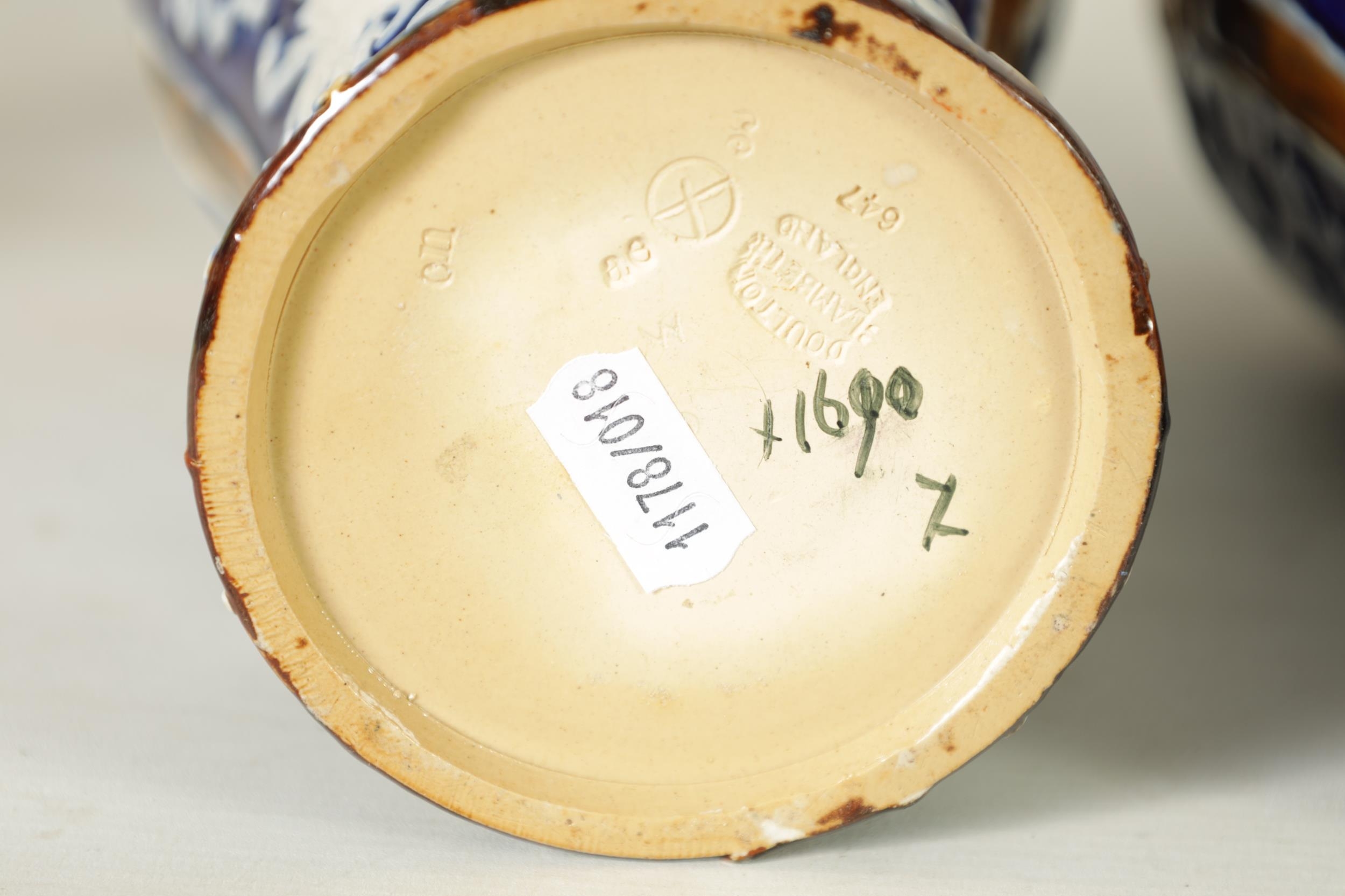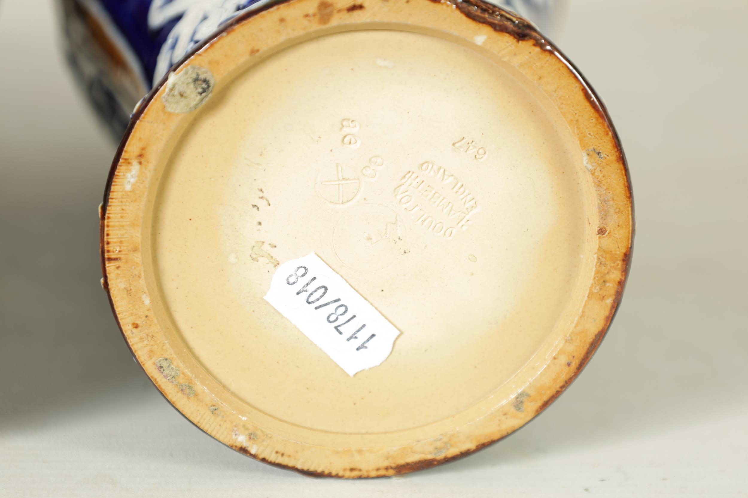 A PAIR OF DOULTON LAMBETH STONEWARE TAPERED SHOULDERED VASES WITH FLARED NECKS decorated with raised floral blue ground panels benath gilt chine decoraed shoulders and raised leafwork neck band - impressed marks beneath. (28cm high)